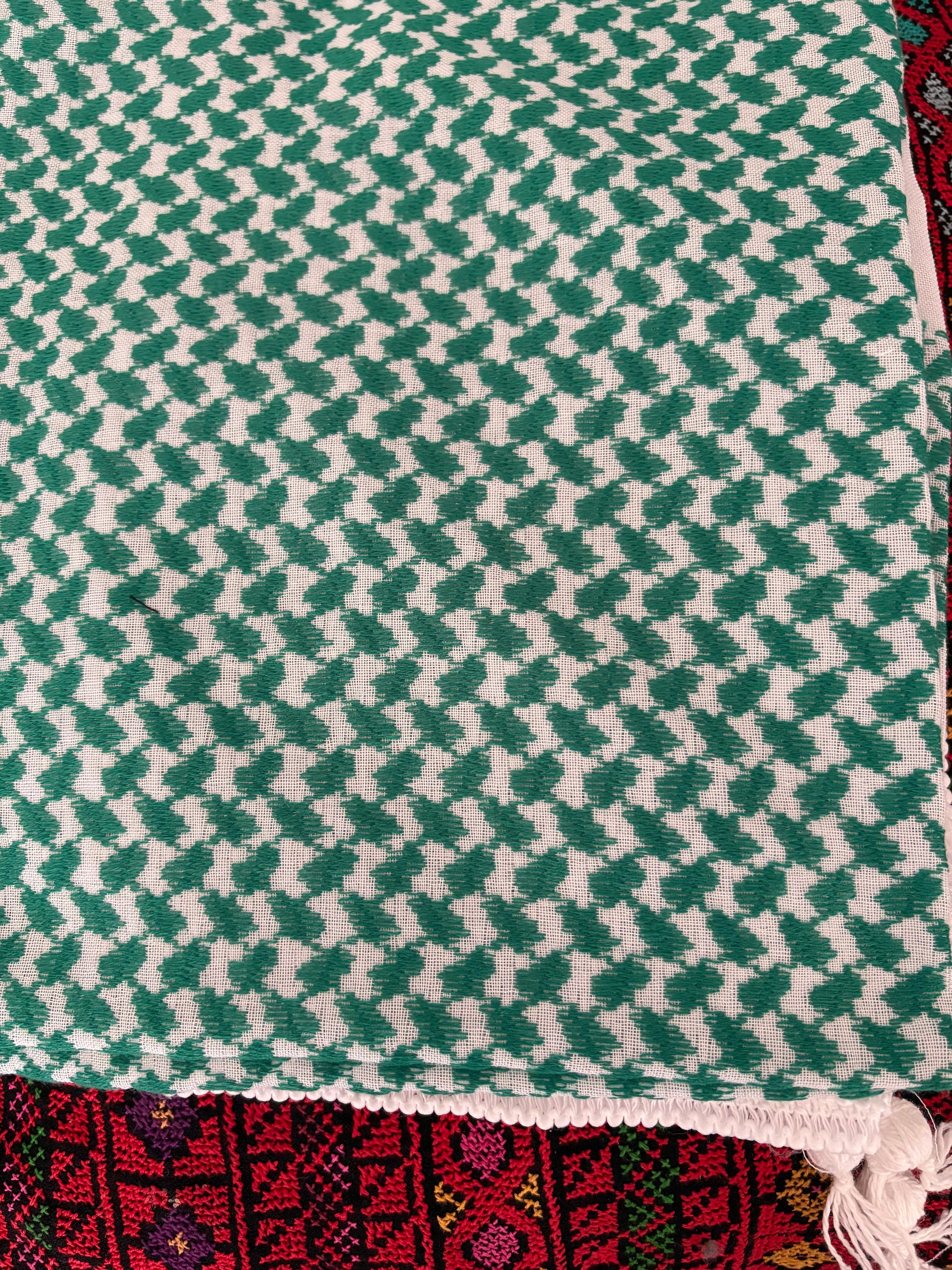 The green and white keffiyeh is a traditional Middle Eastern headscarf. It features a checkered pattern and is traditionally worn for protection against the desert climate.