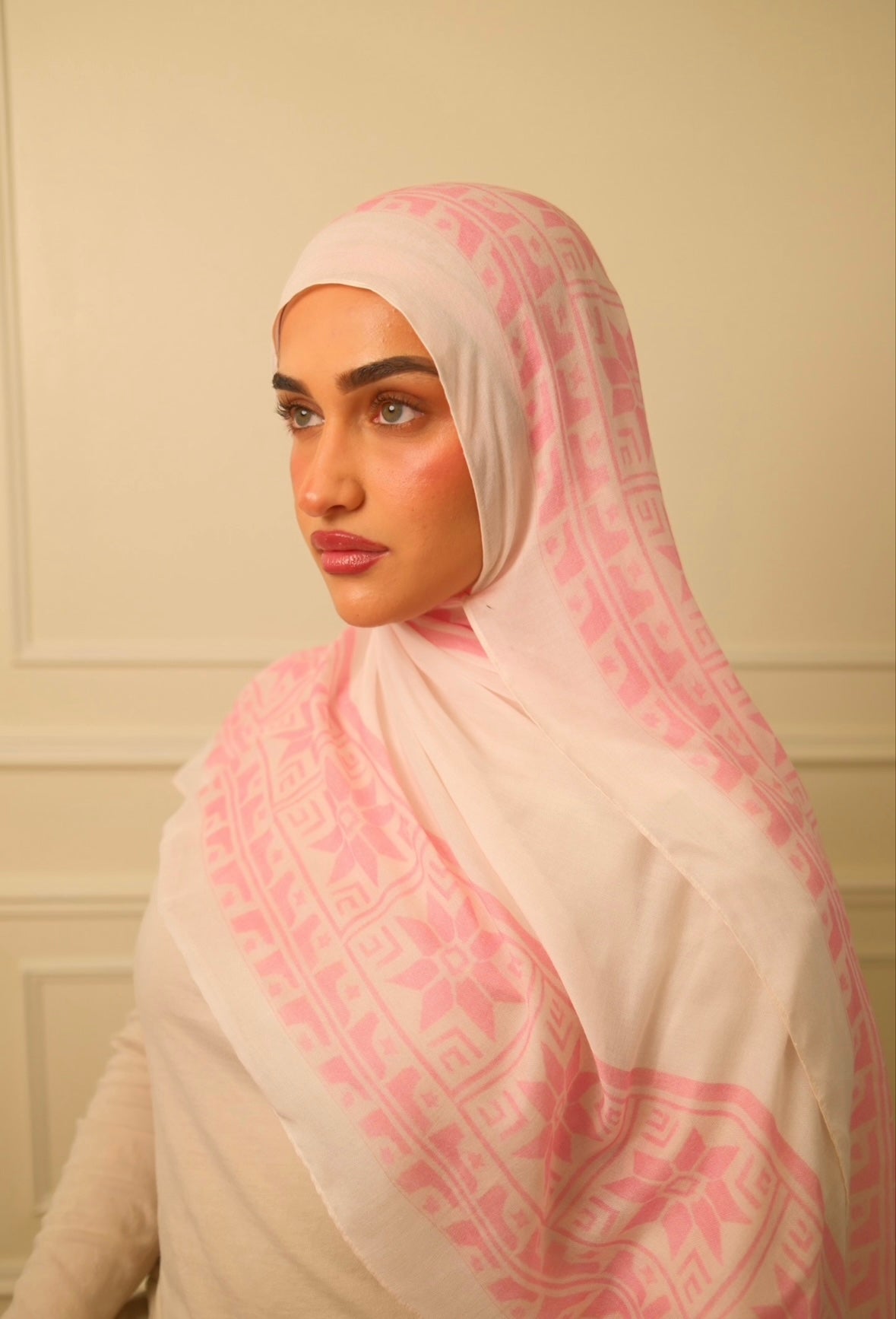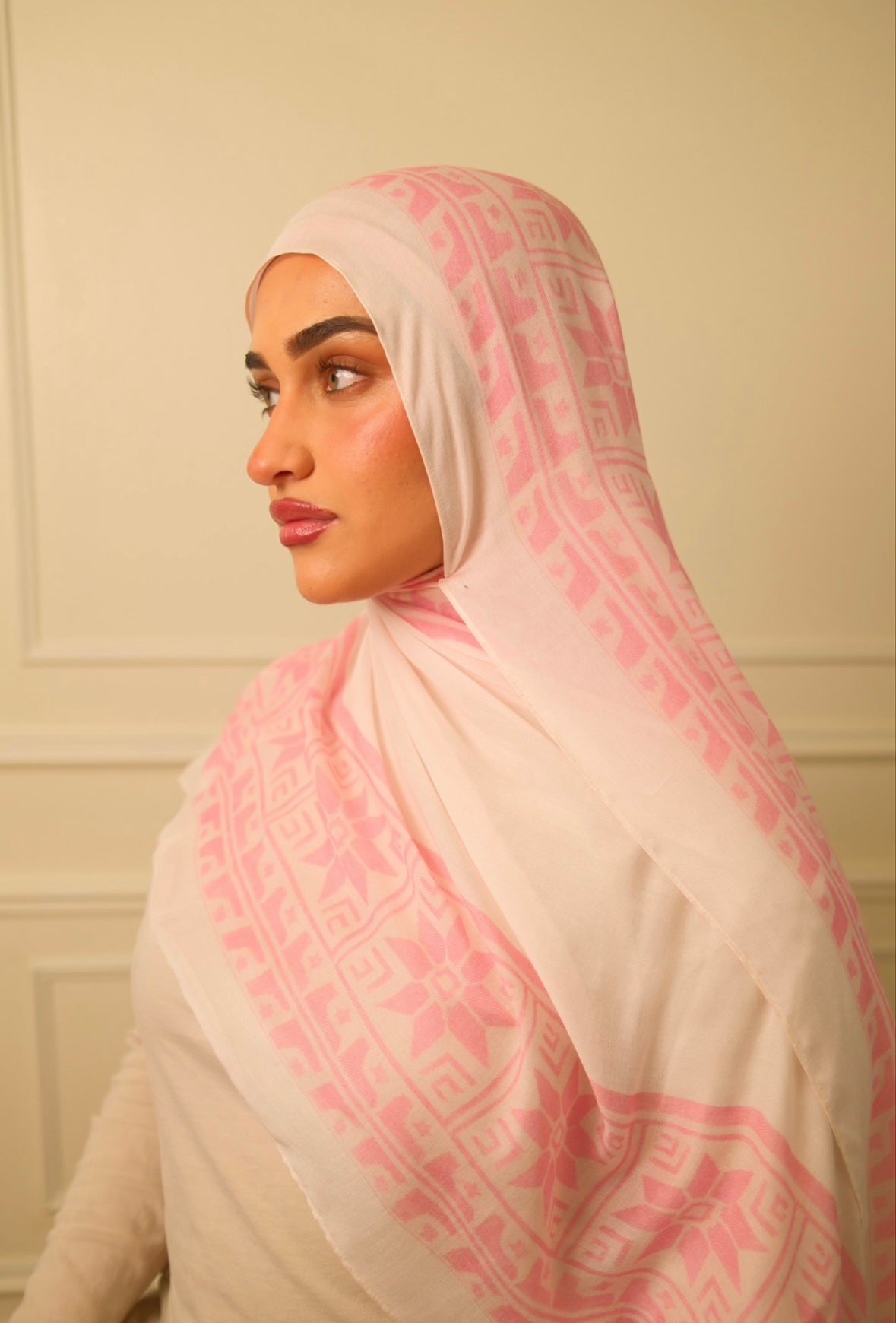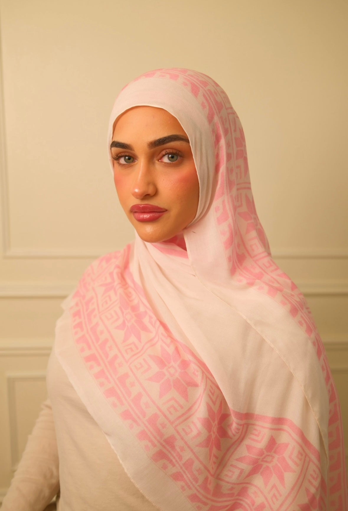 Elevate your wardrobe with this beautifully crafted soft pink modal hijab. designed to embody elegance and femininity. Featuring delicate blush toned tatreez tie dye along the boarder, this piece blends subtle detailing with timeless sophistication.