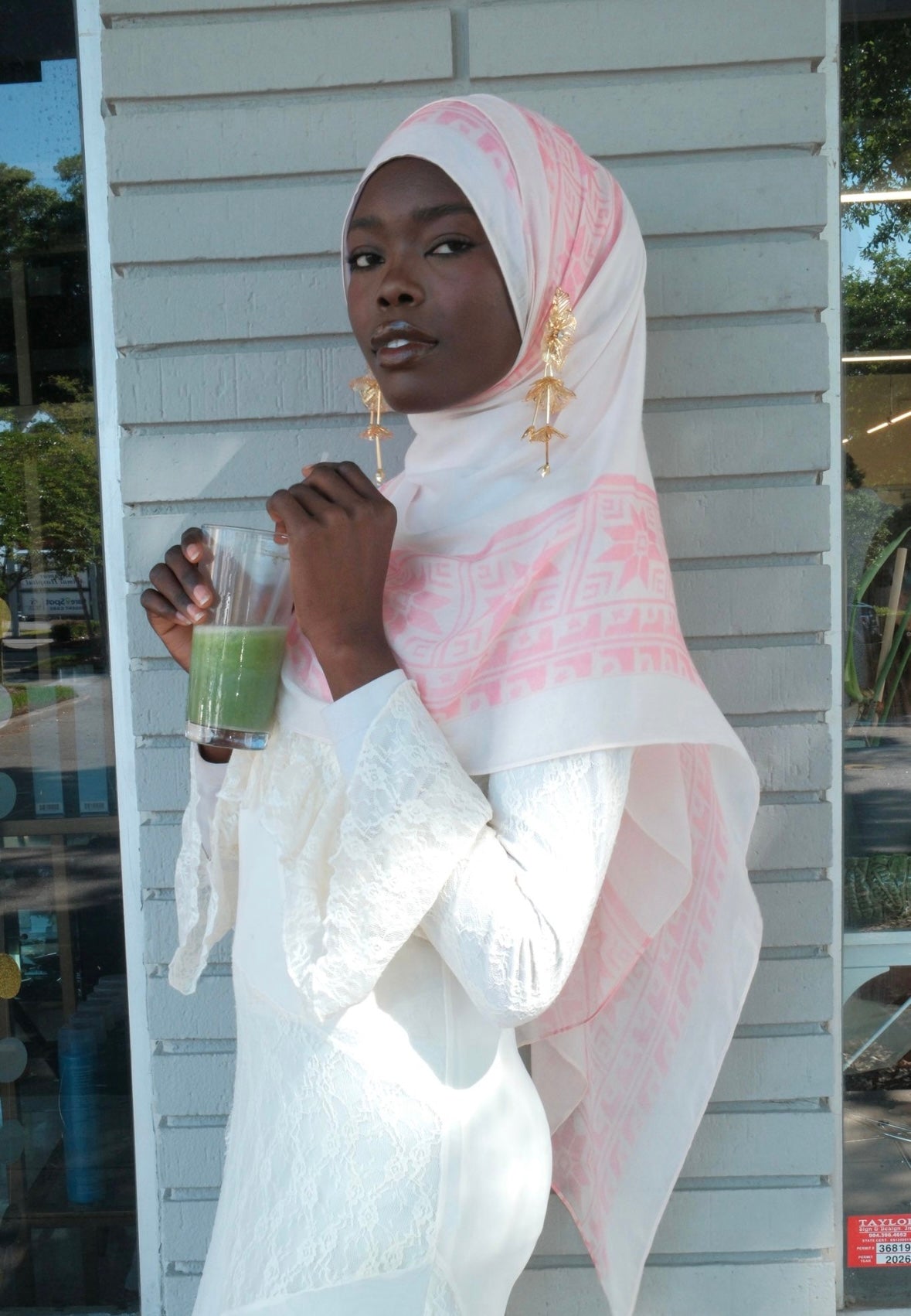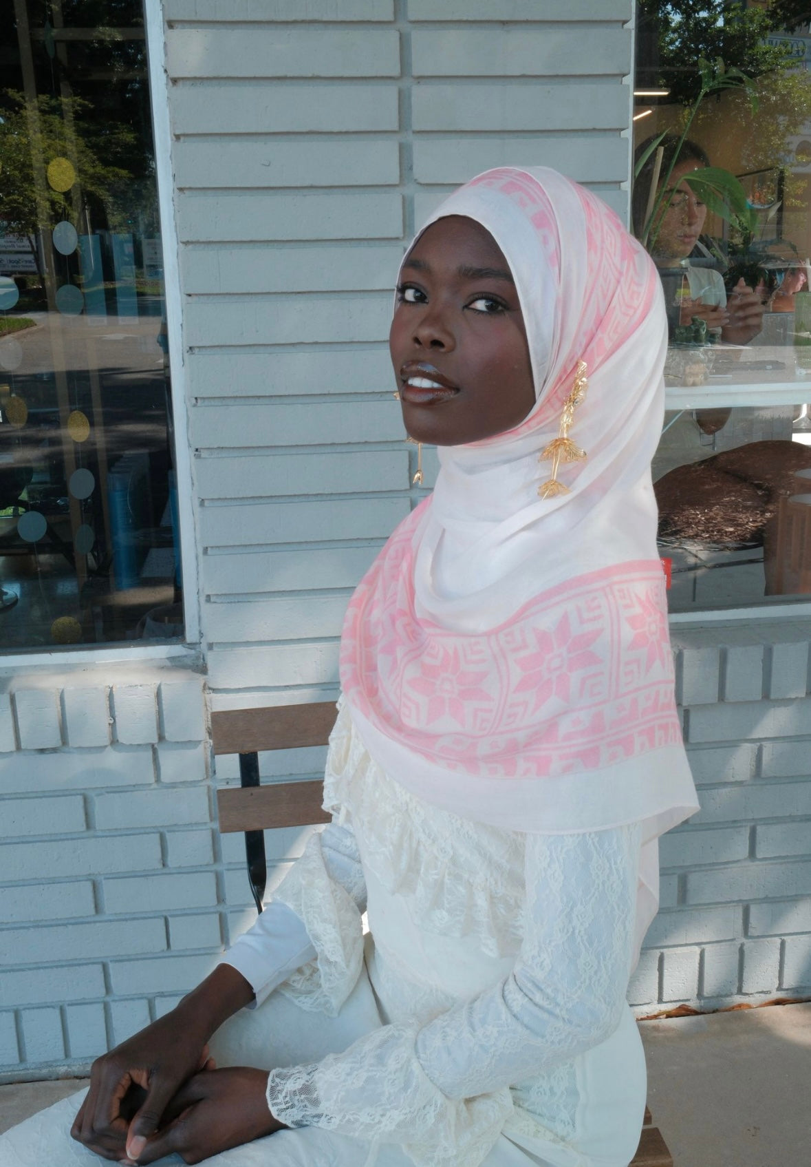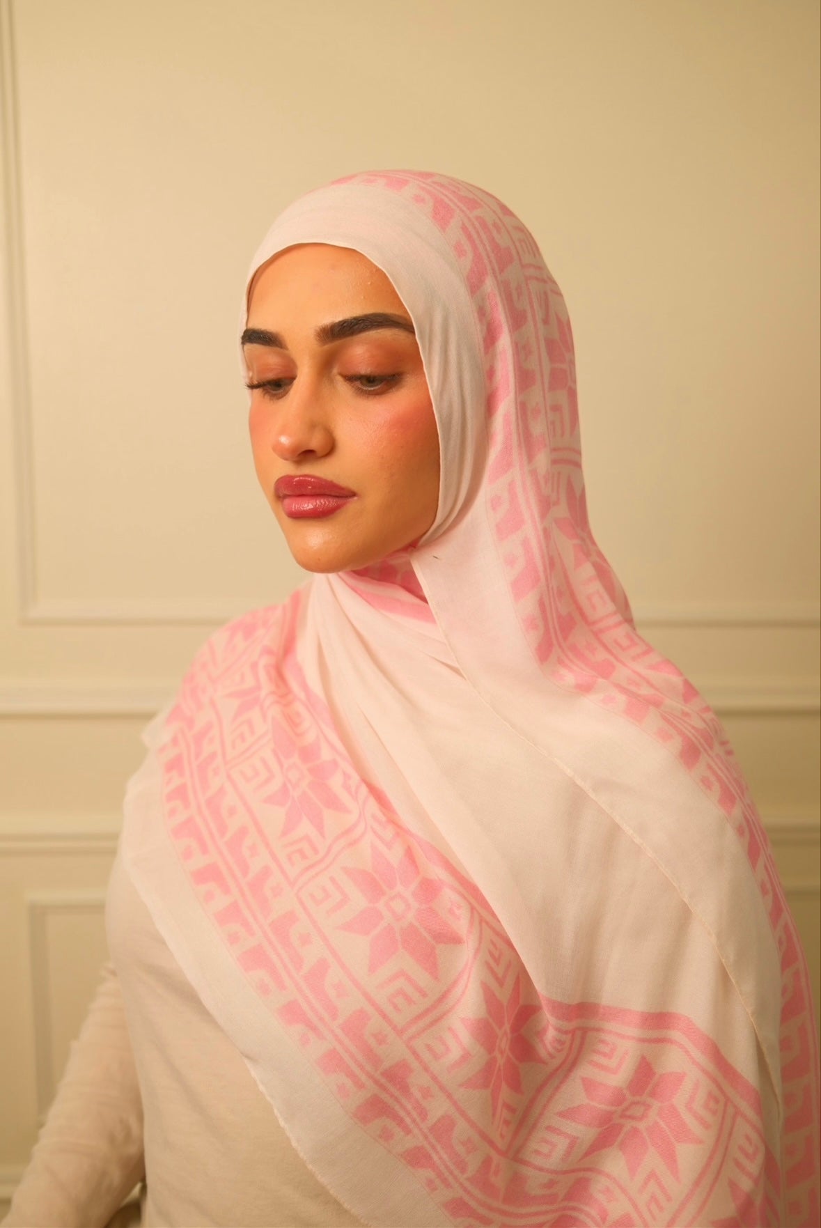 Elevate your wardrobe with this beautifully crafted soft pink modal hijab. designed to embody elegance and femininity. Featuring delicate blush toned tatreez tie dye along the boarder, this piece blends subtle detailing with timeless sophistication.