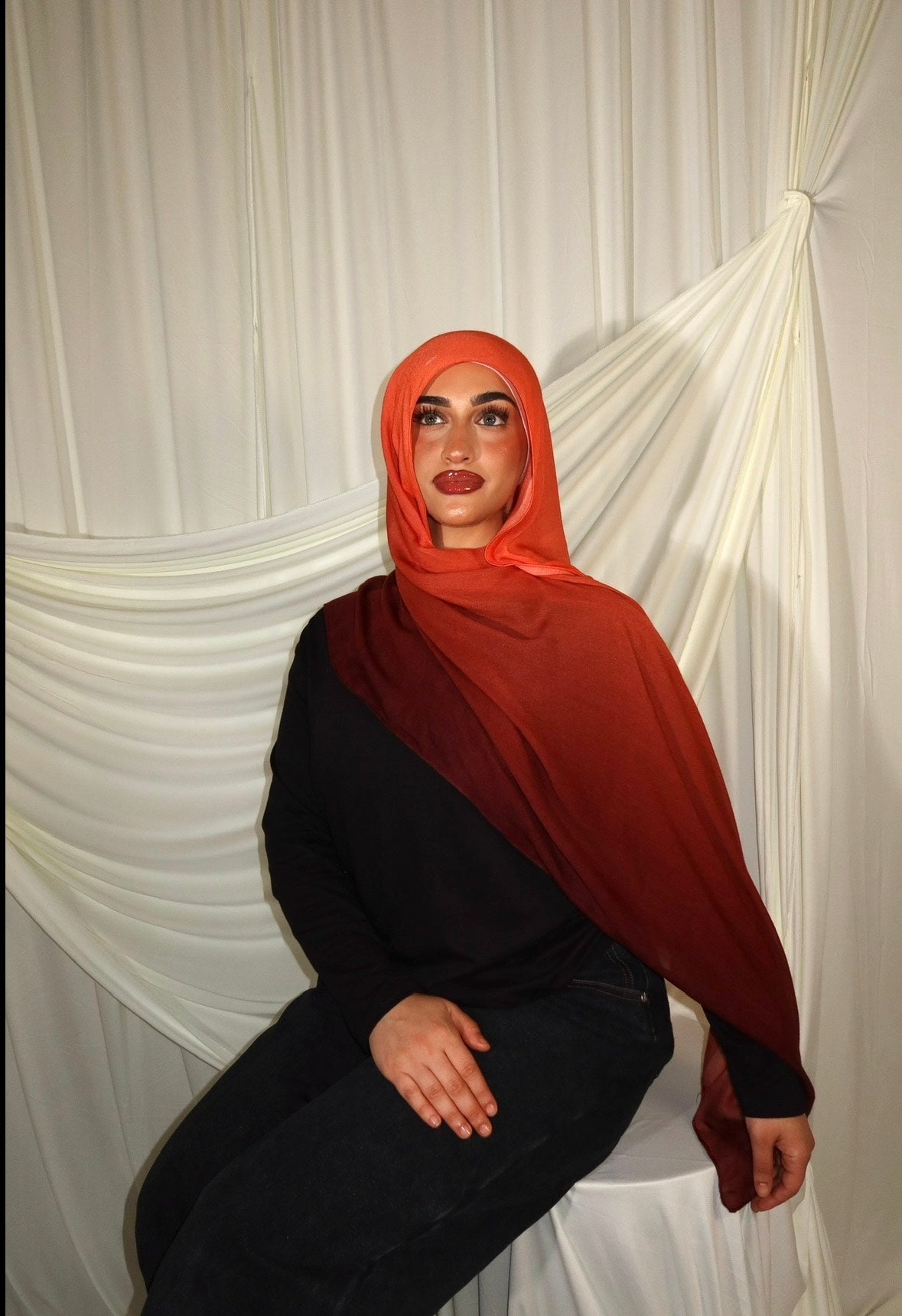 Wrap yourself in elegance and effortless grace with Burnt Orange, our beautifully crafted Ombre hijab in a rich, earthy orange hue - universally flattering shade that enhances every skin tone.