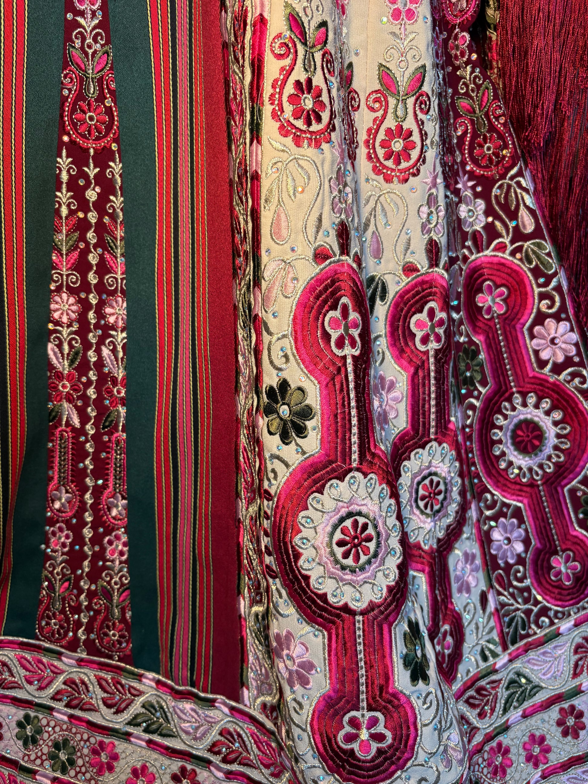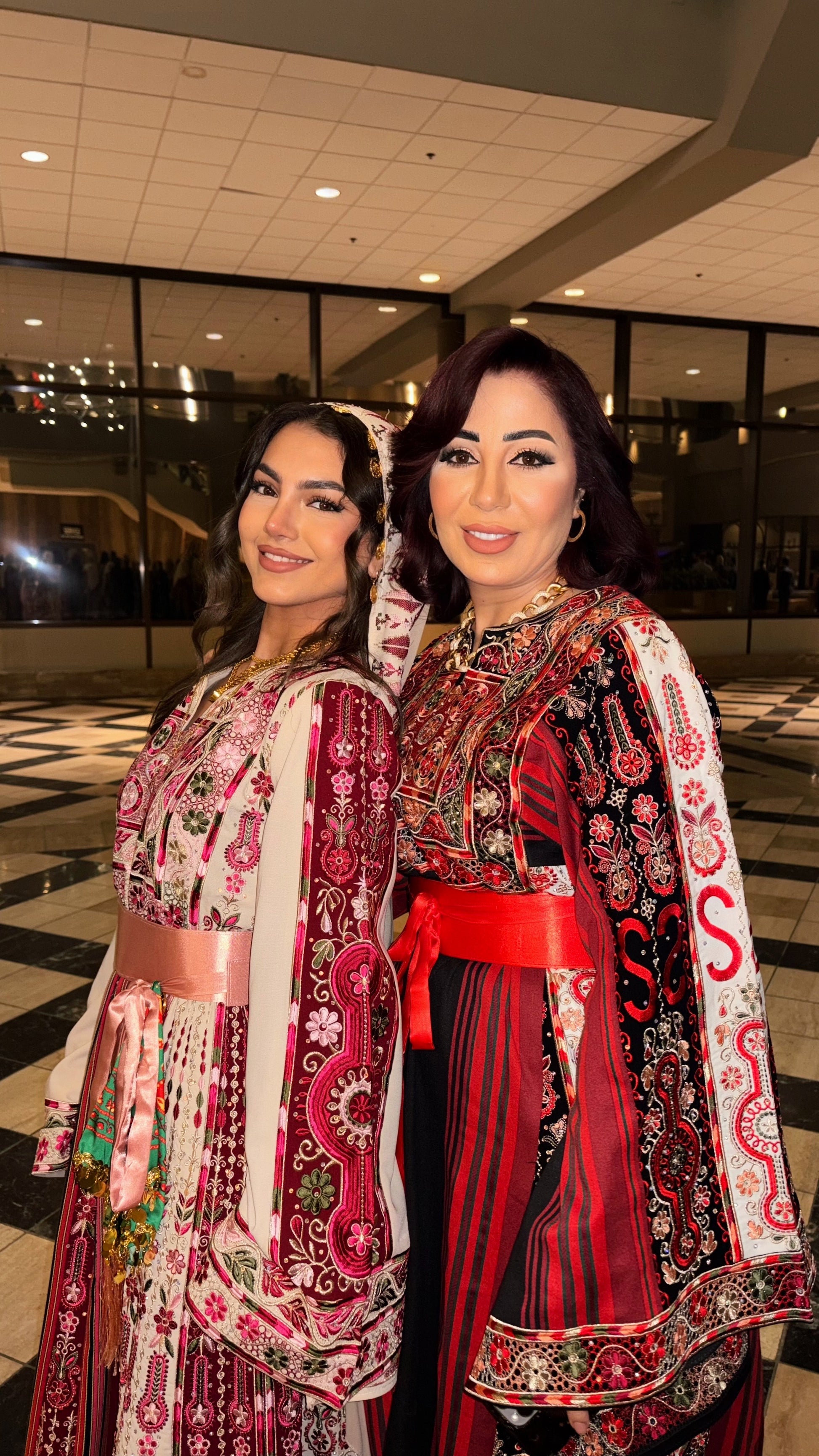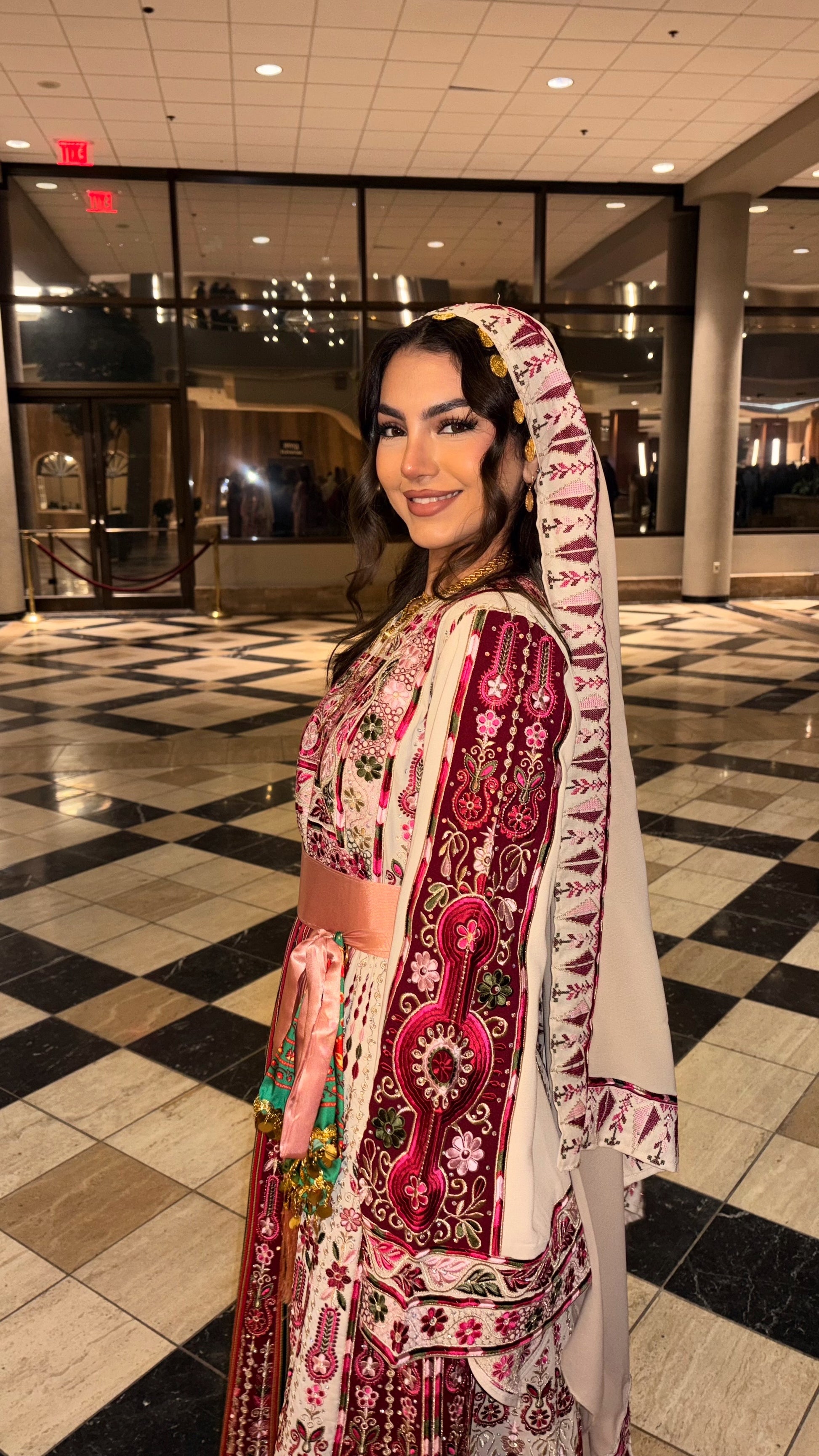 • Embroidered tatreez motifs inspired by ancient Palestinian patterns.