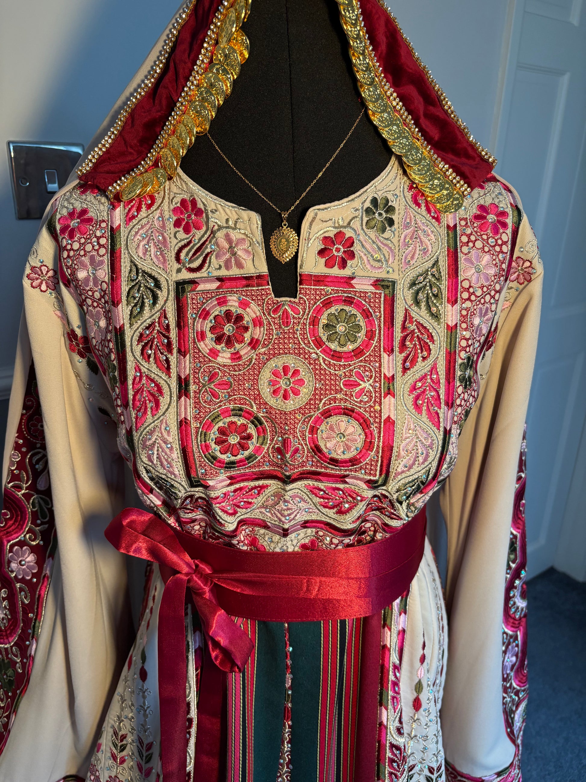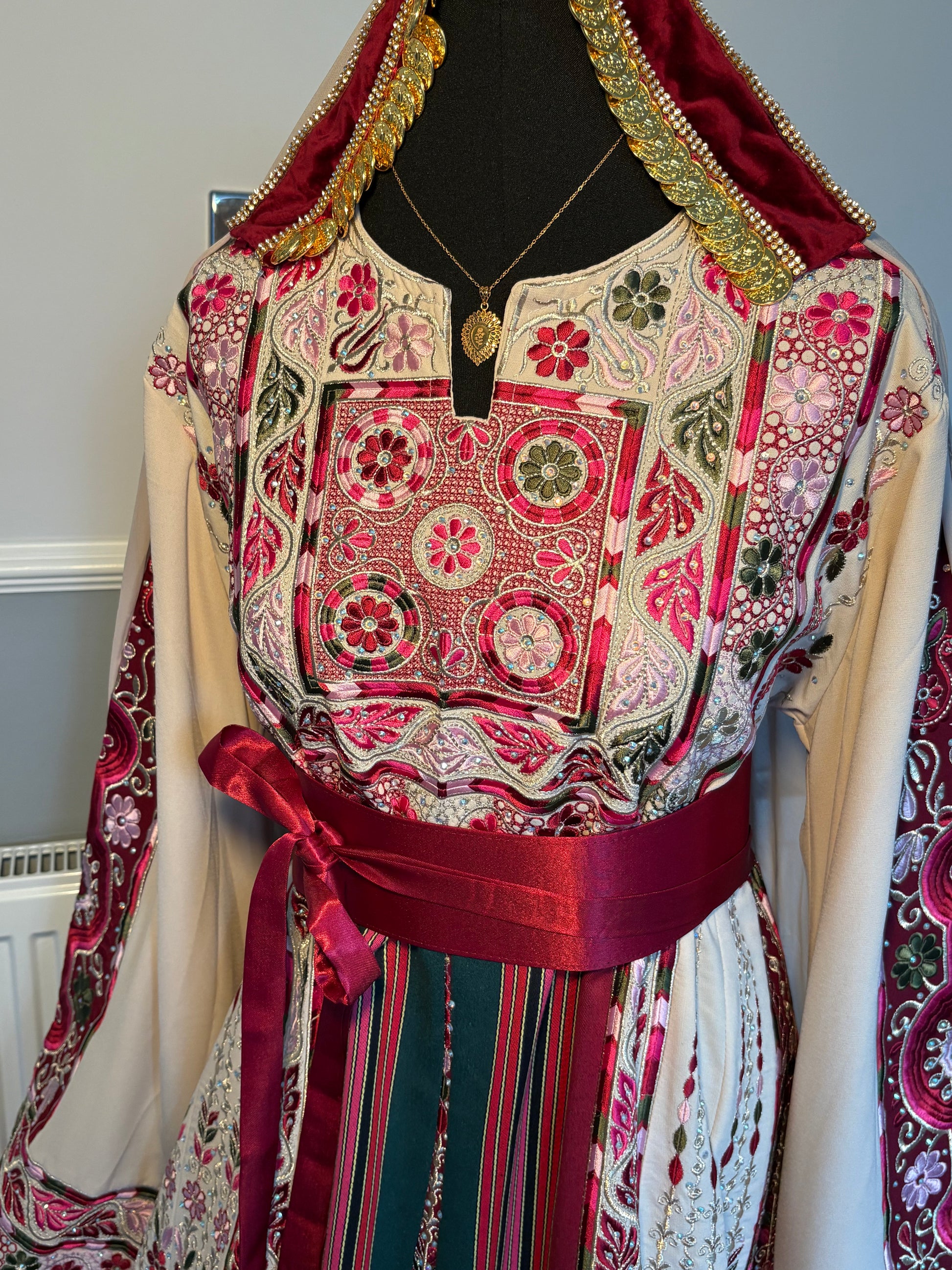 • A beautiful beige thobe with detailed red, light pink, dark pink and green tatreez embroidery