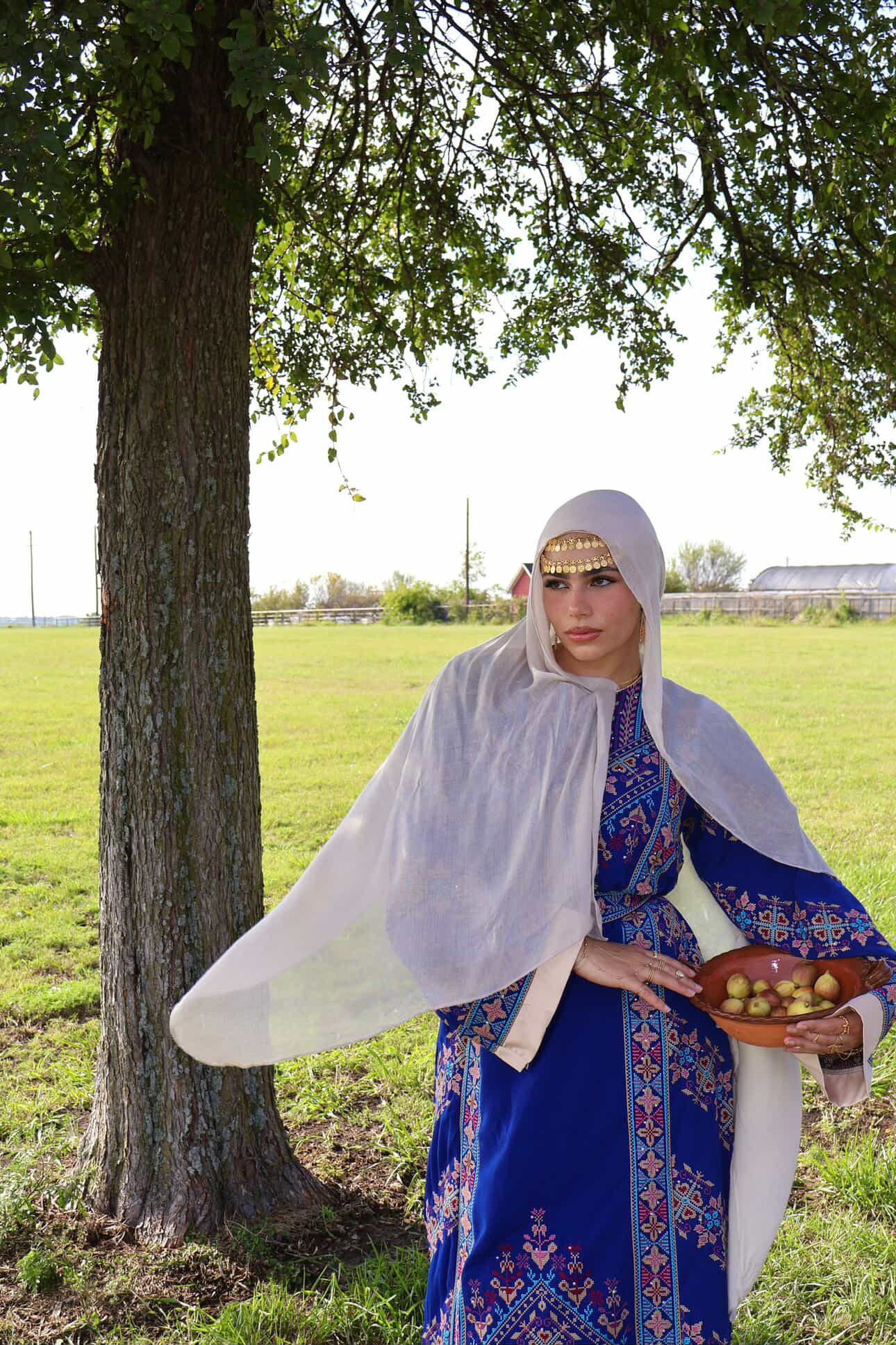 • Embroidered tatreez motifs inspired by ancient Palestinian patterns.