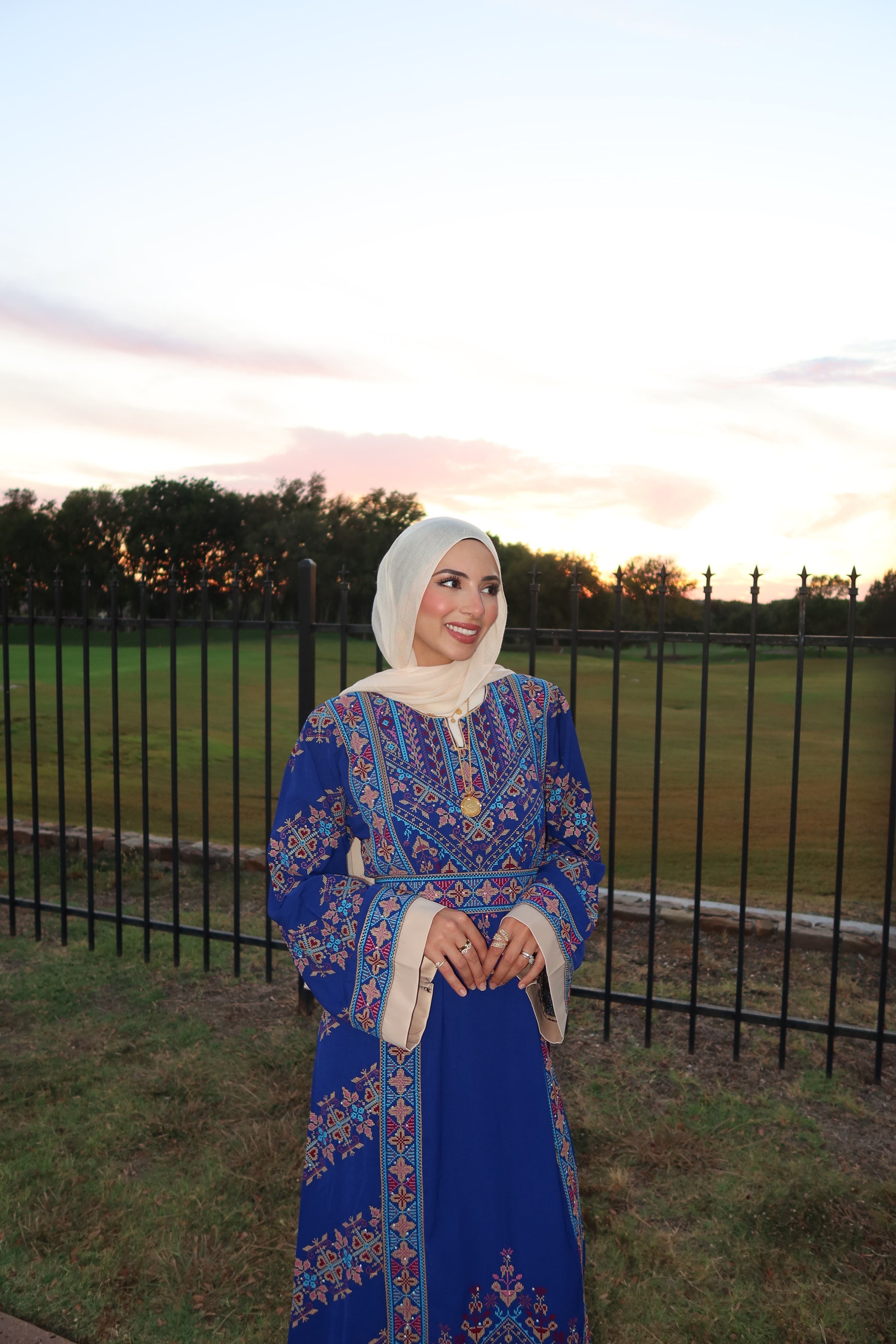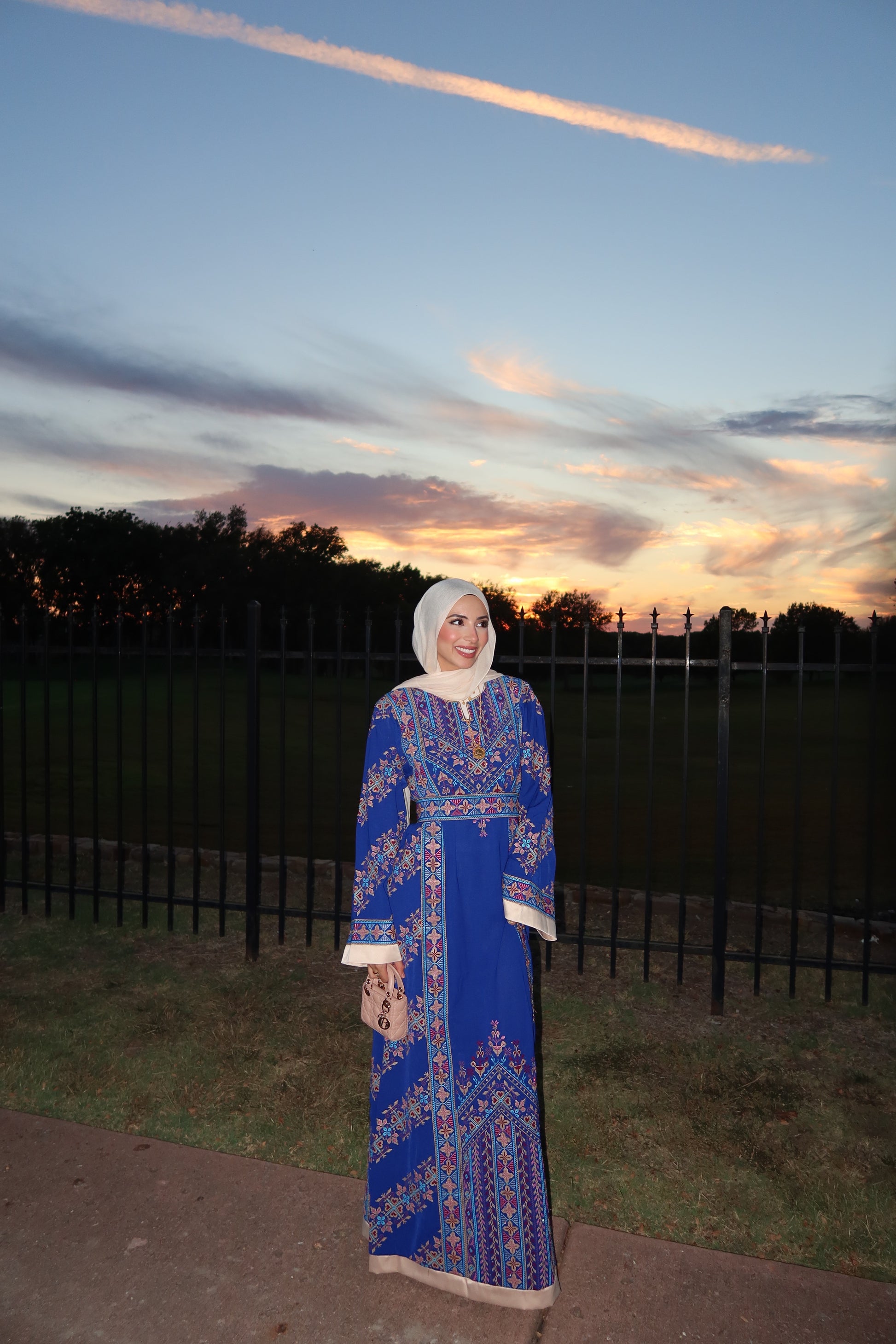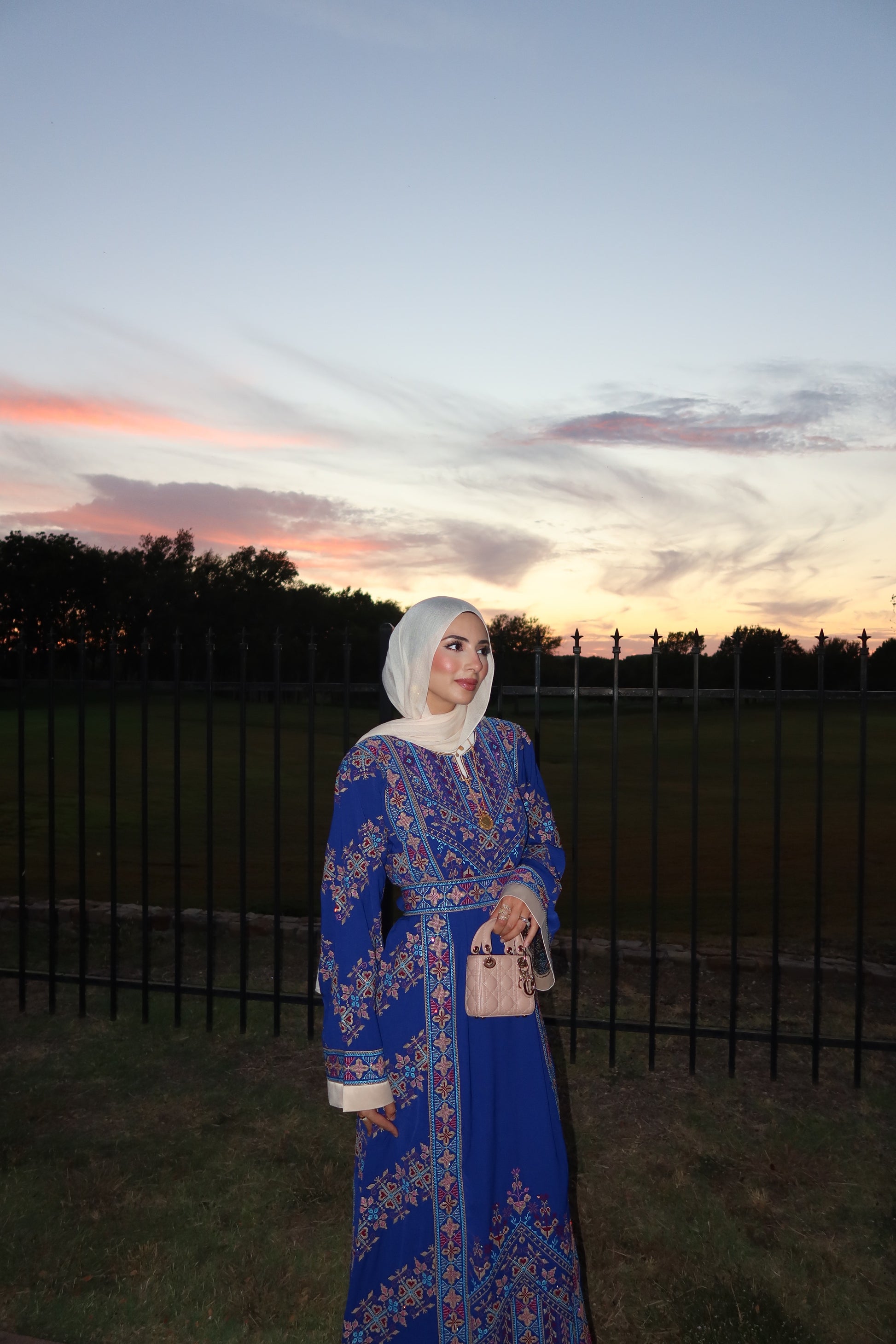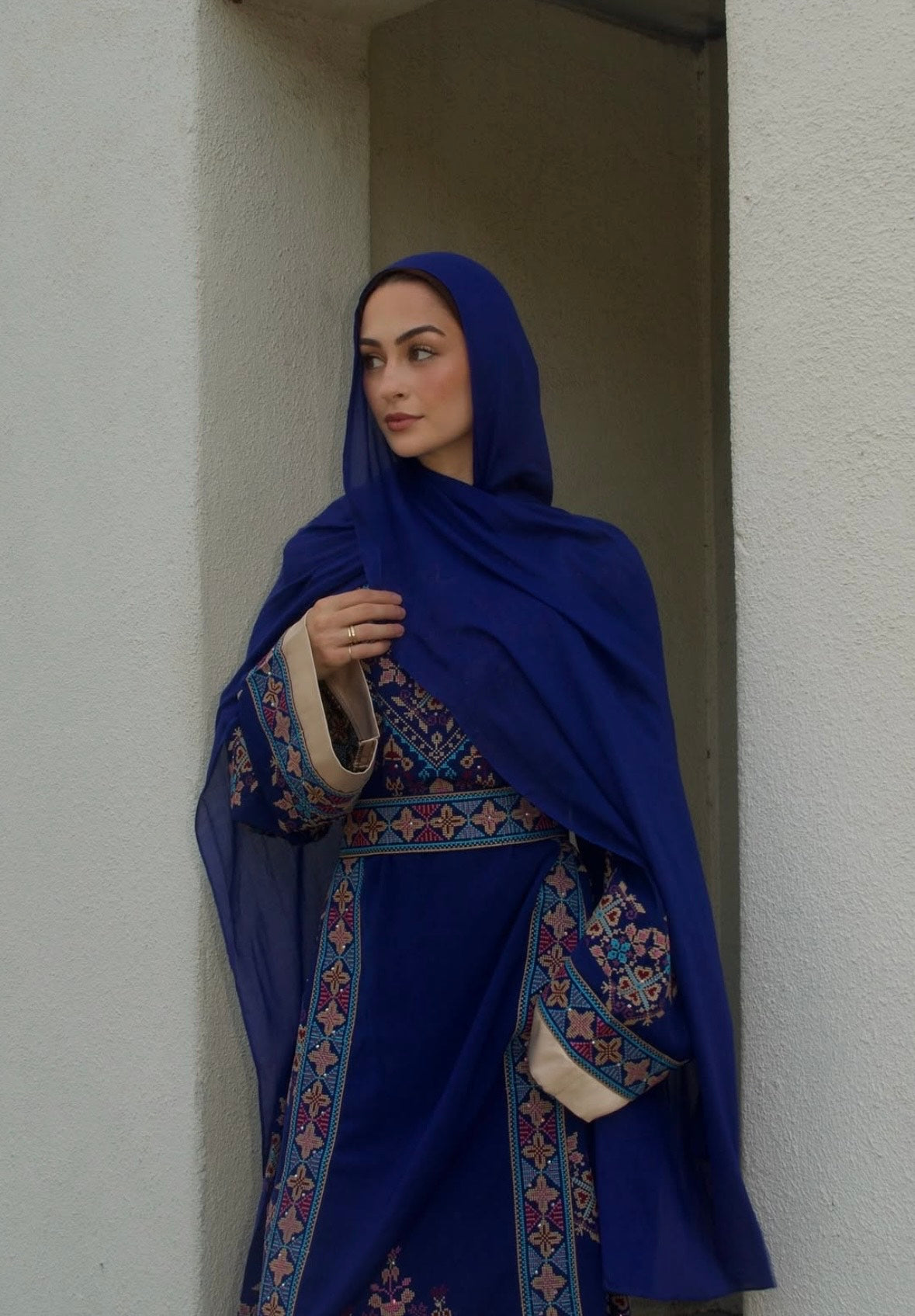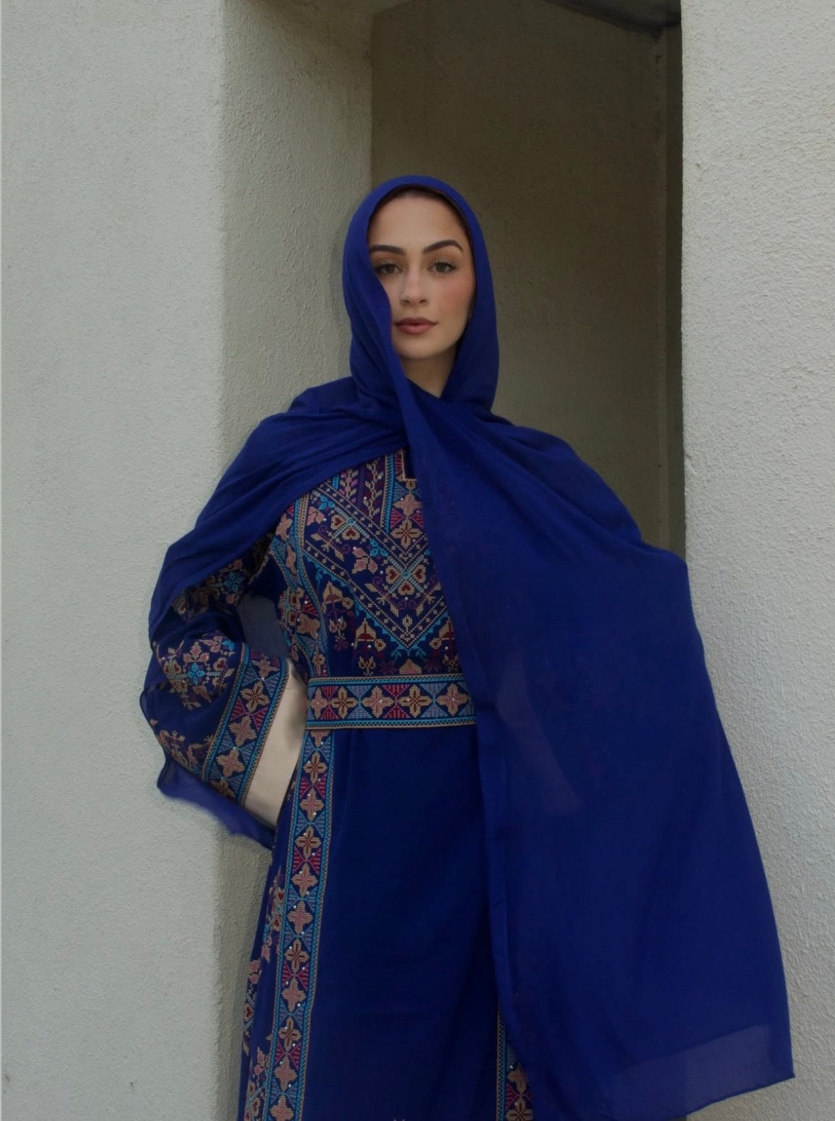 The Nada Thobe is one of our best-selling thobes. It encapsulates the brand’s ethos of blending tradition with a modern design. The Nada Thobe is adorned with intricate tatreez embroidery at the neckline and cuffs – a homage to the rich cultural heritage it represents. It has an intricate blend of blues, beige and purple. Its structured yet fluid silhouette flatters the form, offering a sense of ease and elegance for any occasion.