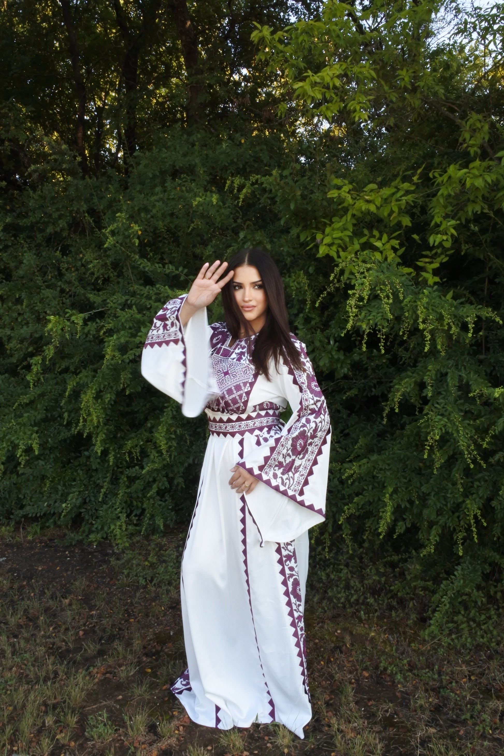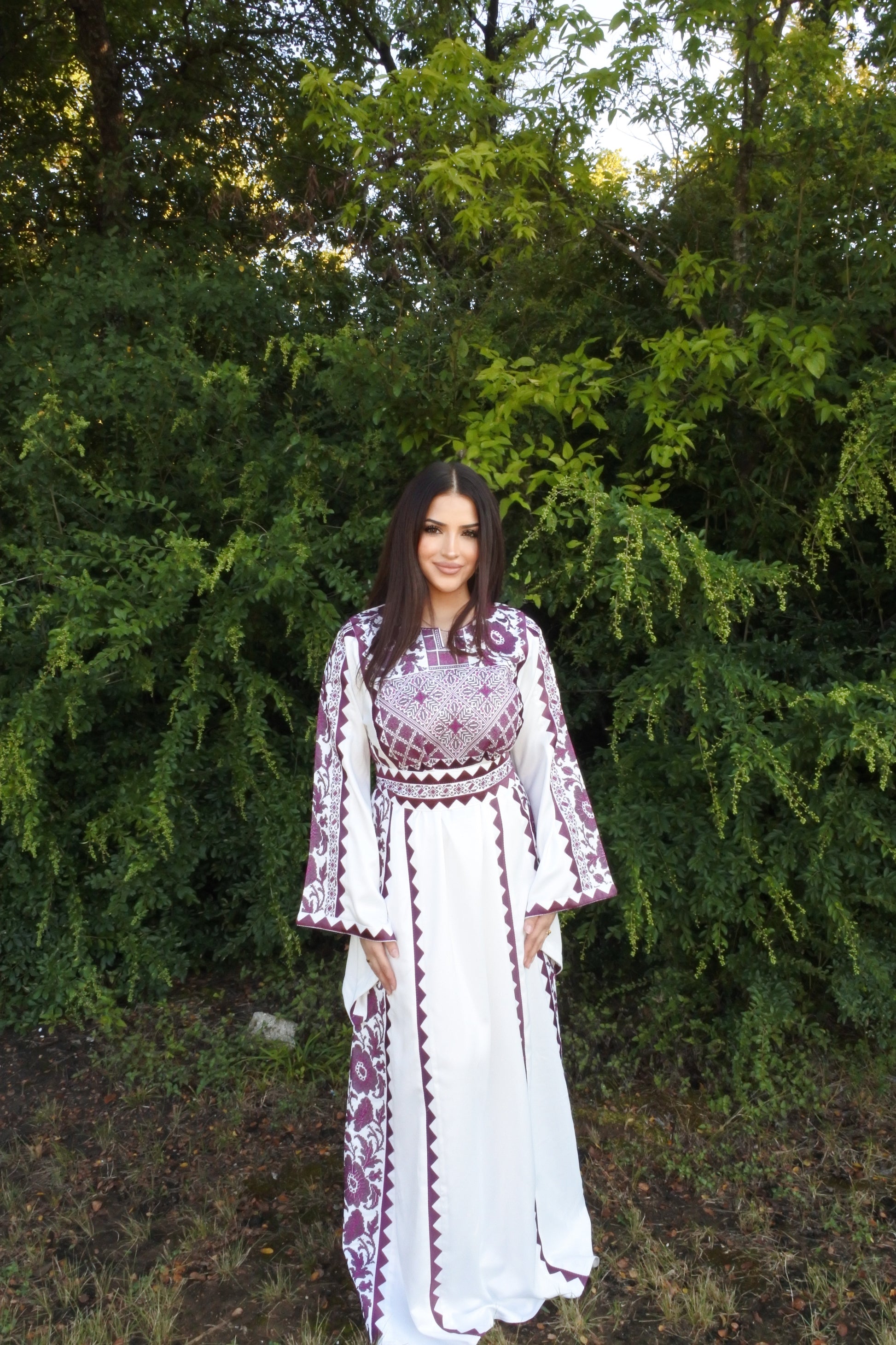 Our Rosa Thobe is crafted from a blend of polyester and cotton for a comfortable and breathable fit. The fabric serves as a beautiful canvas for an intricate plum/purple tatreez embroidery pattern on the bodice, sleeves and side panels. The traditional floral motifs reflects the rich cultural heritage of Palestinian craftmanship. Completing the ensemble is a matching belt that cinches the waist, adding both structure and elegance to the garment.