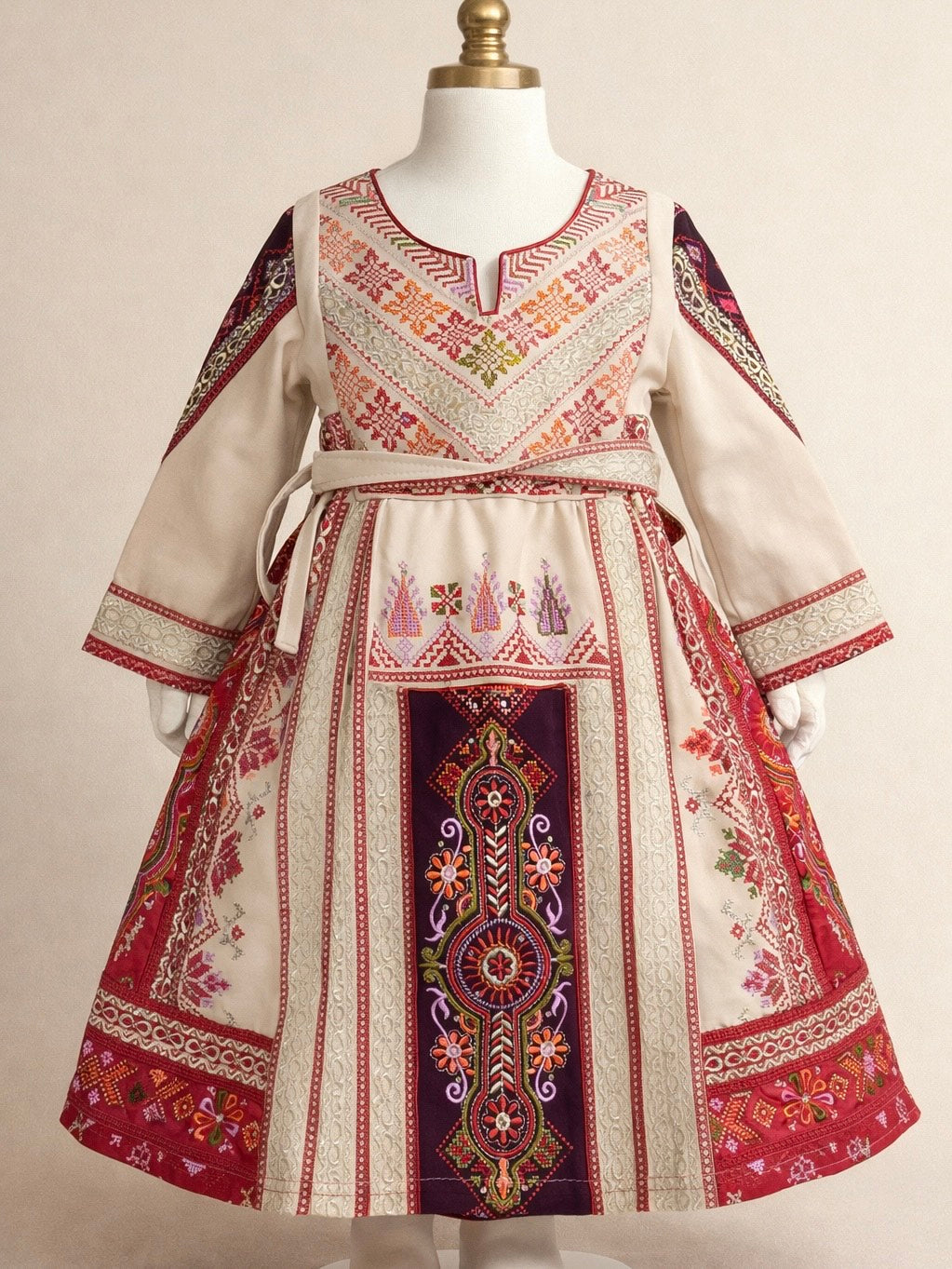 The Talia Kids Thobe is a charming traditional garment designed especially for children, celebrating Palestinian heritage through timeless craftsmanship. It is beautifully embroidered throughout with tatreez, featuring intricate patterns that reflect cultural artistry and tradition. The detailed embroidery adds elegance and character while remaining playful and age-appropriate, making it perfect for special occasions, cultural celebrations, and meaningful family gatherings.