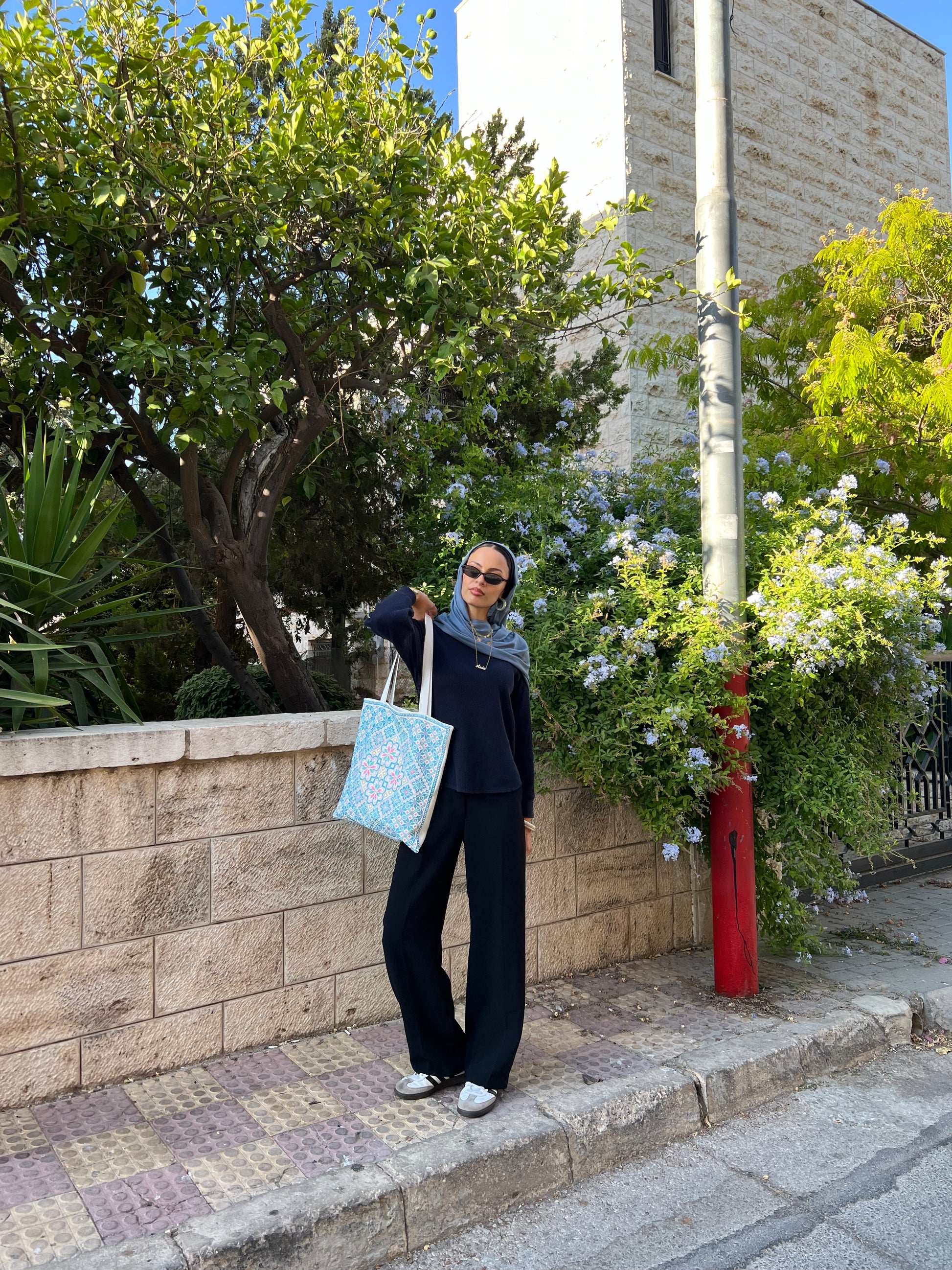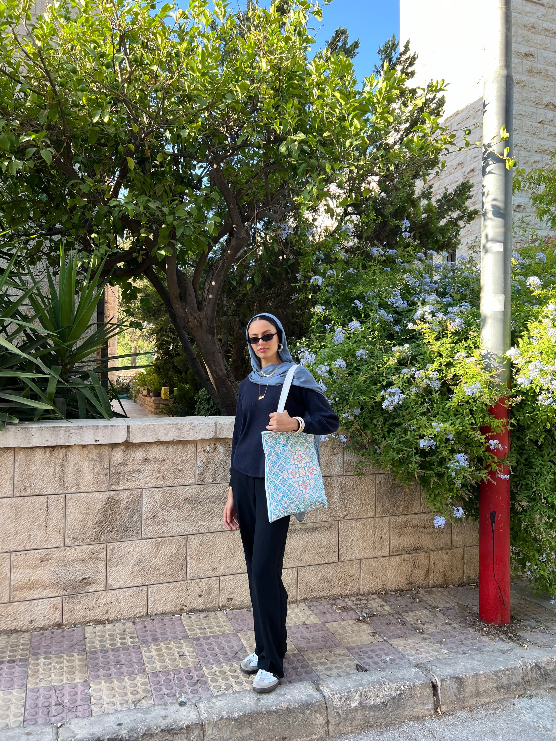 The Tatreez Tote Bag is turquoise and white with a tatreez pattern and is a stylish accessory that blends modern design with traditional Palestinian embroidery. Made from durable fabric with sturdy handles—ideal for everyday use.