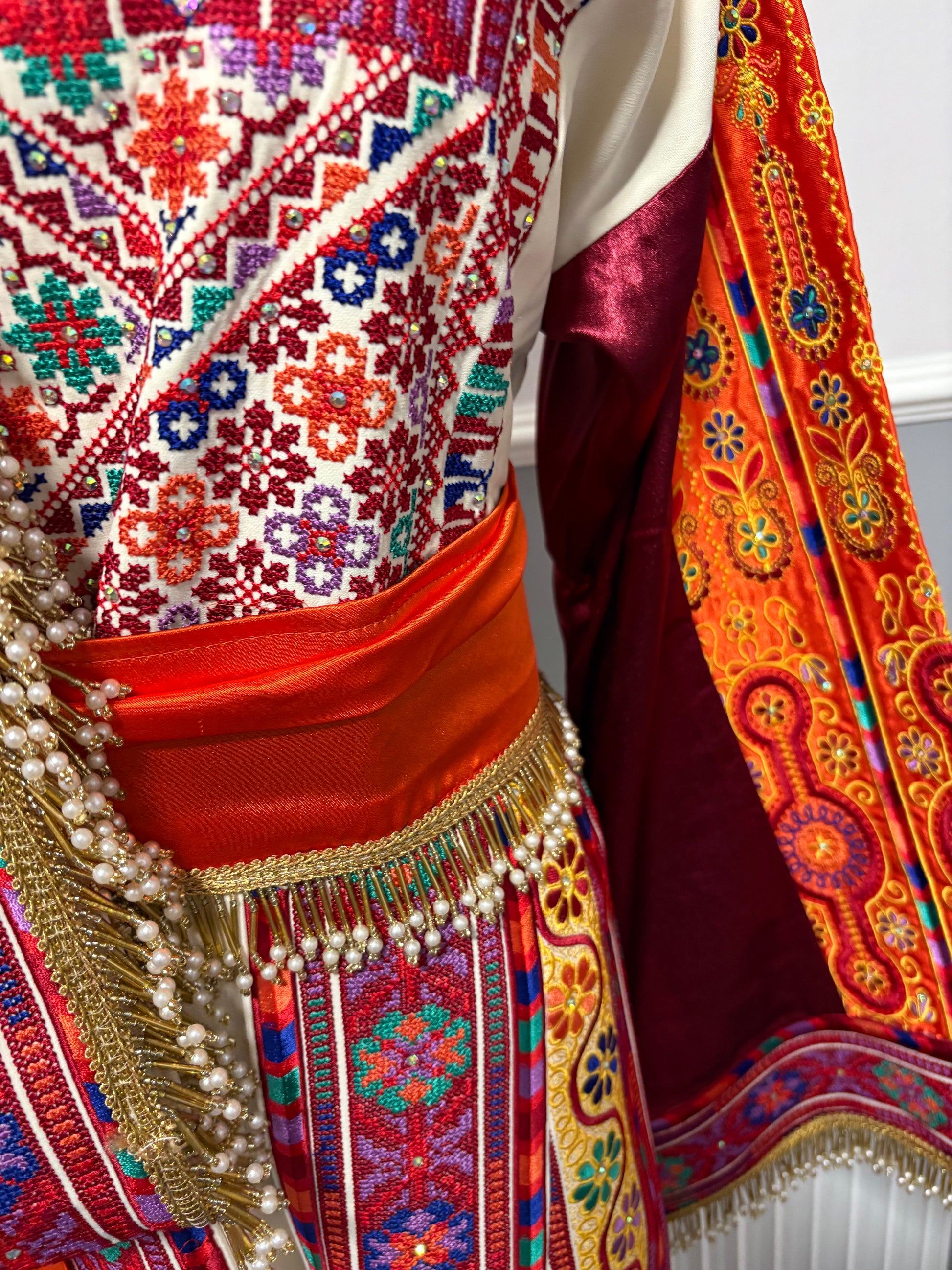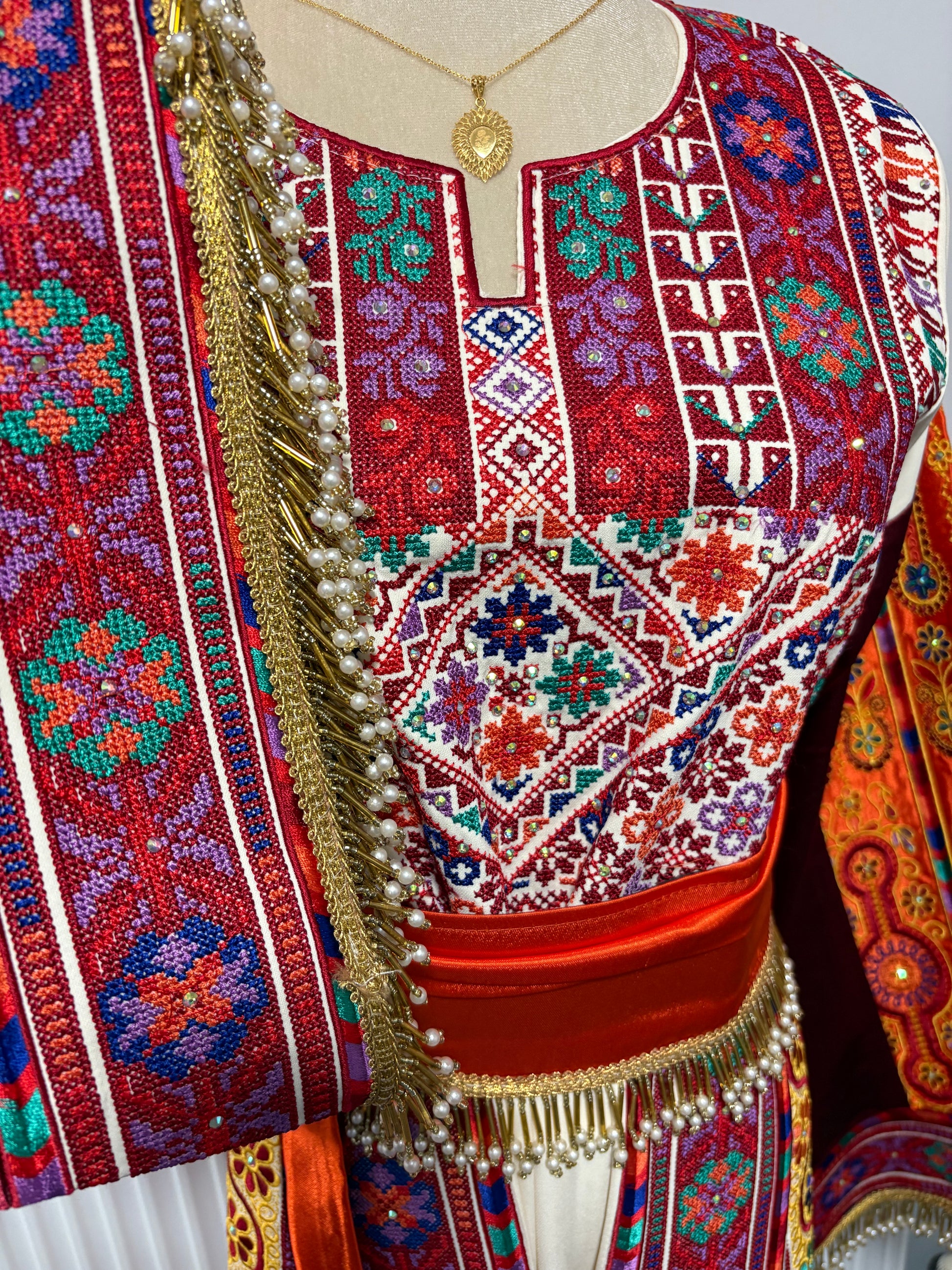 • Embroidered tatreez motifs inspired by ancient Palestinian patterns.