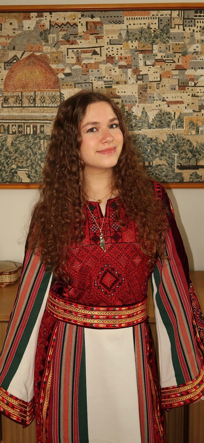 The Al Quds Thobe is a traditional Palestinian thobe, beautifully crafted with rich red tatreez embroidery, reflecting the cultural artistry of Palestine. The thobe is paired with a matching belt to accentuate the waist. A distinct off white panel on the skirt, running vertically, is a signature element, adding contrast and elegance. The overall look exudes both heritage and sophistication, making it a striking representation of Palestinian craftsmanship.