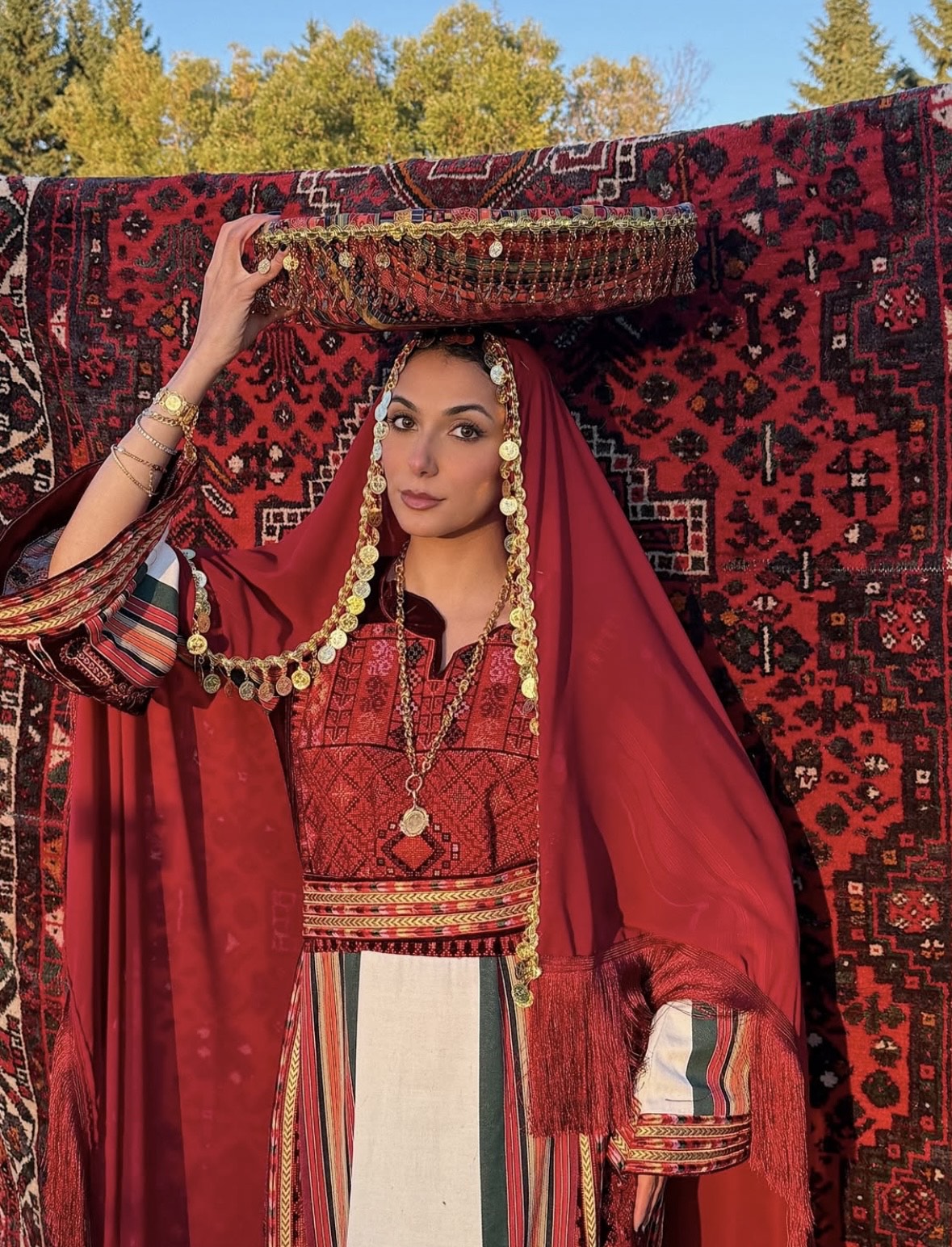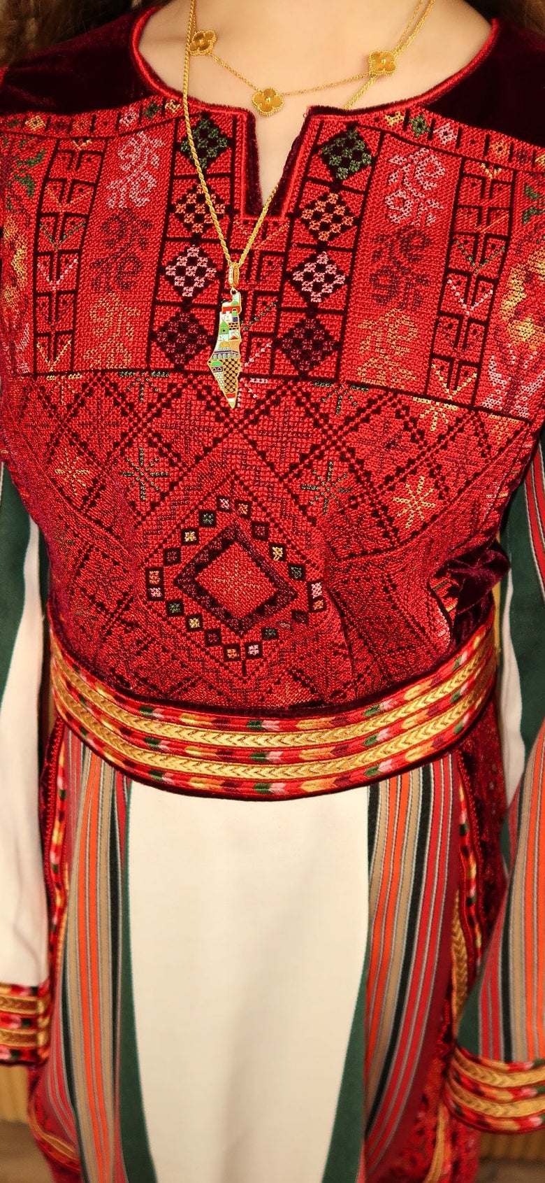 • Embroidered tatreez motifs inspired by ancient Palestinian patterns.