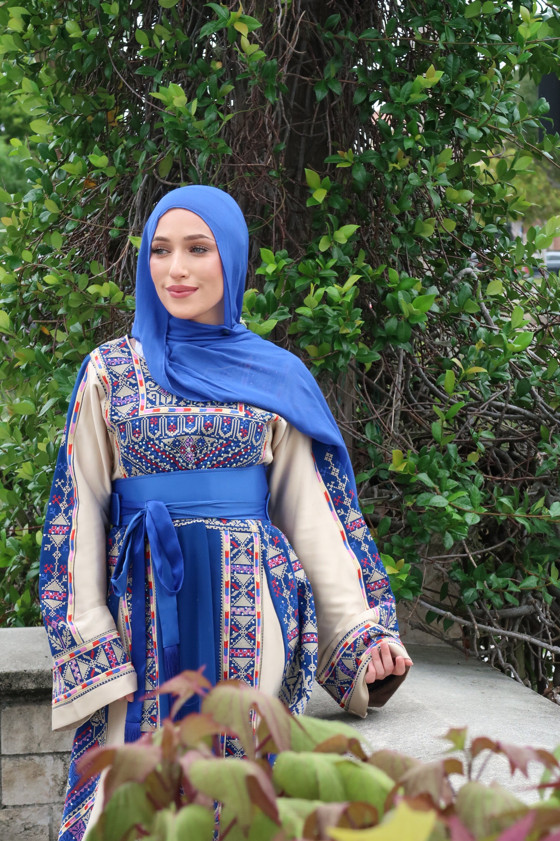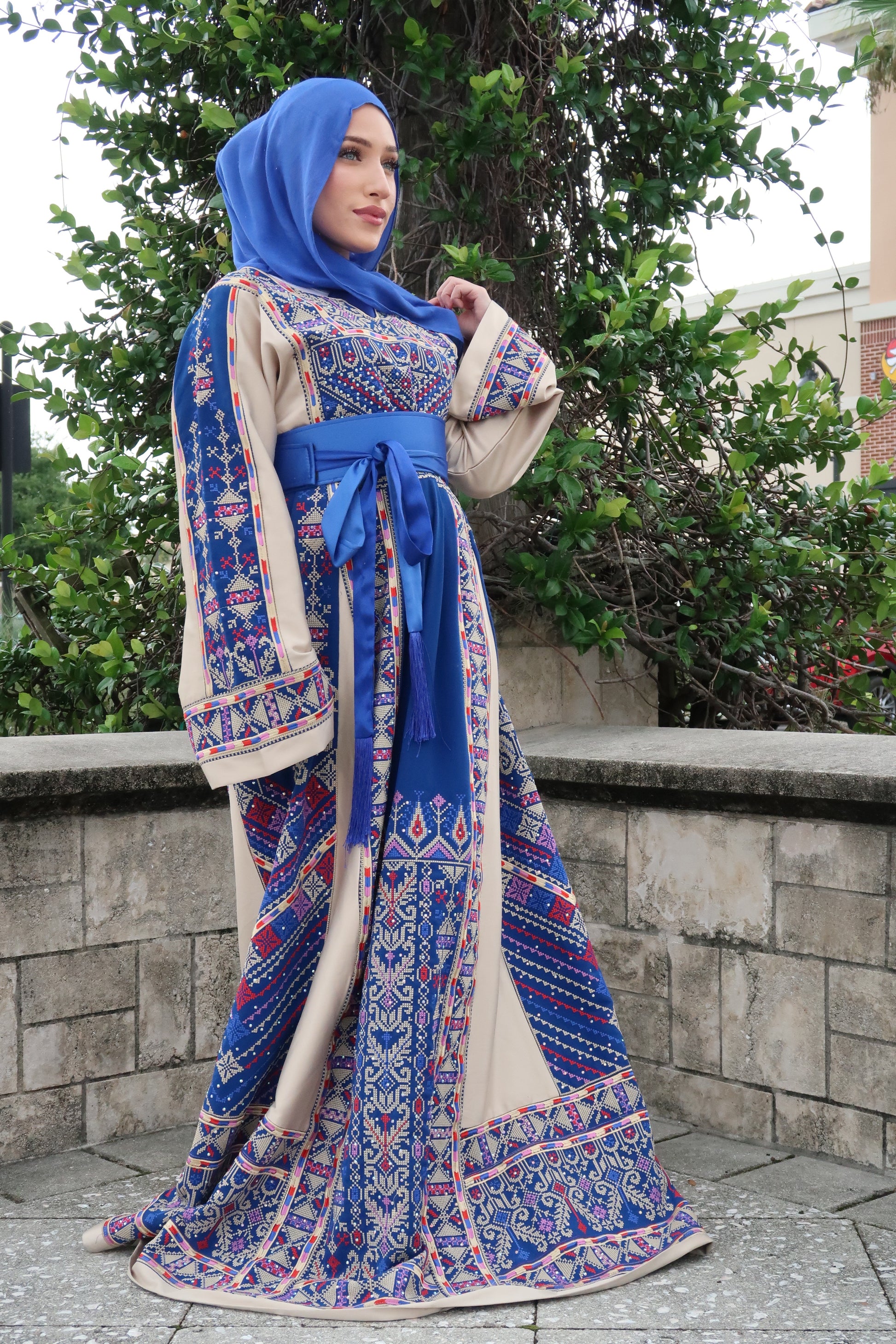 The Amaya Thobe is a traditional Palestinian garment adorned with intricate tatreez embroidery in cream, blue, pink and red. It reflects a rich cultural heritage, with each pattern symbolizing identity and history. More than just clothing, it serves as a living testament to Palestinian resilience, pride, and artistic legacy. The belt is included in the price.