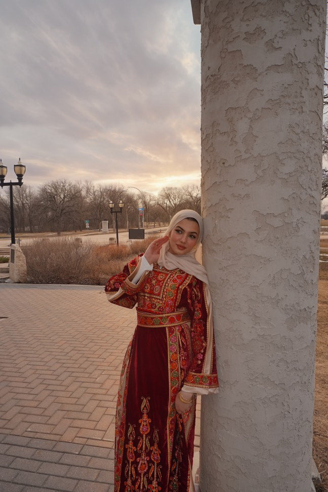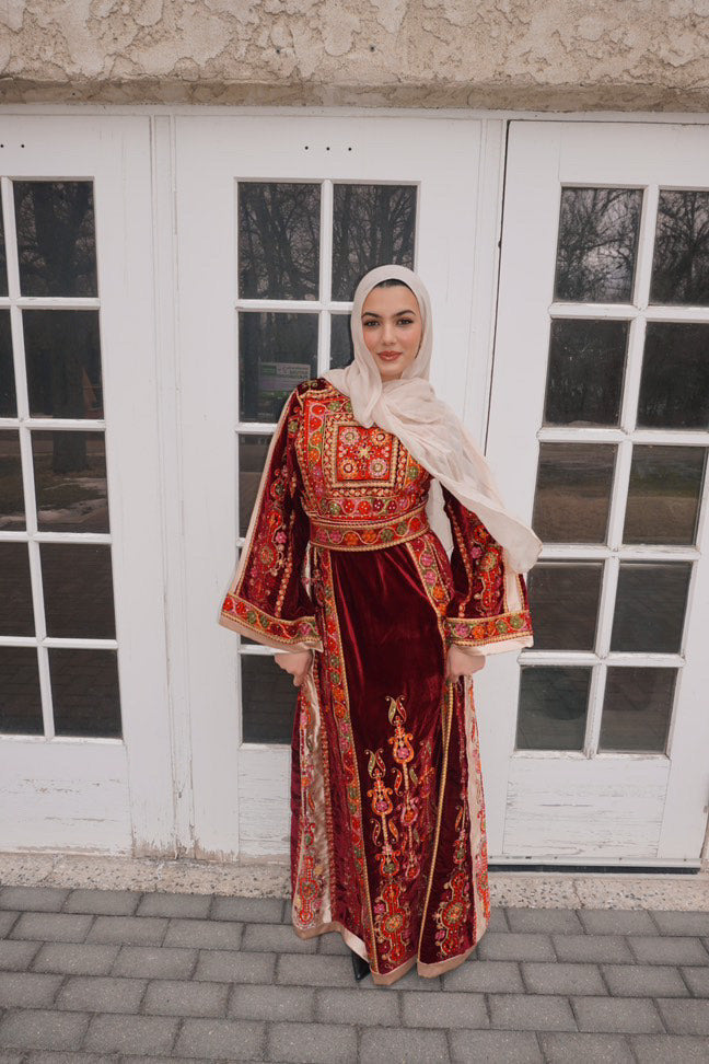 The Asmaa Thobe is a beautiful burgundy velvet thobe with a luxurious red, orange, pink and green tatreez pattern that's sure to turn heads. Its deep, rich color creates a striking and elegant look, making it perfect for any special occasion. The Asmaa thobe comes with a matching belt which makes it a showstopper. It not only offers comfort but also durability.
