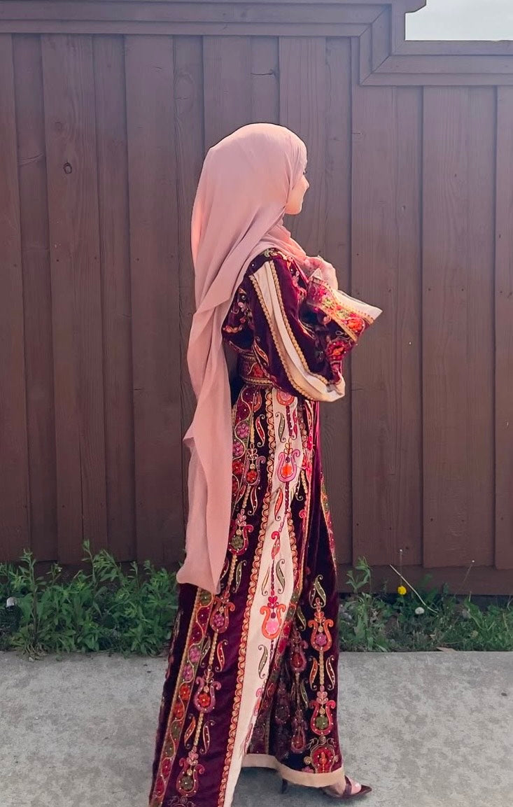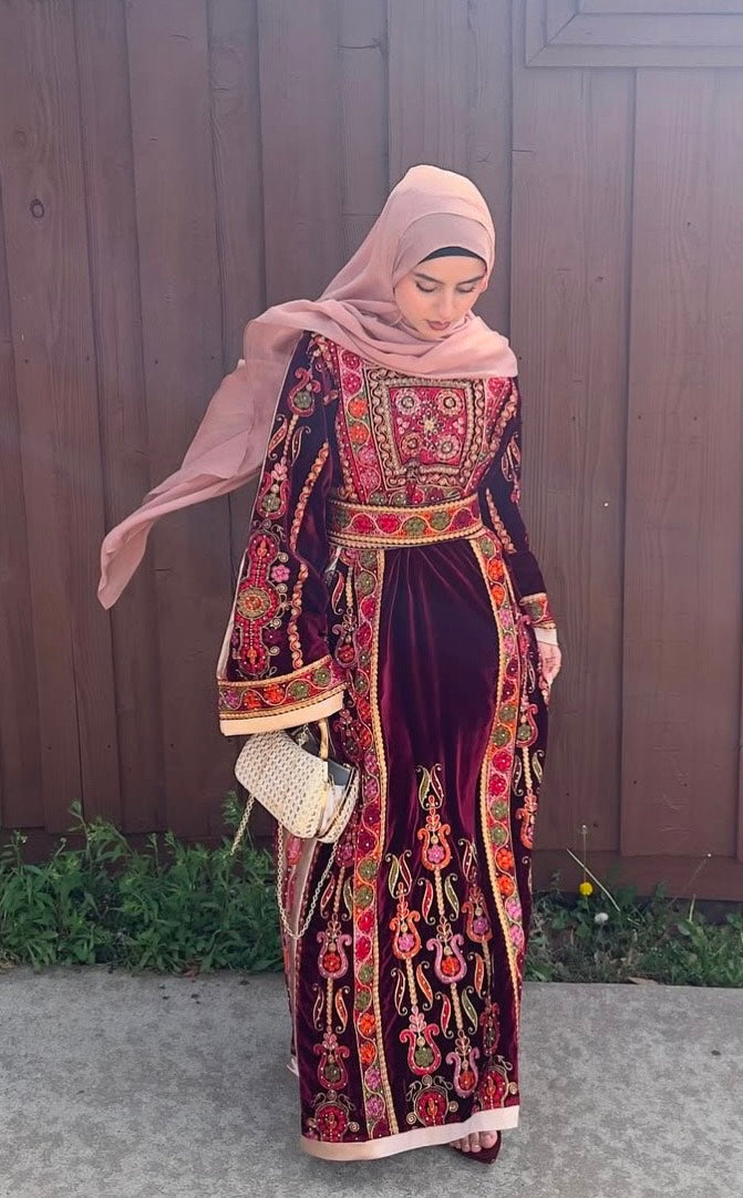 • A burgundy velvet thobe with red, green, orange and pink tatreez embroidery