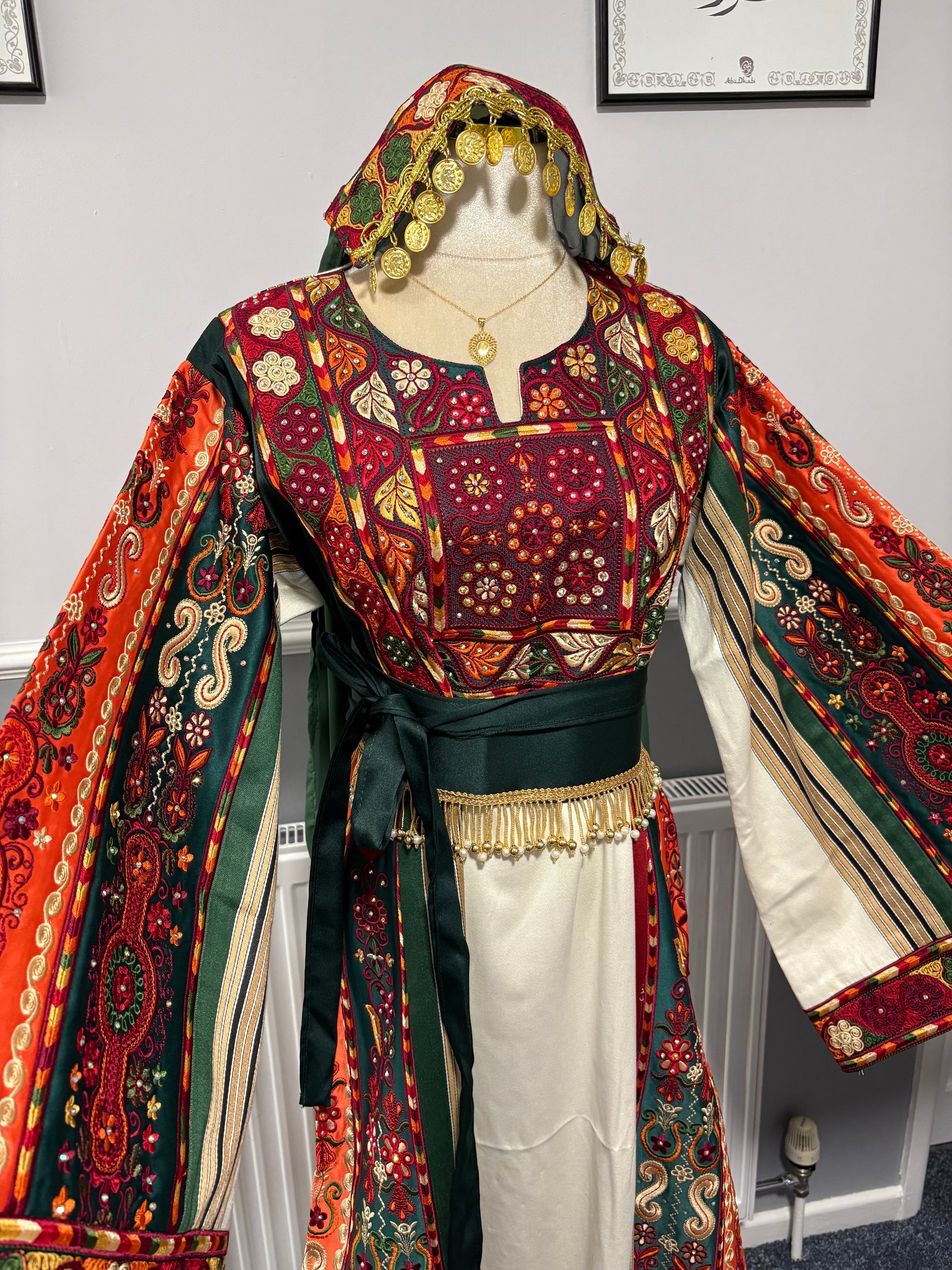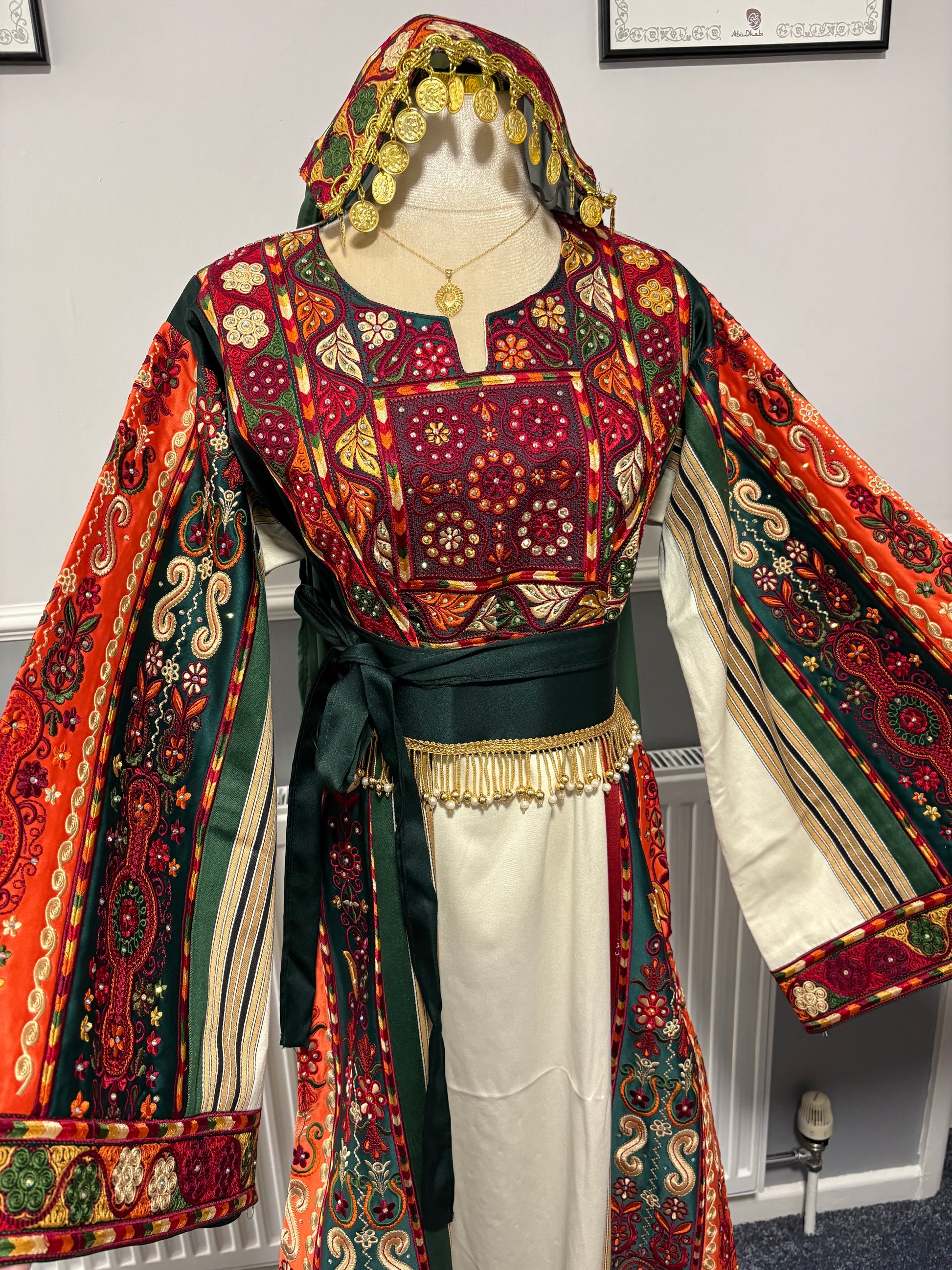 The Aziza Thobe is adorned with orange, green and red Tatreez embroidery. This bold color palette brings a fresh, feminine touch to the traditional design, making it perfect for weddings or festive occasions. The intricate patterns celebrate heritage with a modern twist. The headpiece and belt are included with the thobe.