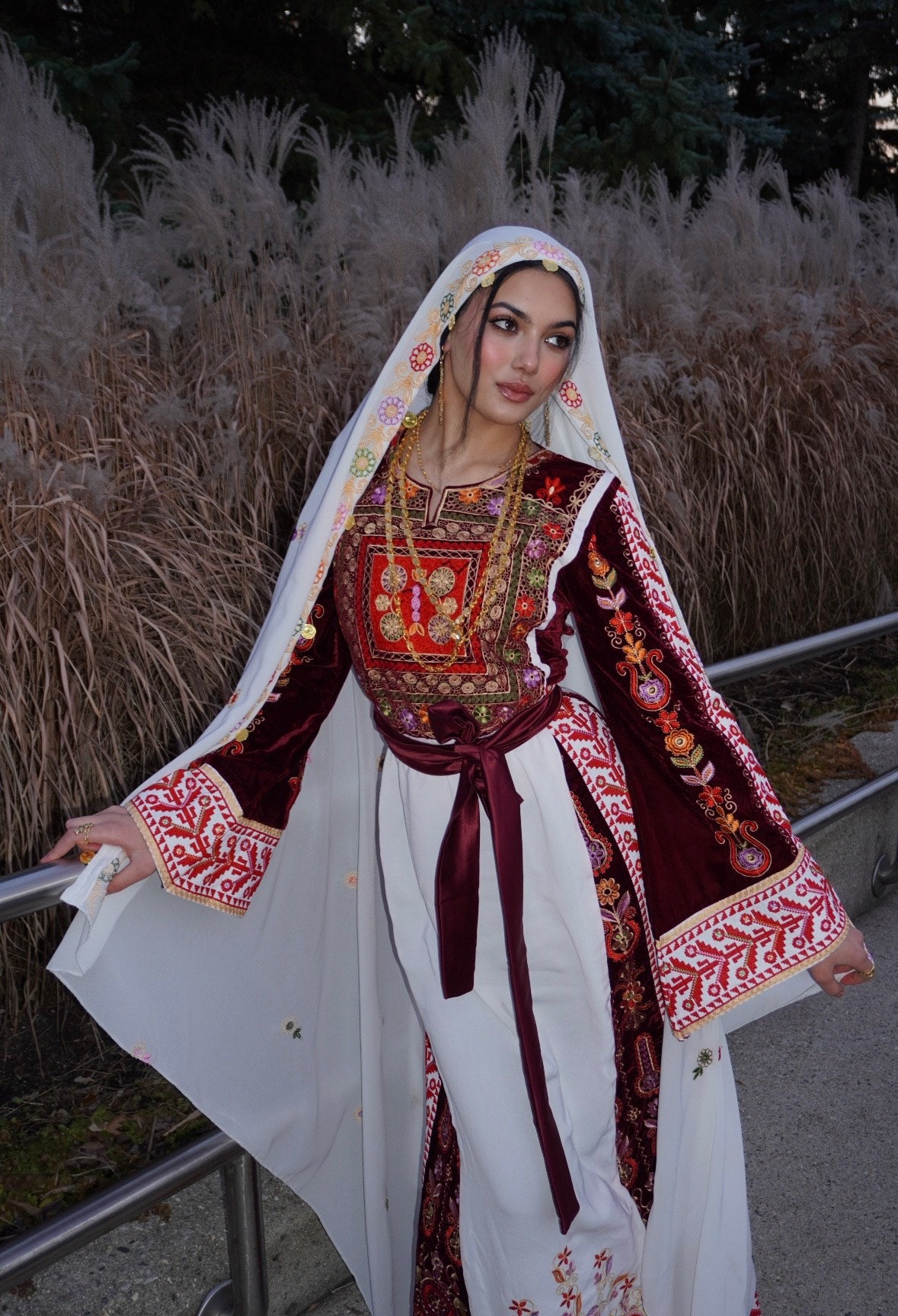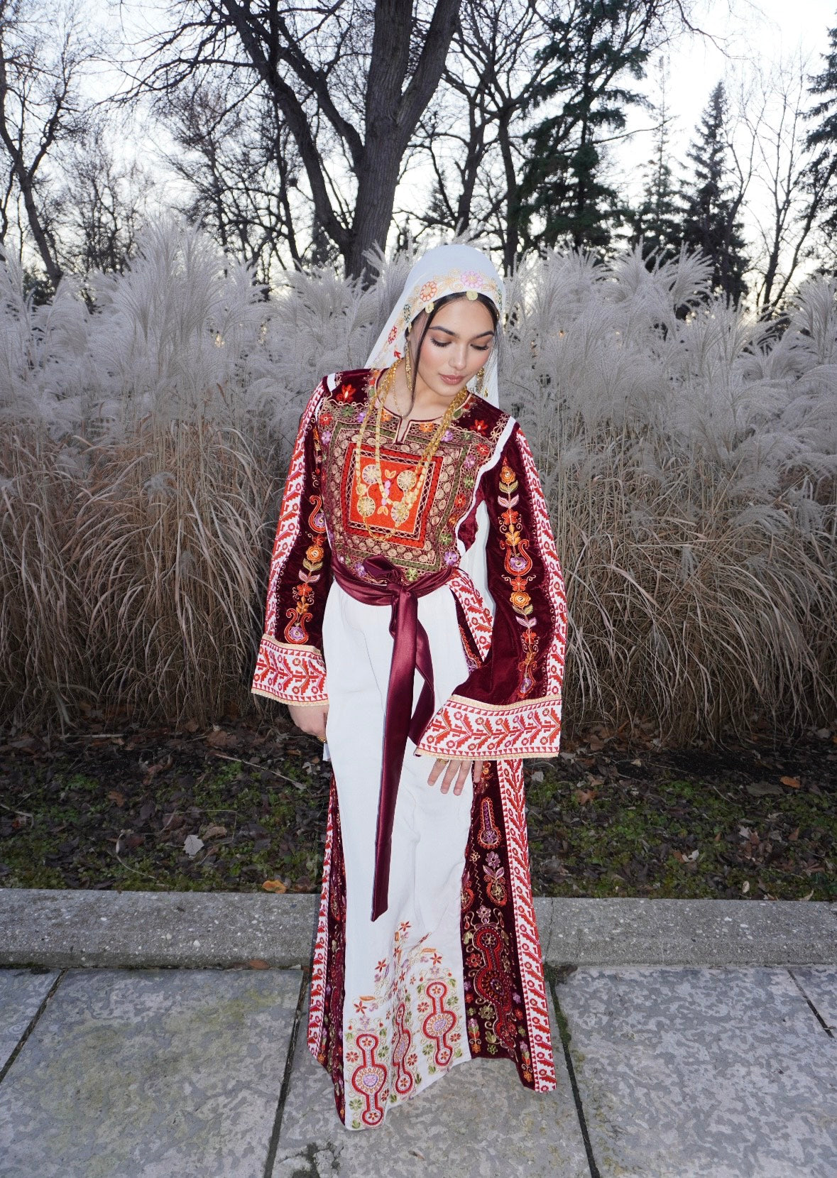 • A burgundy velvet thobe with red, green, orange and pink tatreez embroidery
