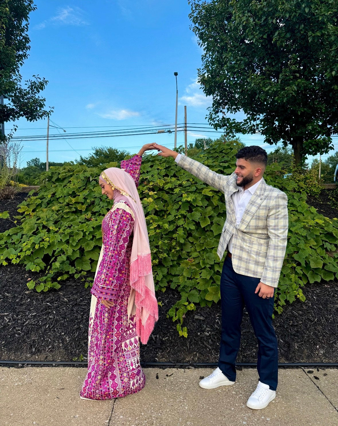 • Embroidered tatreez motifs inspired by ancient Palestinian patterns.
