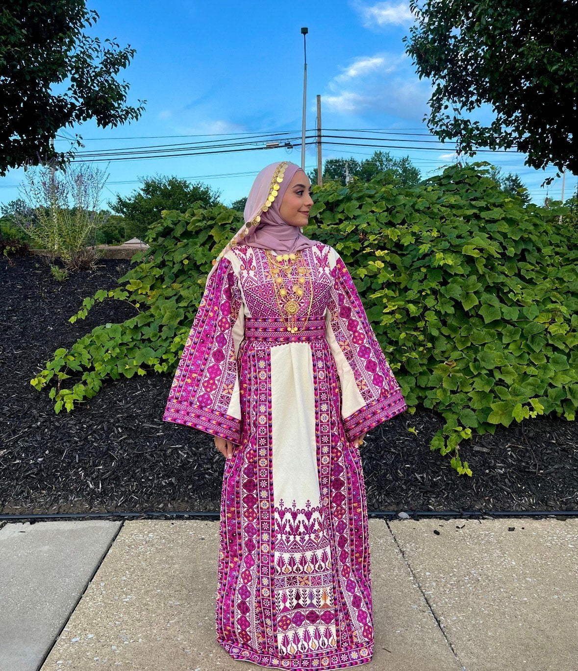 The Hayat Thobe is a white thobe with intricate purple Tatreez detailing, a striking fusion of tradition and elegance. The Hayat Thobe is Made in Palestine, keeping our culture, tradition and country with you wherever you go. Includes headscarf when you order.