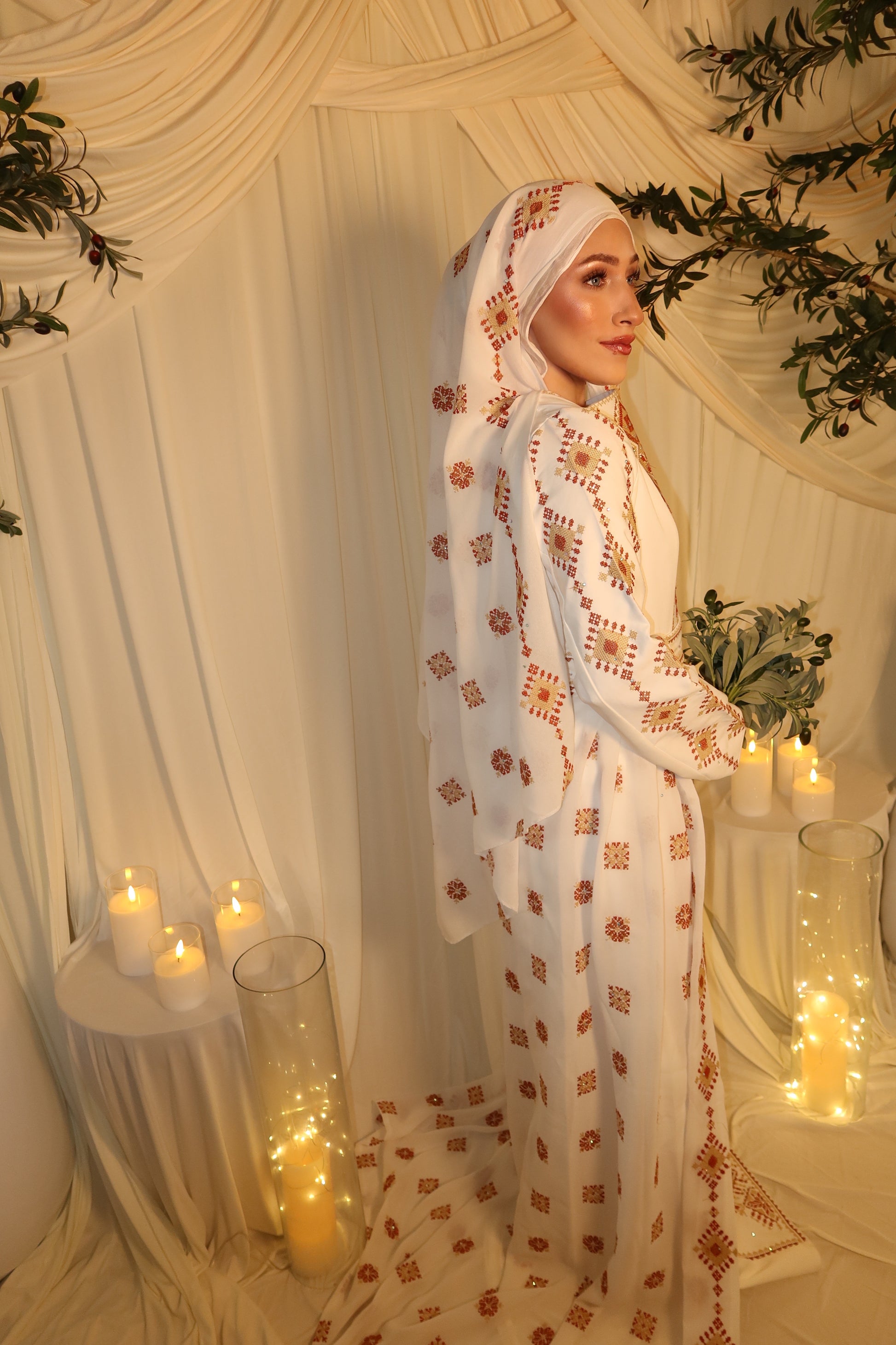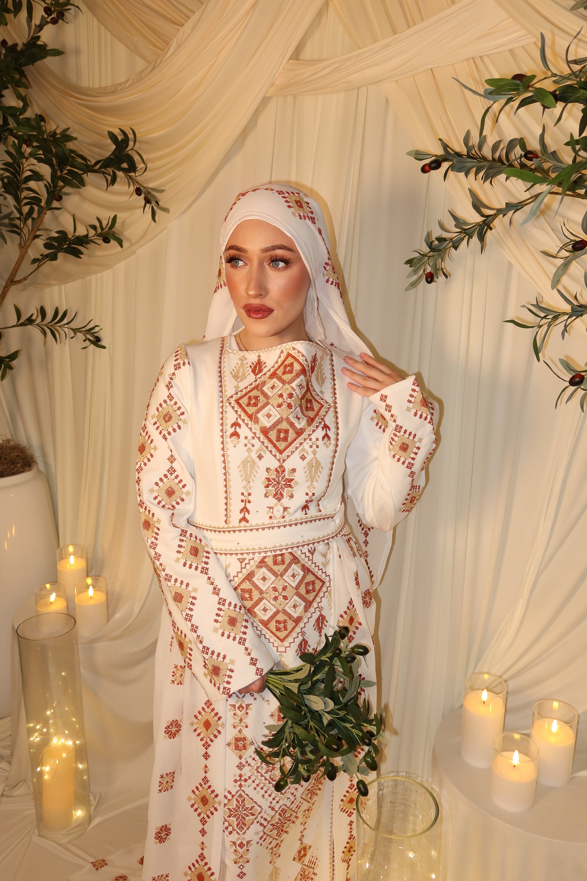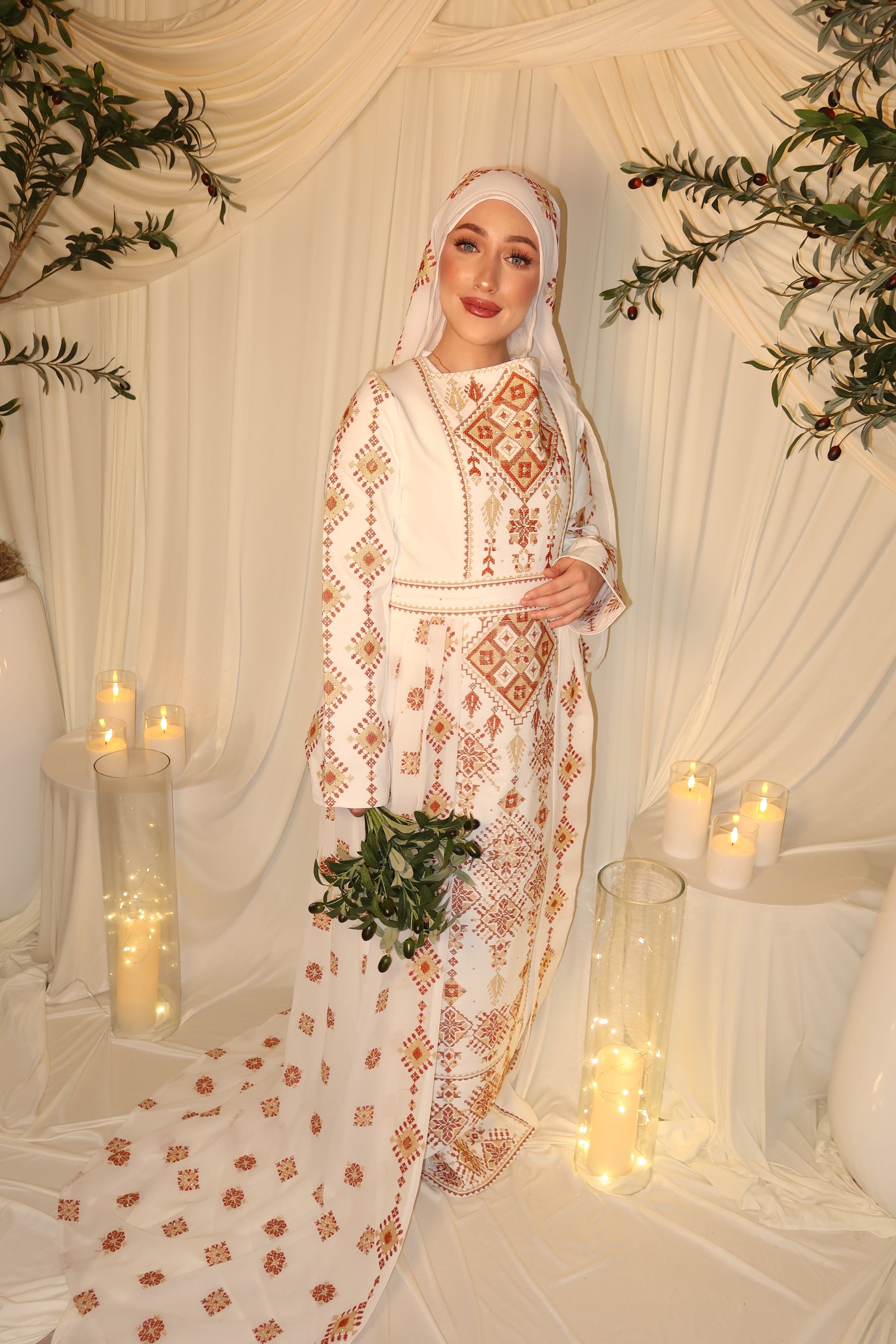 The Firdaws thobe is a beautiful bridal dress. Embellished with Gold Tatreez. It also includes a beautiful bridal trail and headpiece. Adorned with hand-stitched gold tatreez the sacred embroidery passed down through generations, the dress speaks the language of the land—each pattern echoing stories of home, strength, and womanhood. The flowing trail adds grace and dignity, reminiscent of the elegance carried by our ancestors. A true celebration of Palestinian culture and craftsmanship.