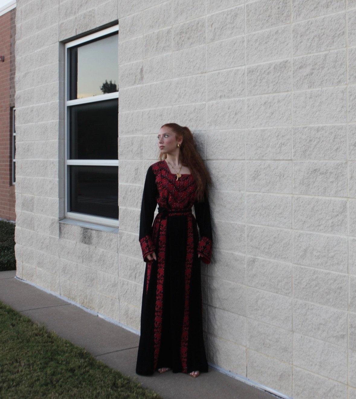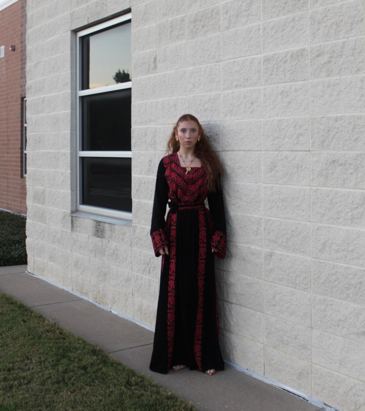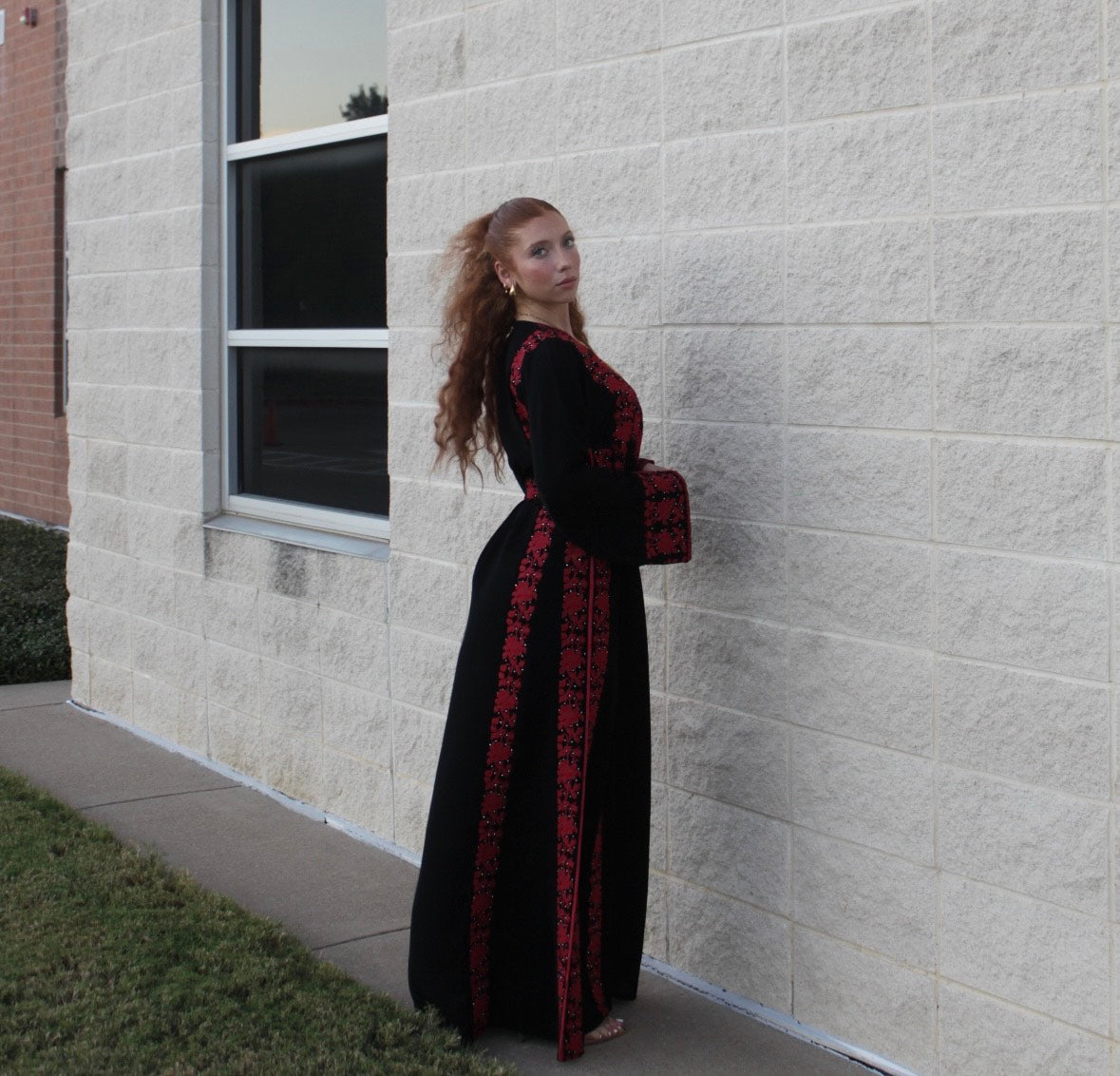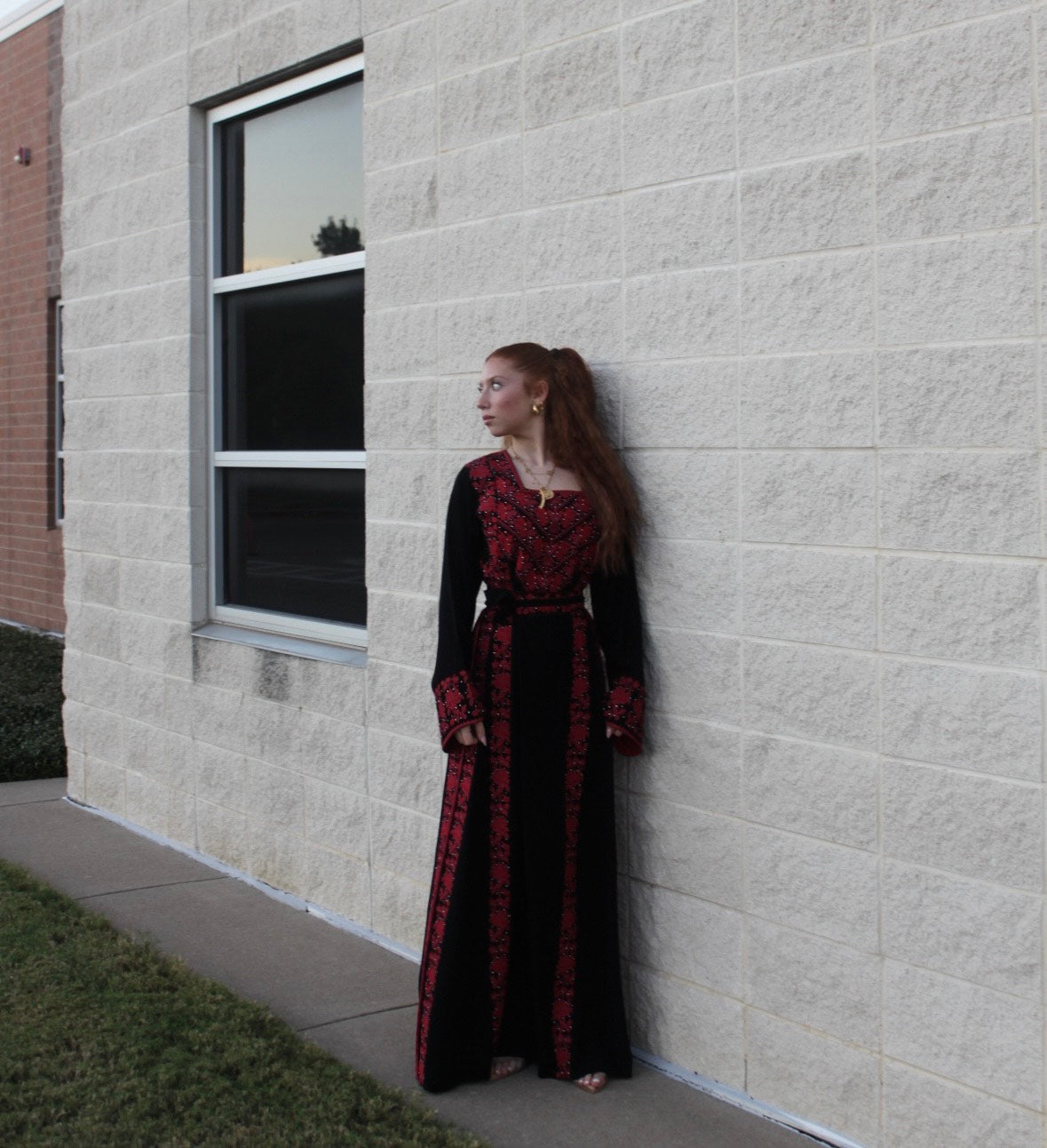 The Israa Thobe is a black thobe adorned with delicate red Tatreez embroidery. This color palette brings a fresh, feminine touch to the traditional design, making it perfect for weddings or festive occasions. The intricate patterns celebrate heritage with a modern twist.