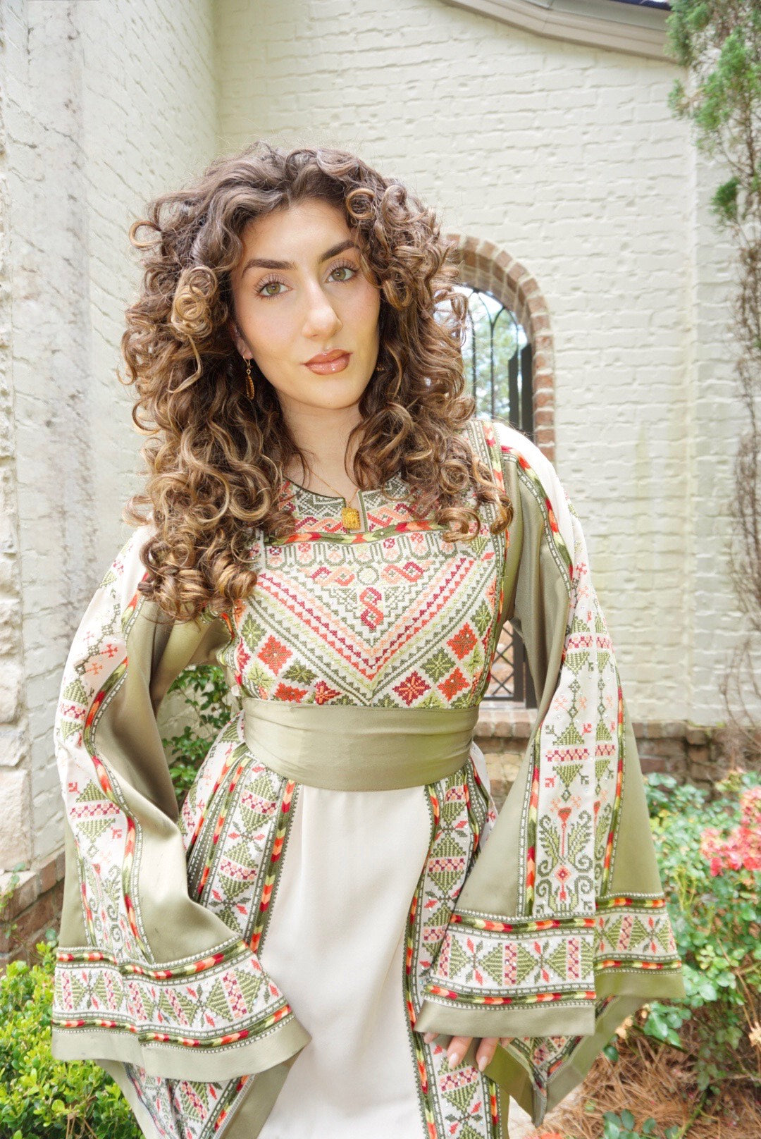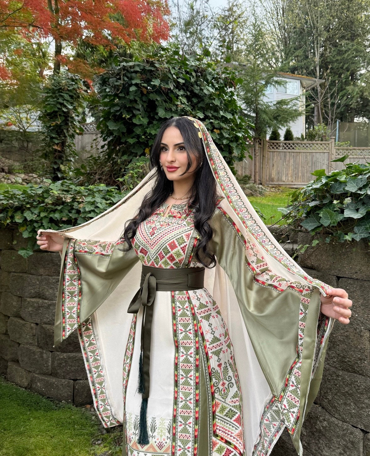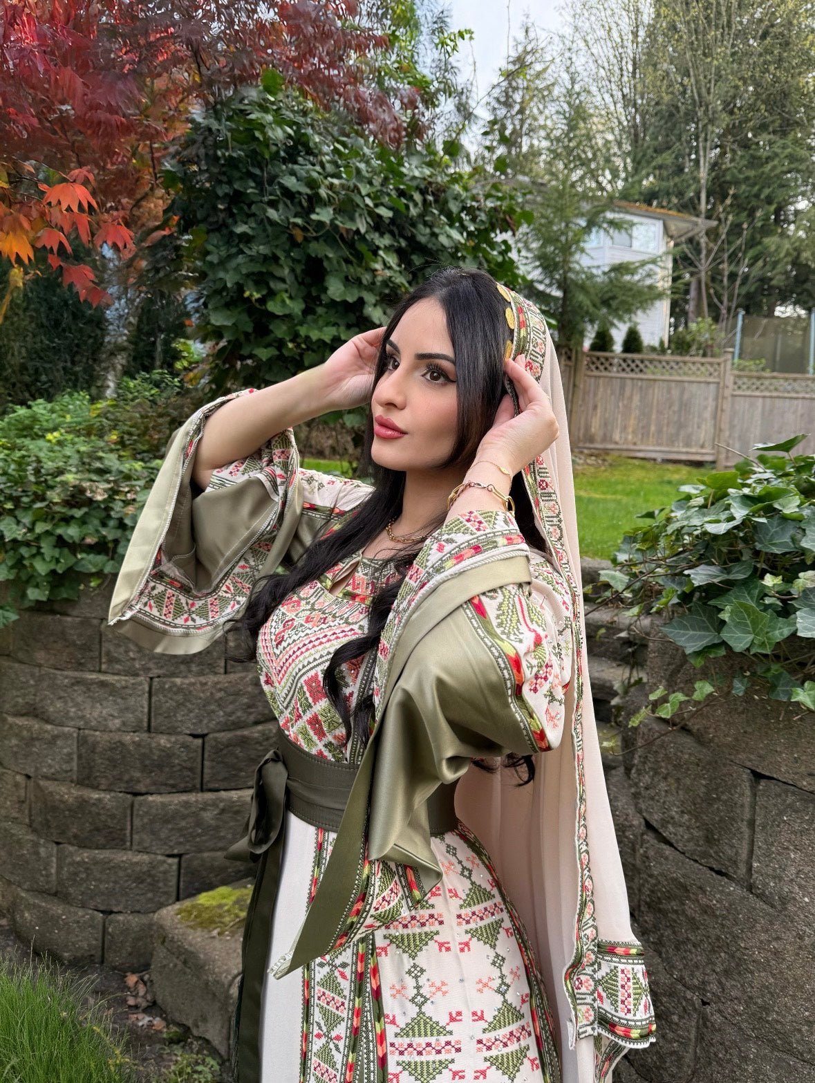 The Lara Thobe is a traditional Palestinian thobe, beautifully crafted with green and pink tatreez embroidery, reflecting the cultural artistry of Palestine. The thobe is paired with a matching tatreez belt to accentuate the waist and a matching headpiece, the tatreez pattern of the headpiece may vary. A distinct white panel on the skirt, running vertically, is a signature element, adding contrast and elegance. The overall look exudes both heritage and sophistication, making it a striking representation of Palestinian craftsmanship.