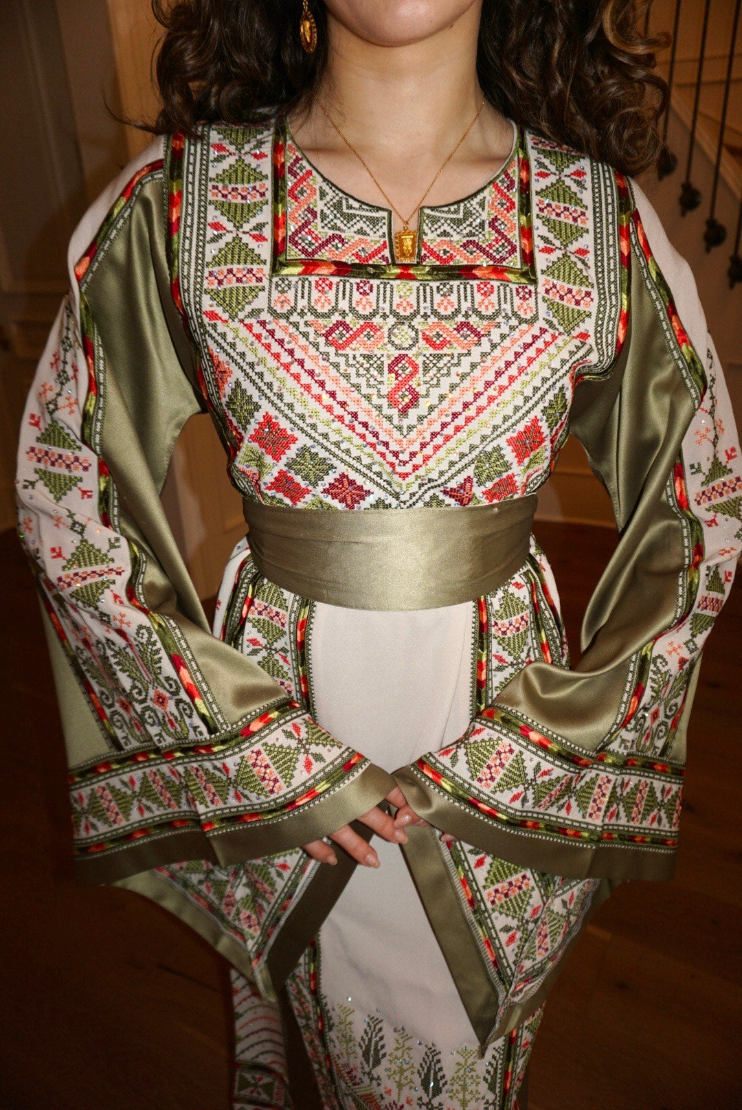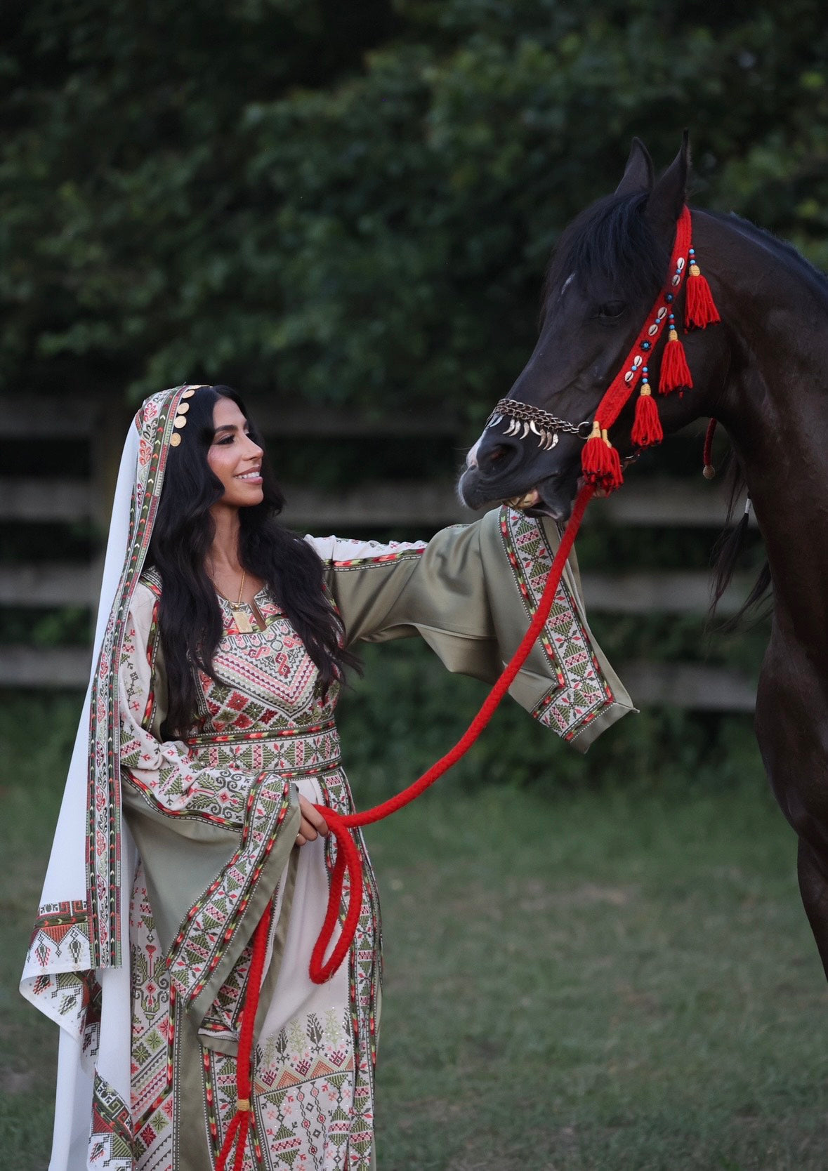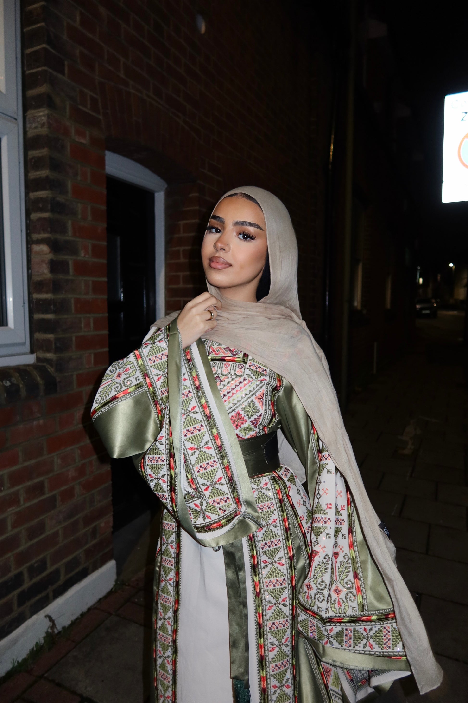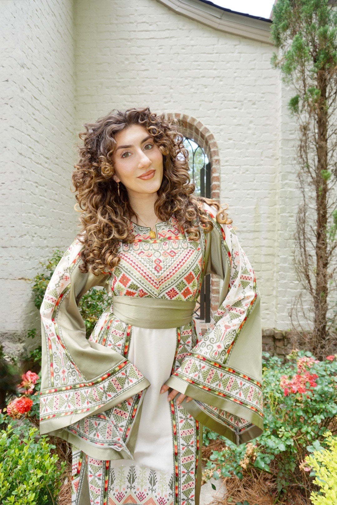 The Lara Thobe is a traditional Palestinian thobe, beautifully crafted with green and pink tatreez embroidery, reflecting the cultural artistry of Palestine. The thobe is paired with a matching tatreez belt to accentuate the waist and a matching headpiece, the tatreez pattern of the headpiece may vary. A distinct white panel on the skirt, running vertically, is a signature element, adding contrast and elegance. The overall look exudes both heritage and sophistication, making it a striking representation of Palestinian craftsmanship.