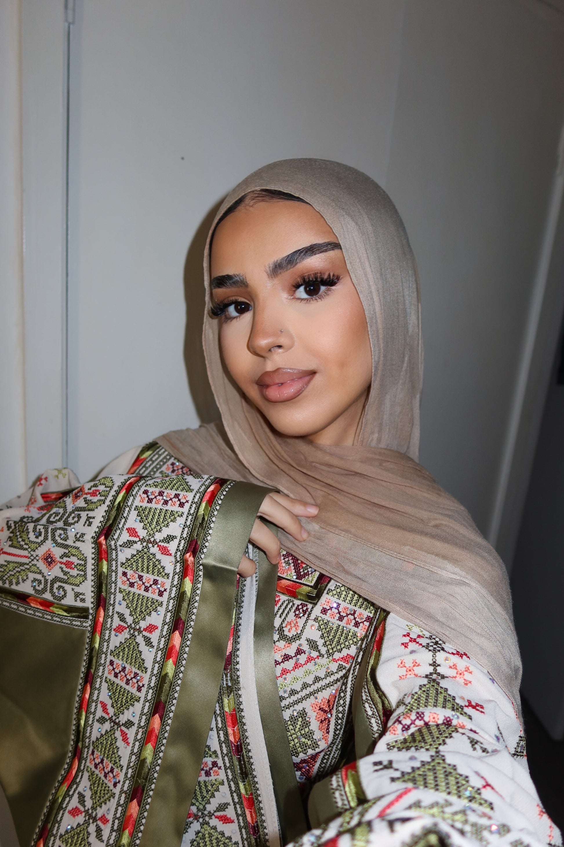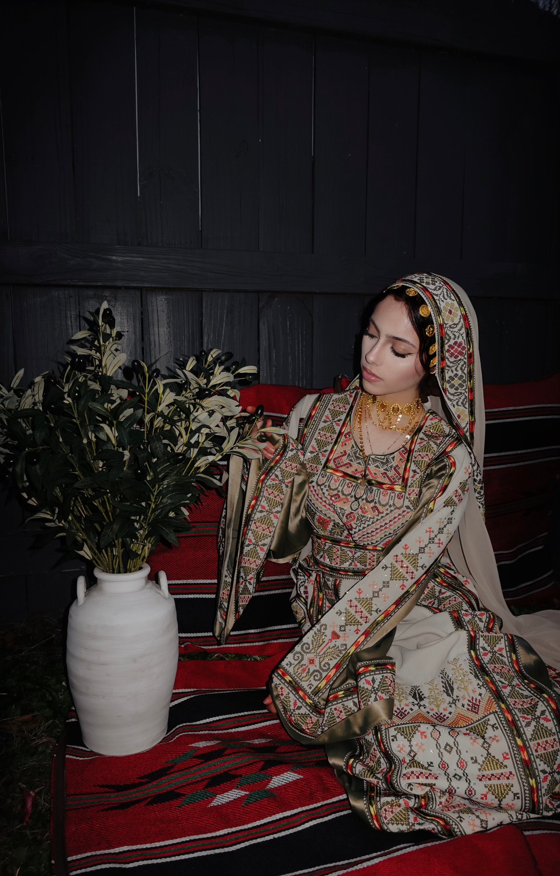 • Embroidered tatreez motifs inspired by ancient Palestinian patterns.