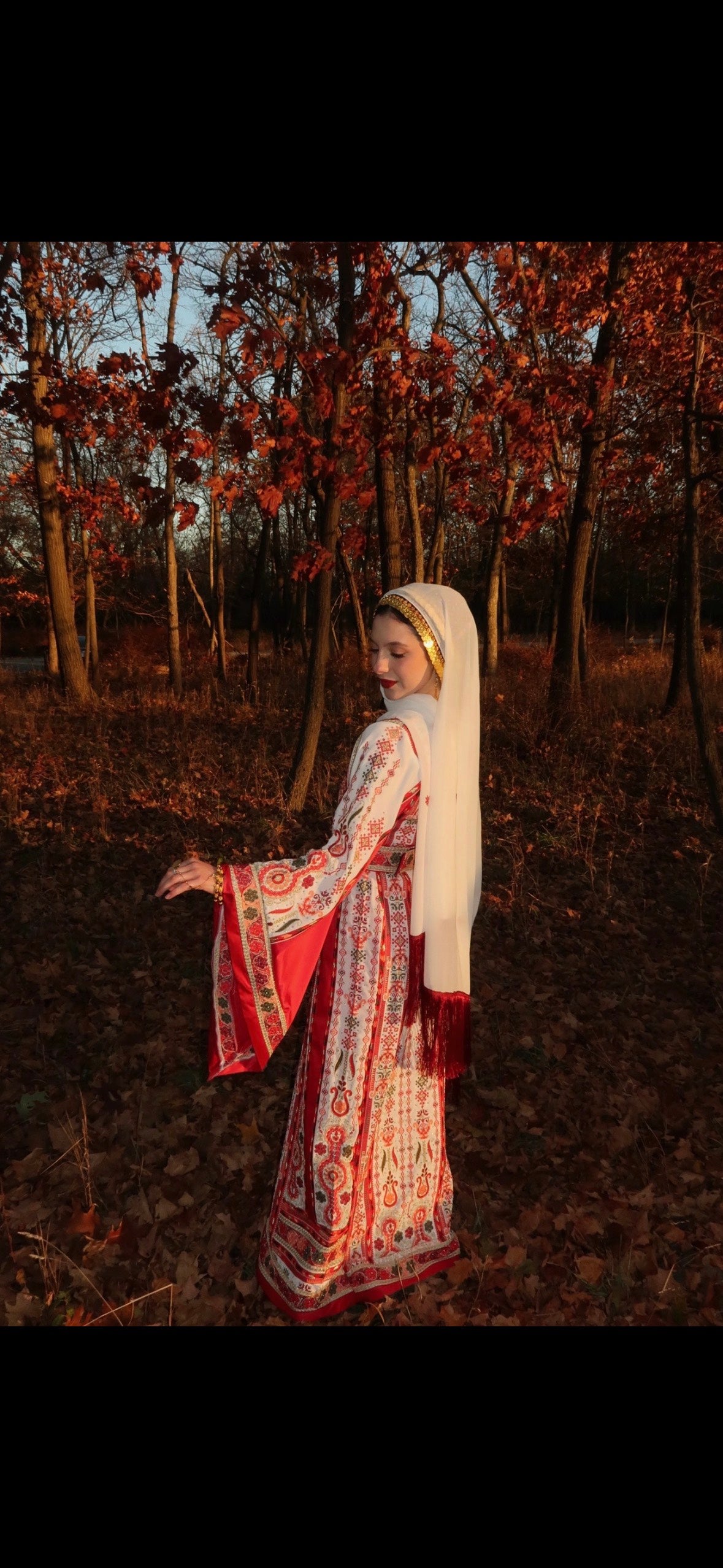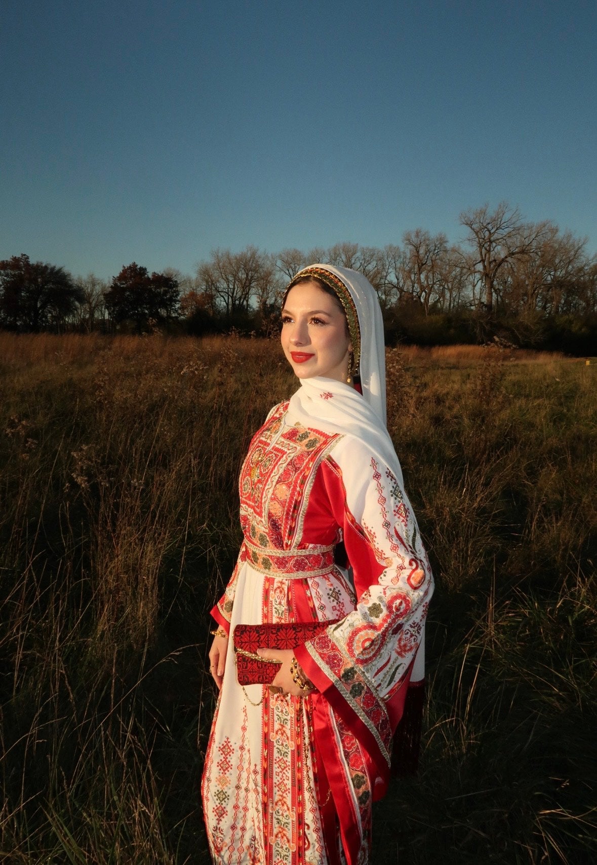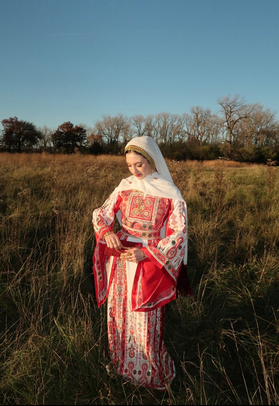 The Rose Thobe is adorned with delicate red Tatreez embroidery. This color palette brings a fresh, feminine touch to the traditional design, making it perfect for weddings or festive occasions. The intricate patterns celebrate heritage with a modern twist. The Taj Headpiece is sold separately.
