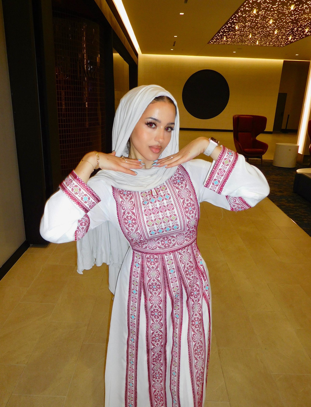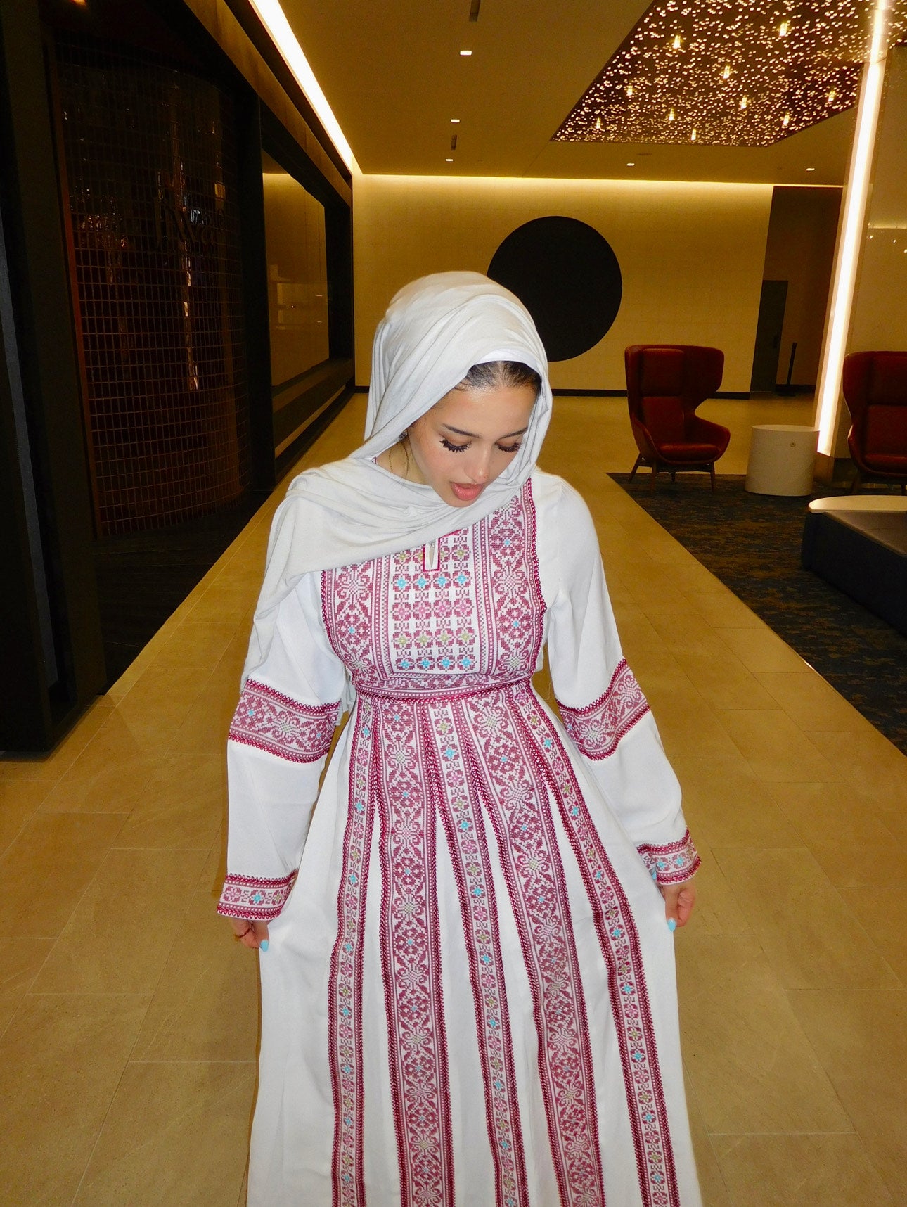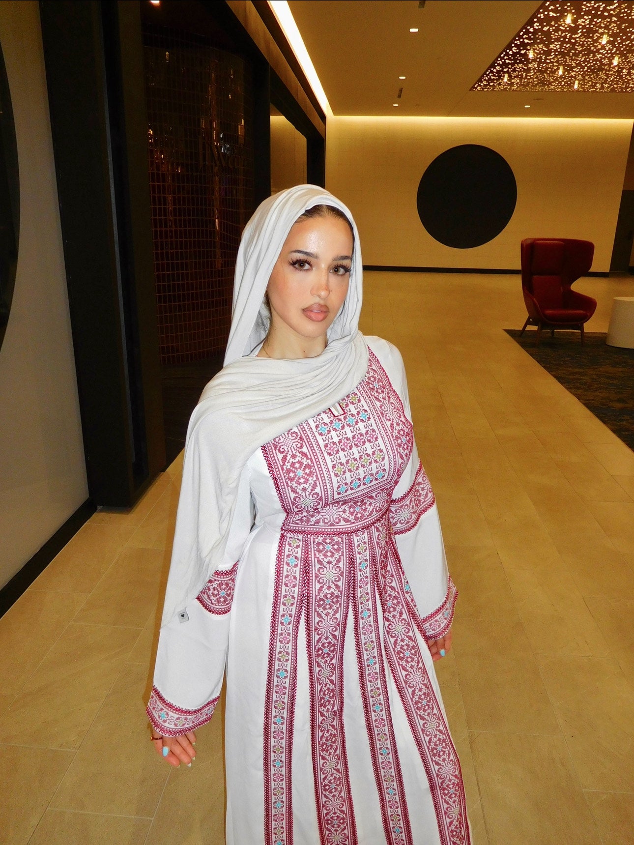 The Mona Thobe is adorned with delicate Tatreez embroidery. This delicate color palette brings a fresh, feminine touch to the traditional design, making it perfect for festive occasions or everyday elegance. The intricate patterns celebrate heritage with a modern twist. It comes with a matching belt.
