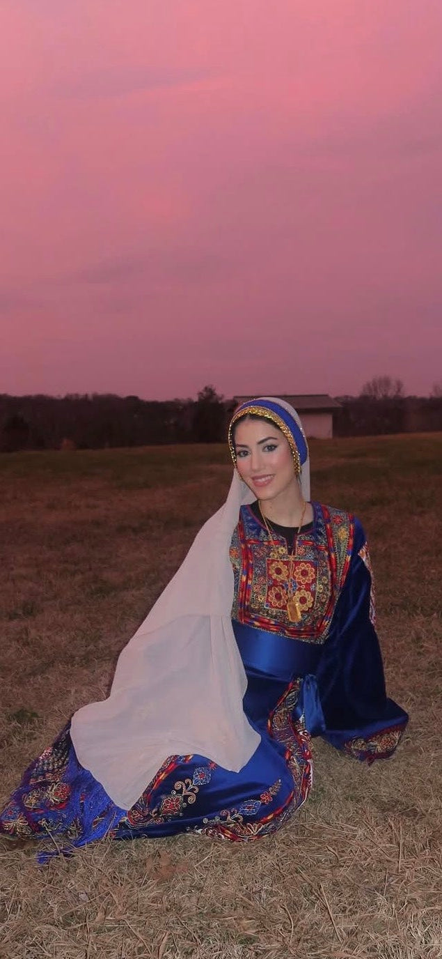 The Nada headpiece is a handmade stunning blue velvet headpiece with a veil and replica coins, adding a touch of elegance and tradition to any look. It pairs beautifully with all our thobes.