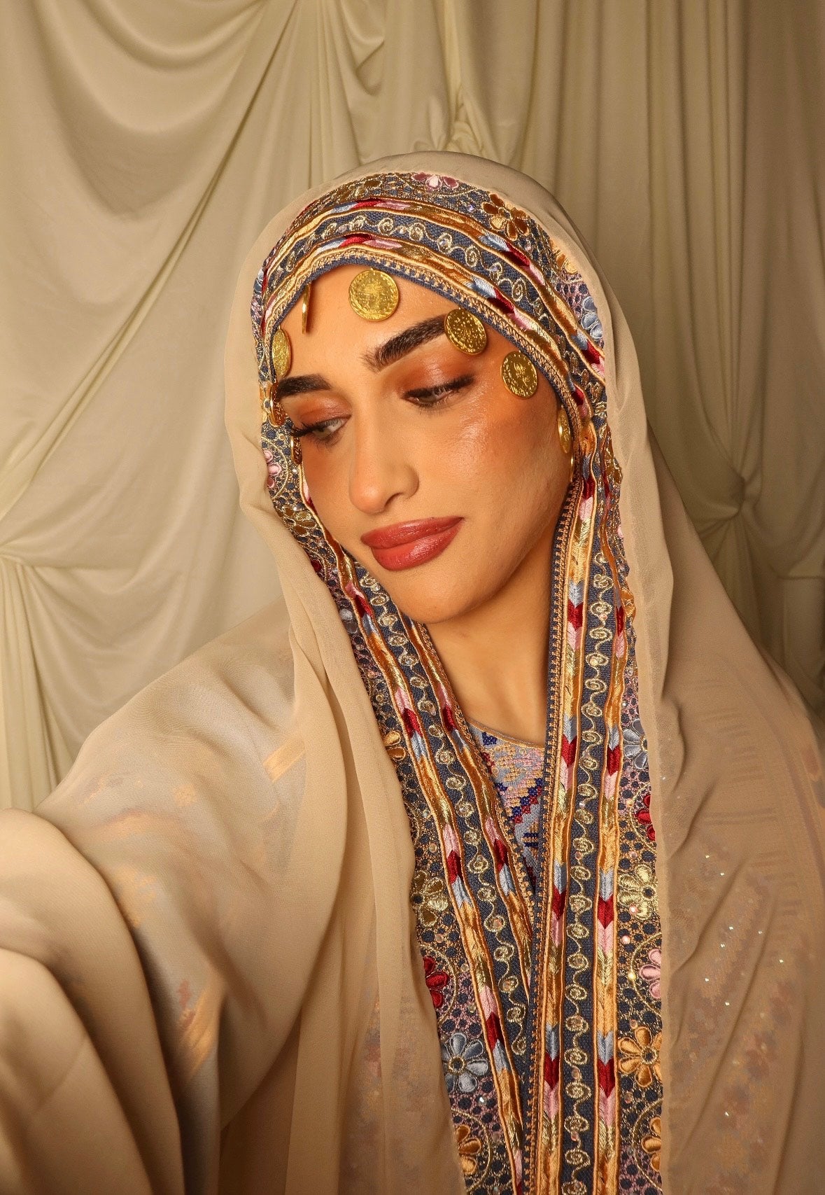 The Mona Headpiece features exquisite replica coins that bring a touch of elegance and tradition to any outfit. Designed to pair beautifully with all our thobes this piece completes your look with timeless charm.