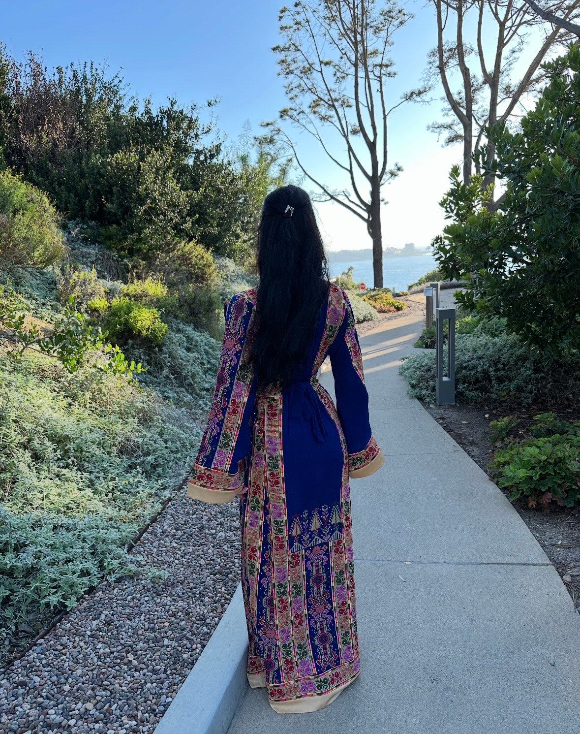 • Royal Blue thobe with pink, red and gold tatreez embroidery