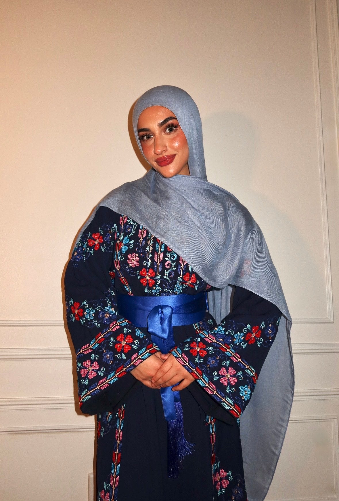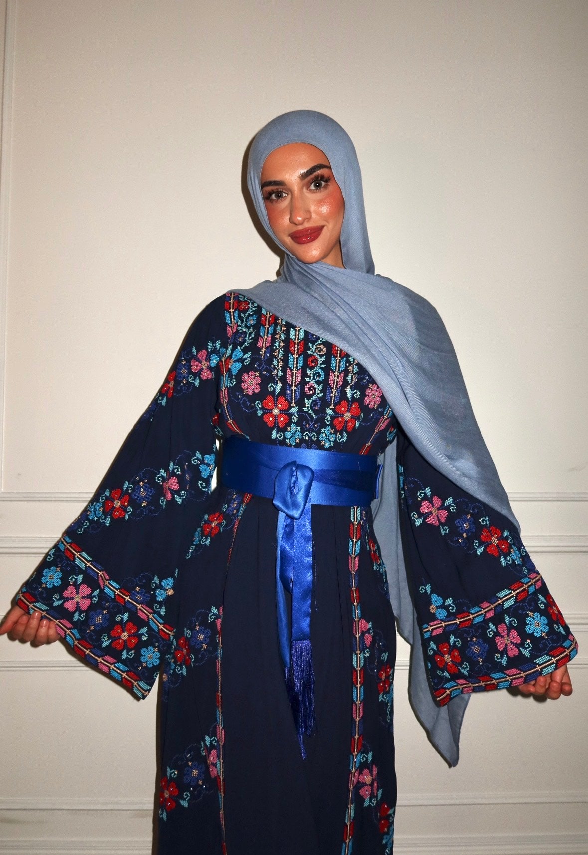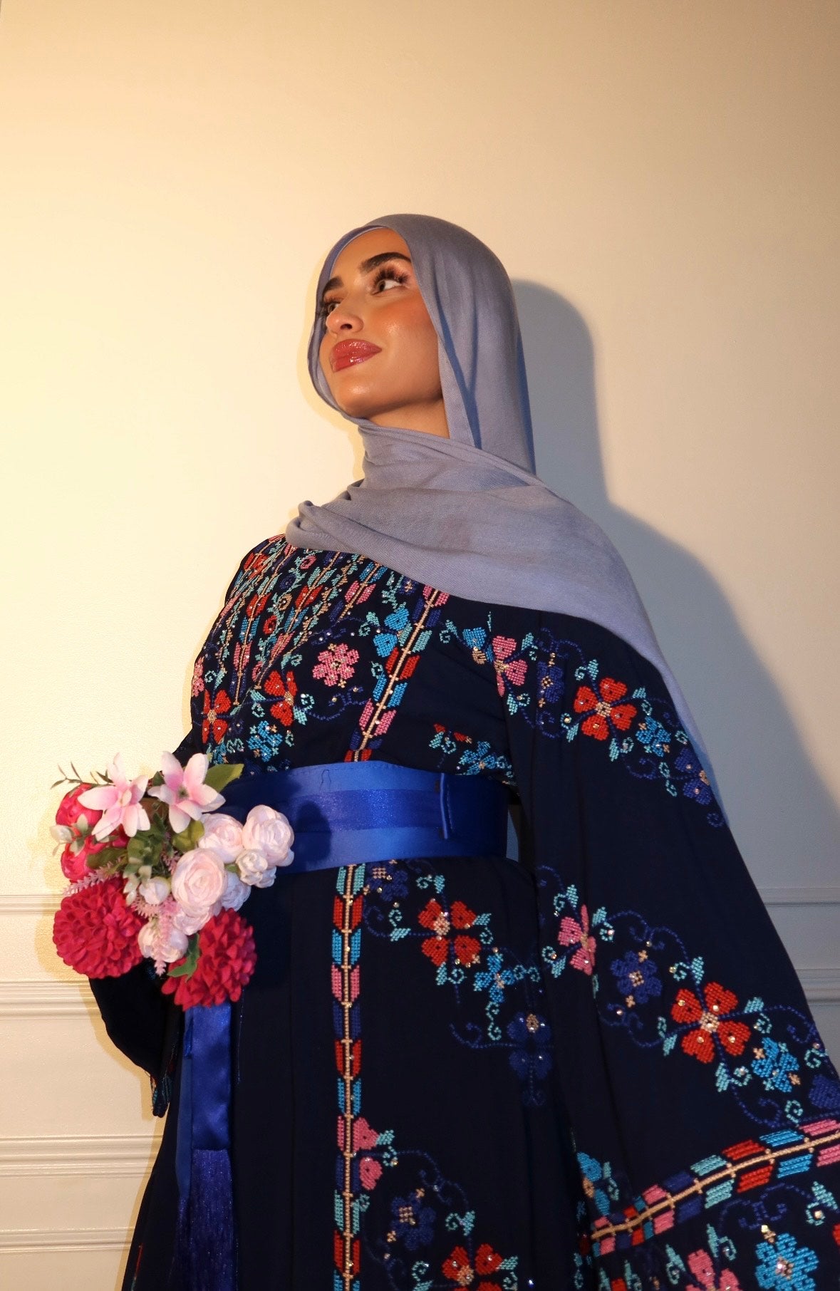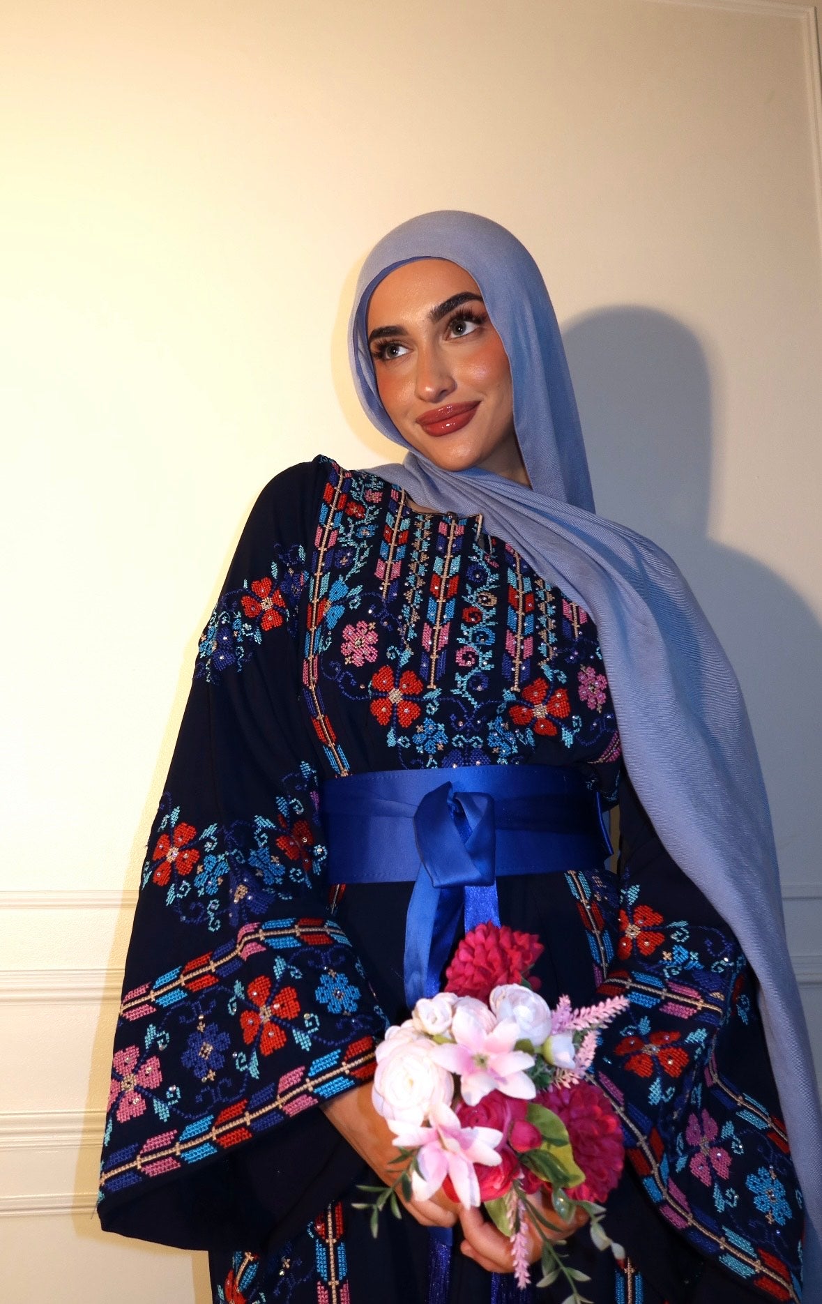 The Rania Thobe is a navy thobe with a pink, turquoise, gold and red tatreez Palestinian pattern which blends traditional and vibrant elements creating a visually stunning contrast. "Nada" belt sold separately