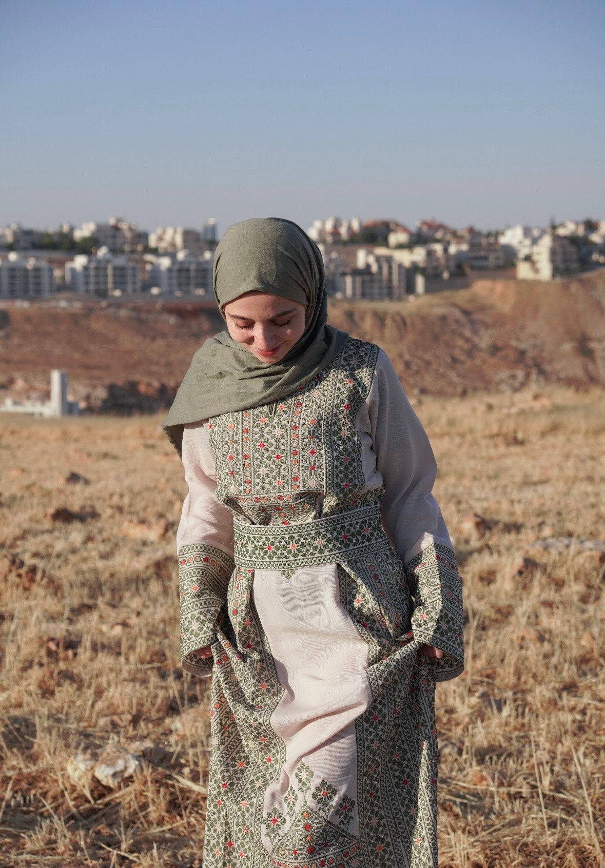 • Embroidered tatreez motifs inspired by ancient Palestinian patterns.