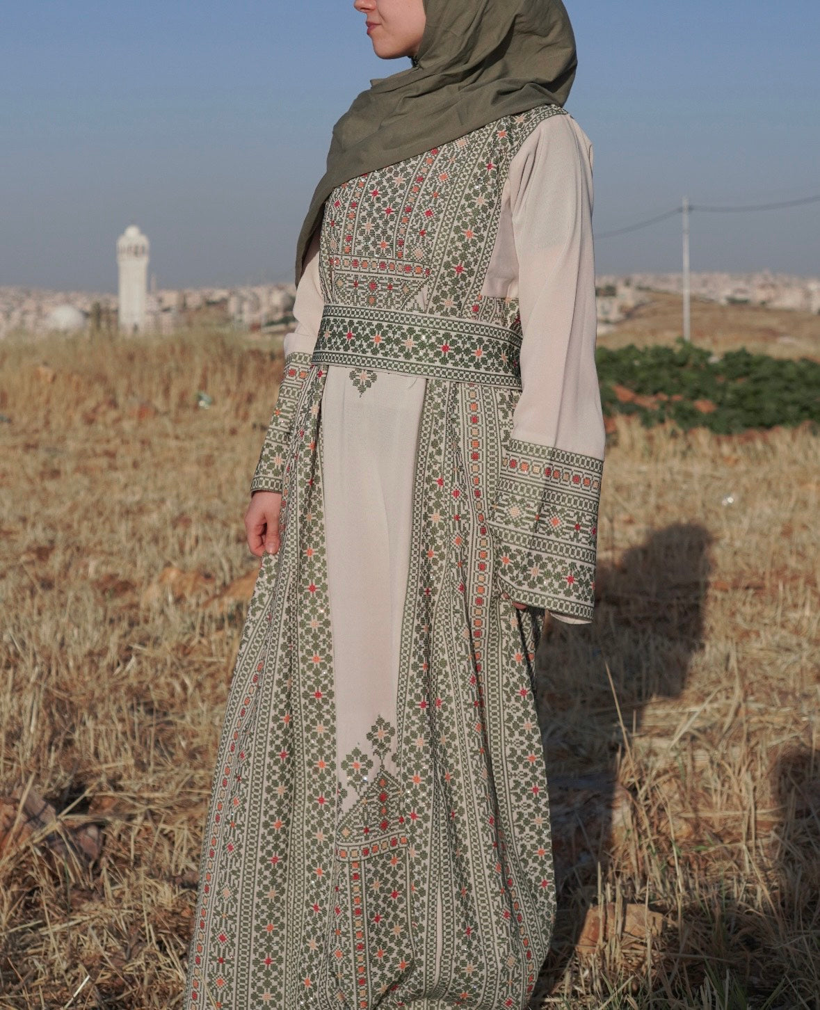 The Hajar Thobe is a traditional Palestinian garment adorned with intricate tatreez embroidery in beige, green and orange. It reflects a rich cultural heritage, with each pattern symbolizing identity and history. More than just clothing, it serves as a living testament to Palestinian resilience, pride, and artistic legacy. The matching belt is included in the price.