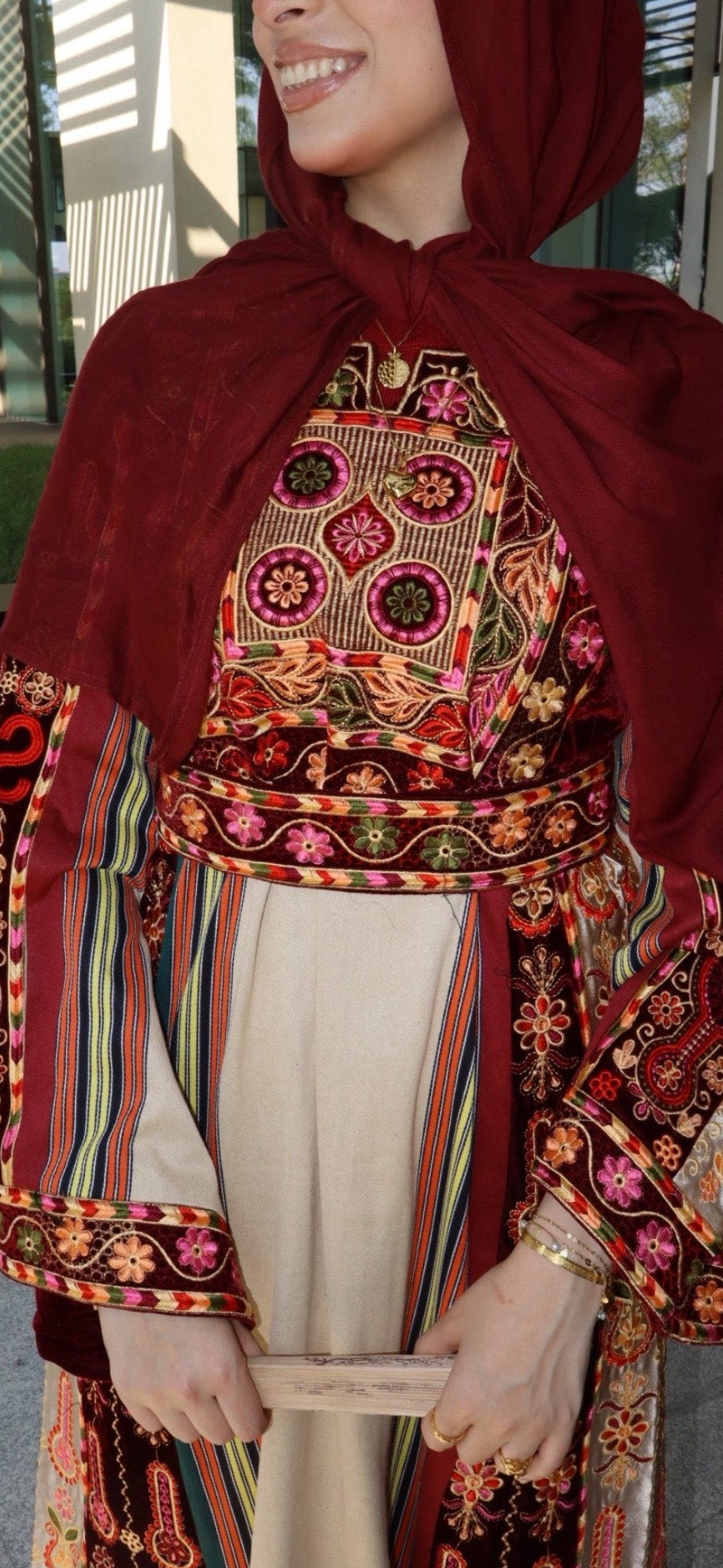 • Embroidered tatreez motifs inspired by ancient Palestinian patterns.