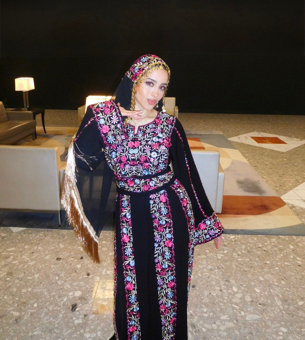 • Embroidered tatreez motifs inspired by ancient Palestinian patterns.