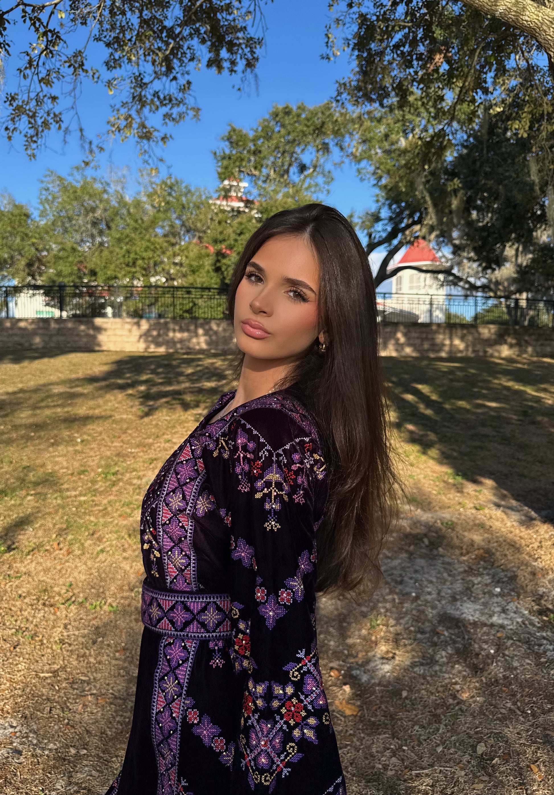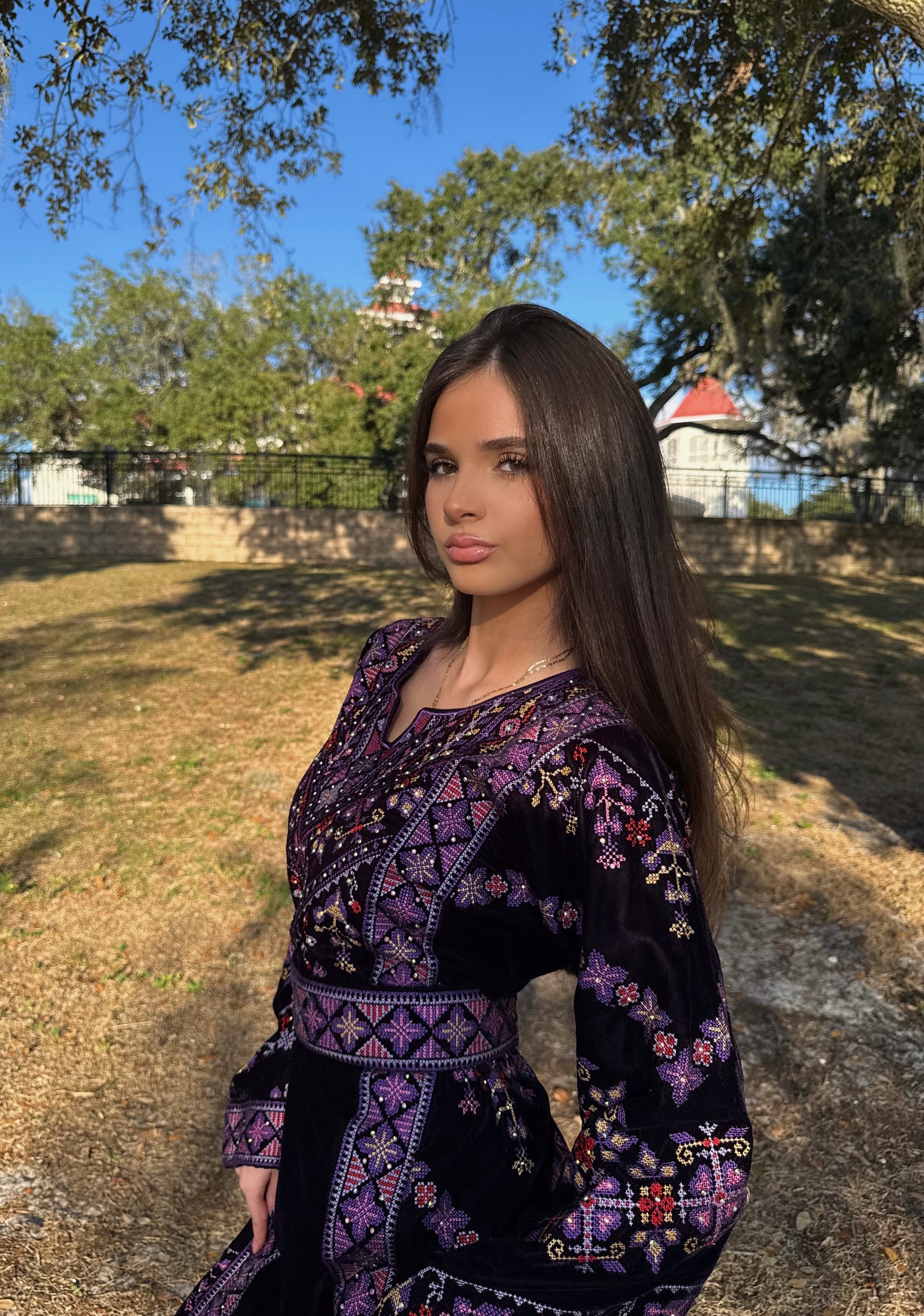 The "Linda" thobe is a beautiful velvet black thoub with purple embroidery throught.