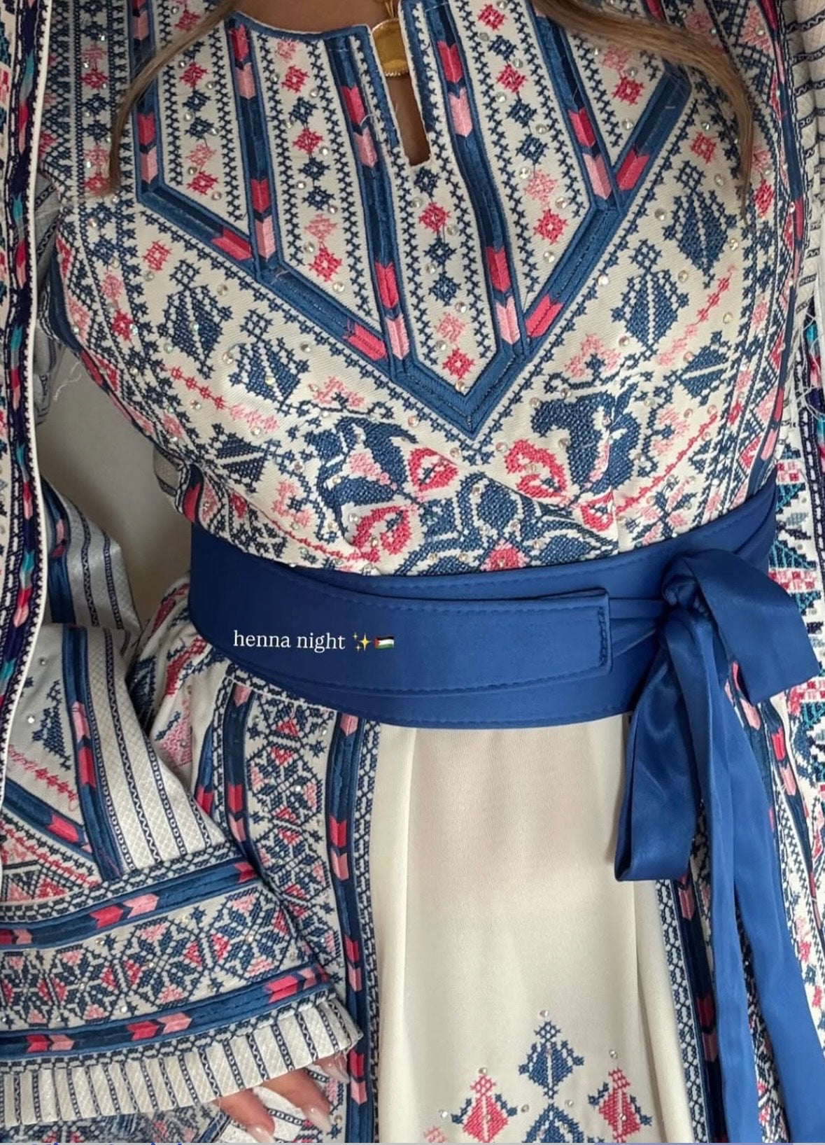 • The Riba Thobe is a off white thobe with blue and pink tatreez detail.