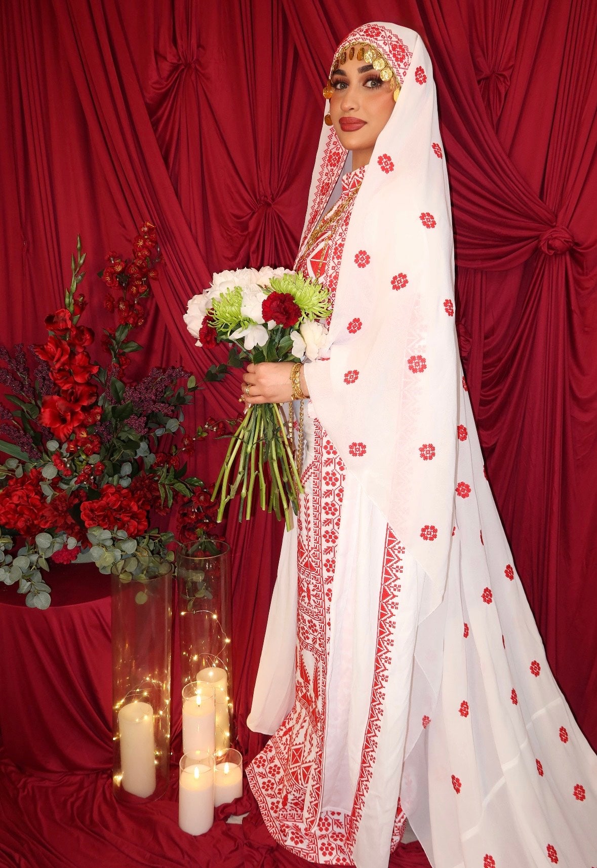 • White and red with floral tatreez design with replica gold coins on the headpiece.