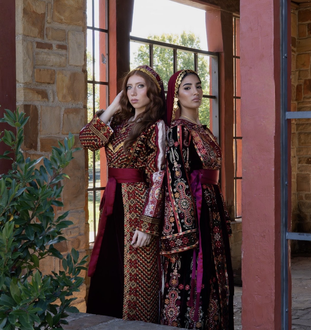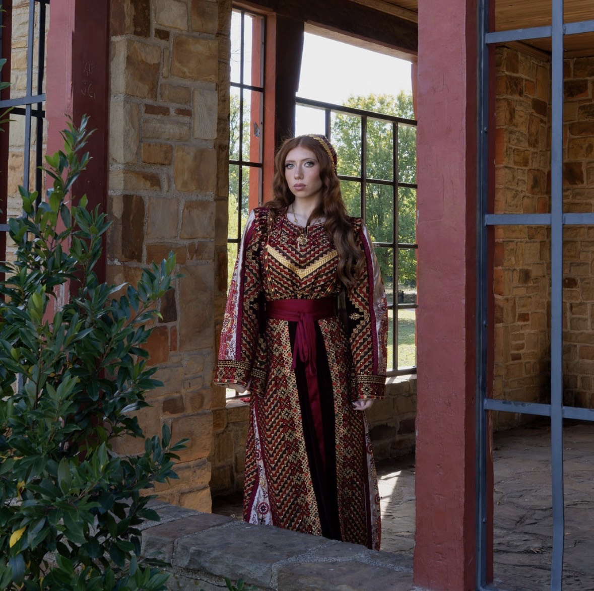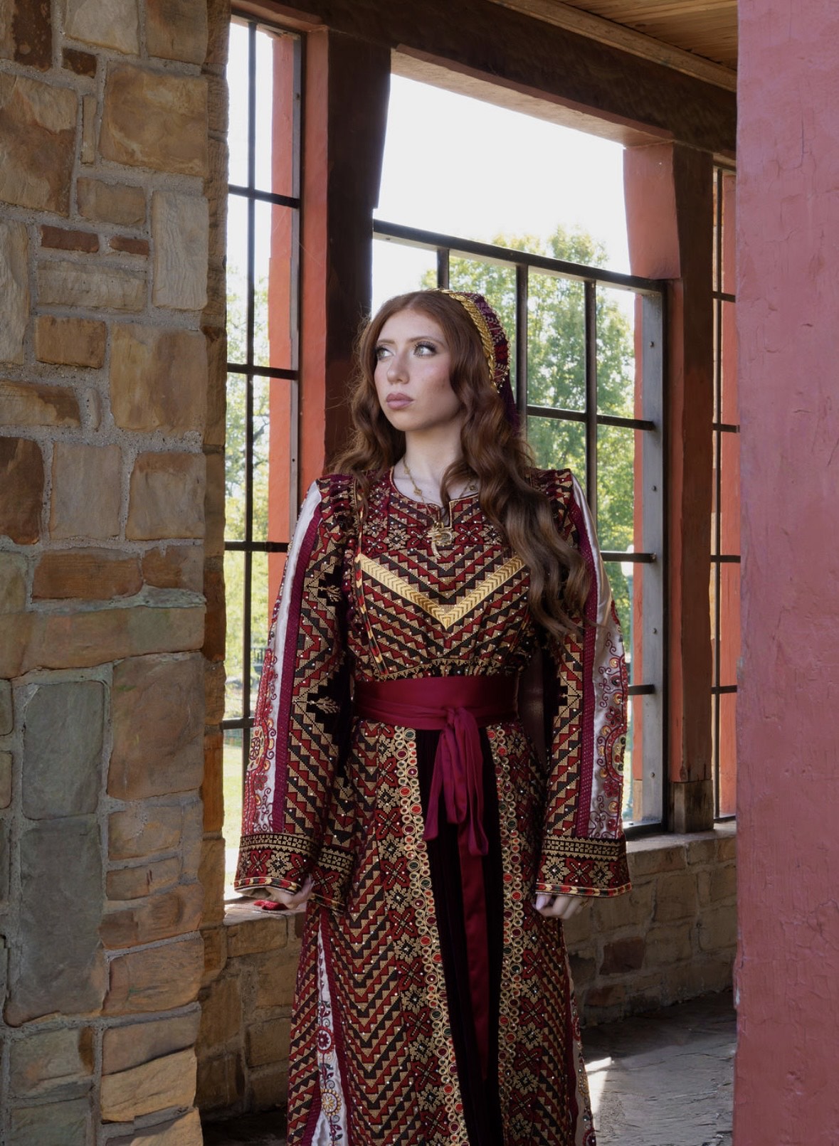 The Sabayal Thobe is an intricate blend of burgundy, red, gold and green tatreez embroidery which reflects the rich cultural heritage of Palestinian craftmanship. Completing the ensemble is a matching belt adding both structure and elegance to the garment. The Sabayal Headpiece can be brought separately.