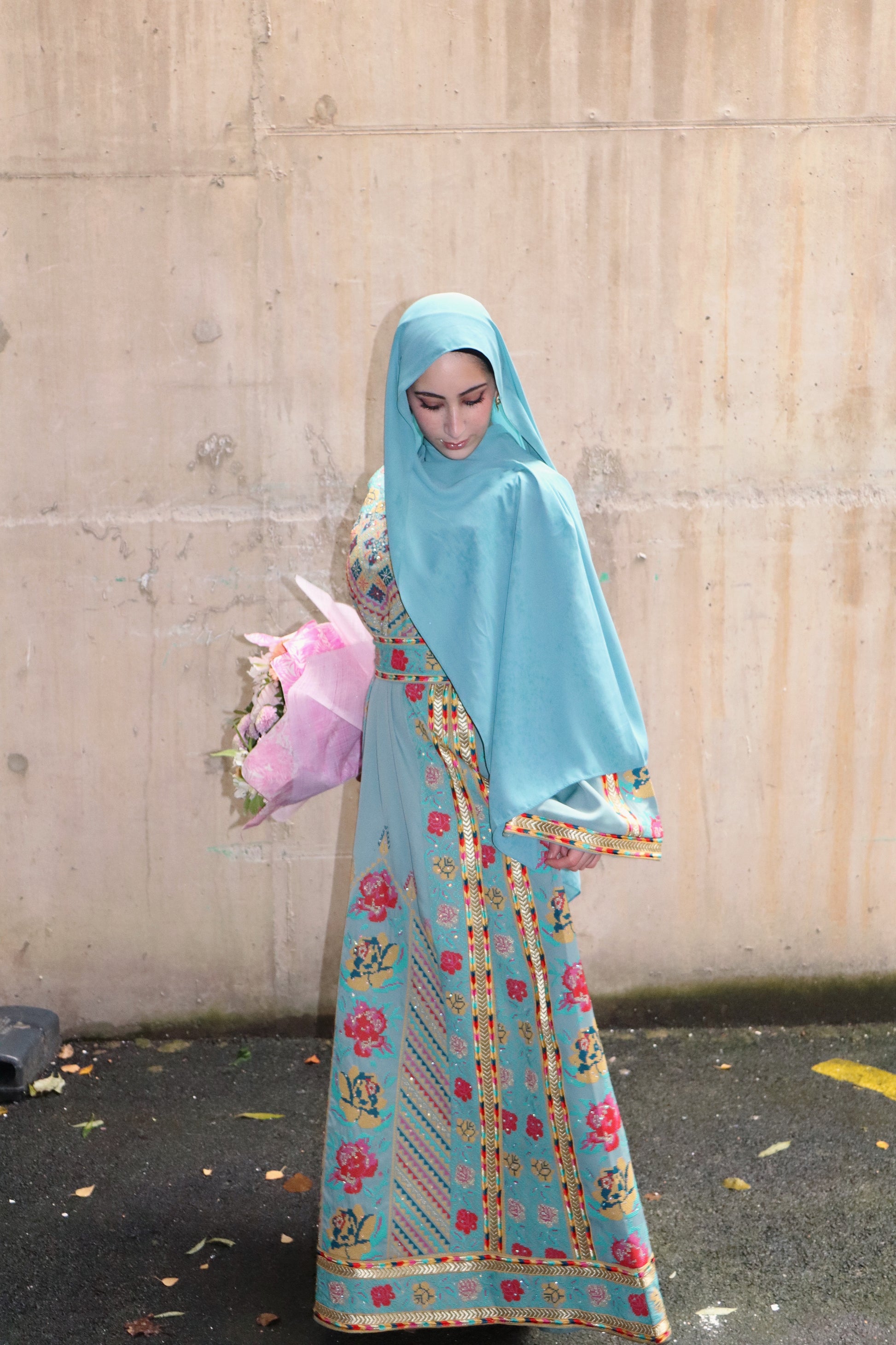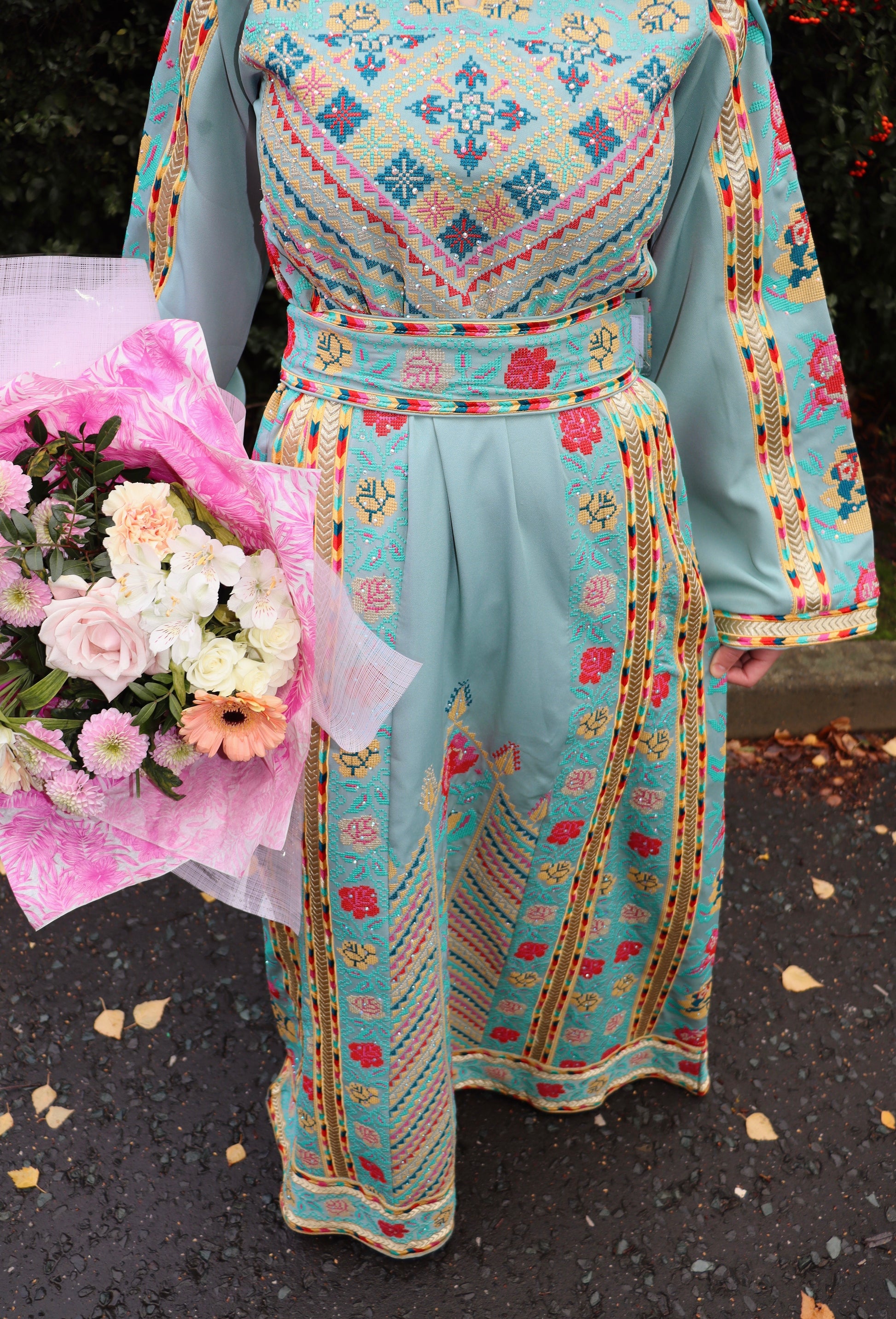 The Samia thobe is a beautiful turquoise thobe with floral embroidery.