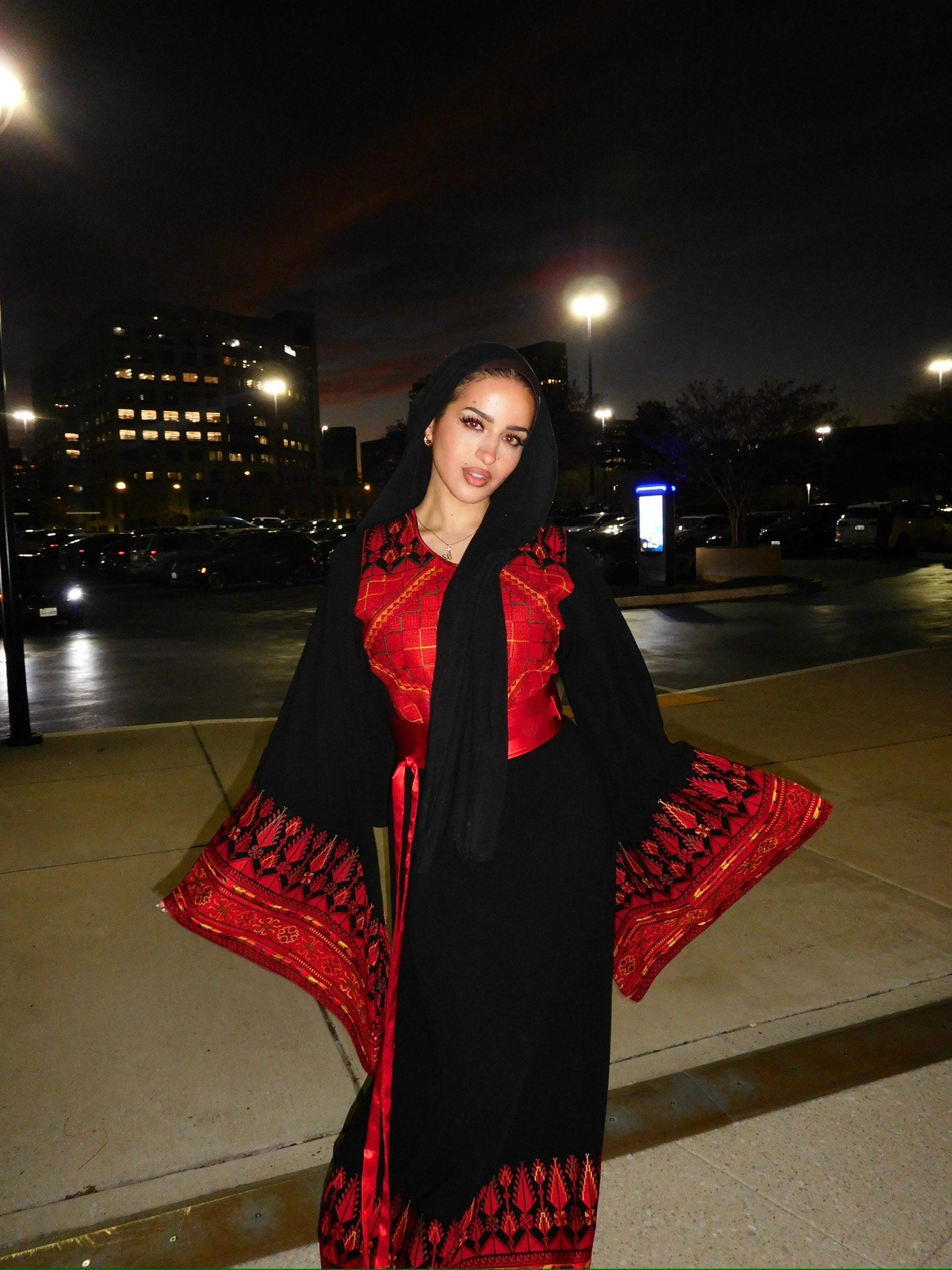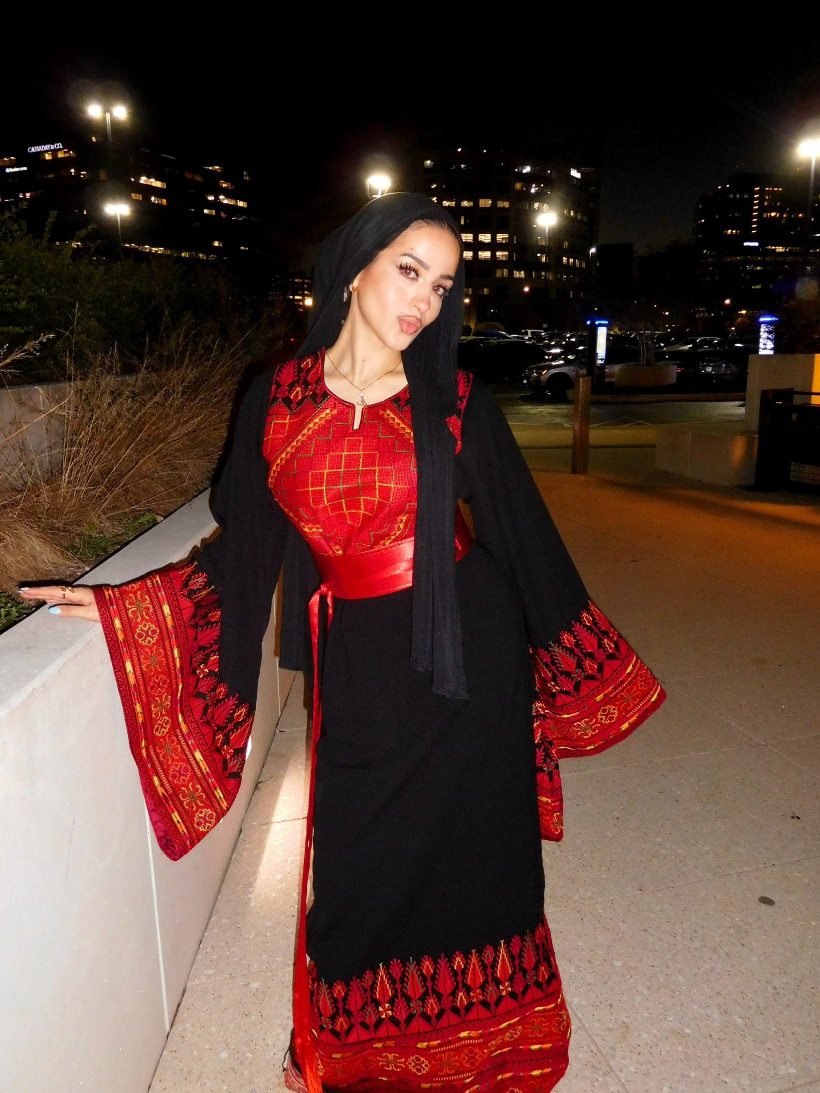 • The Sana Thobe is black with beautiful bold red tatreez design.