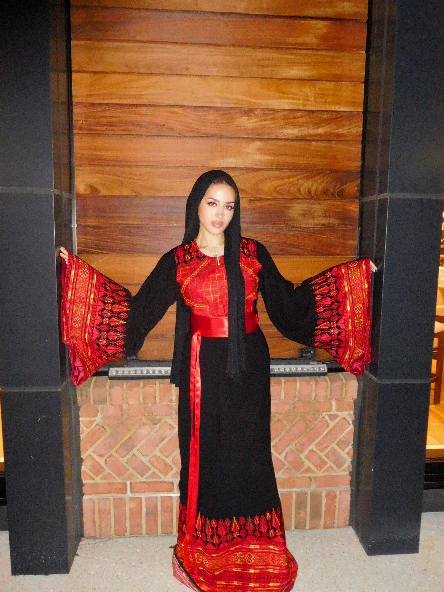 • Embroidered tatreez motifs inspired by ancient Palestinian patterns.