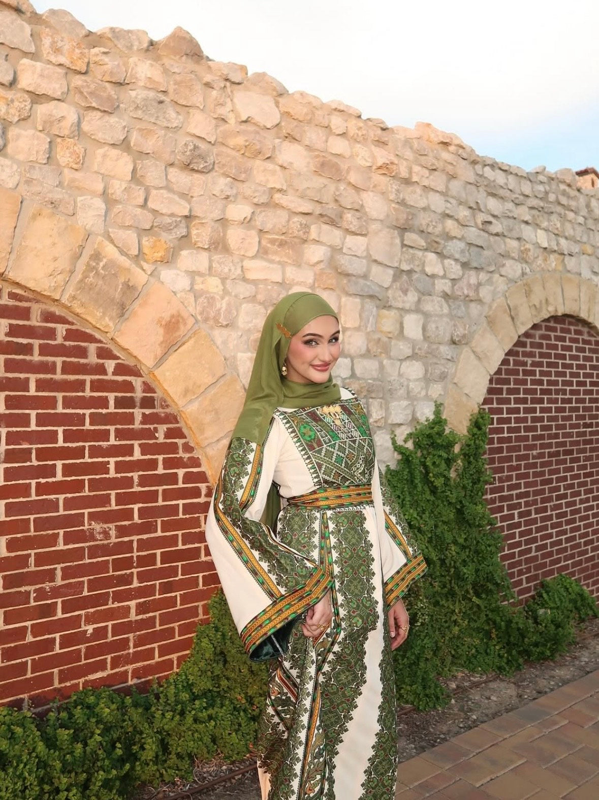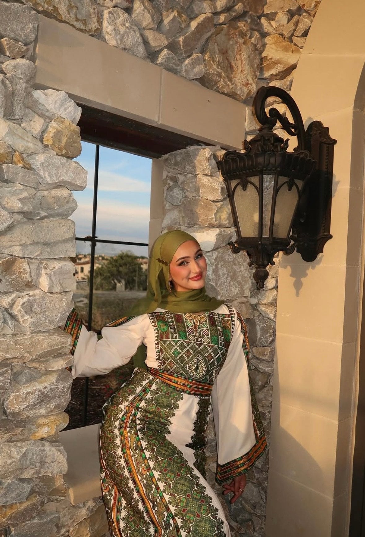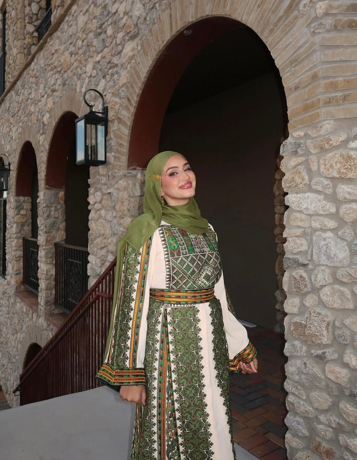 • Embroidered tatreez motifs inspired by ancient Palestinian patterns.