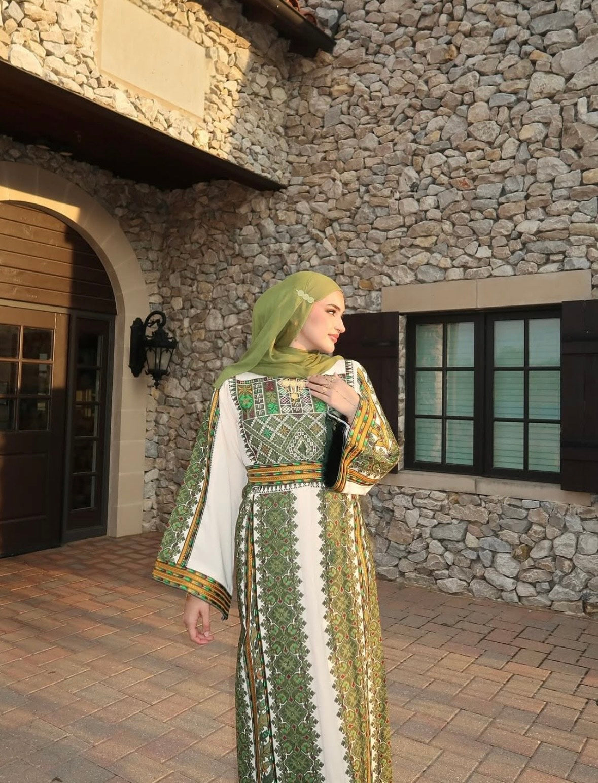 The beautiful Siham thobe is an a stunning off-white dress, embroidered through out with Green Tatreez and Gold and red detailing's. It's beautiful quality and comfortability is guaranteed to ensure you feel beautiful and modest wherever you go. Includes matching belt.