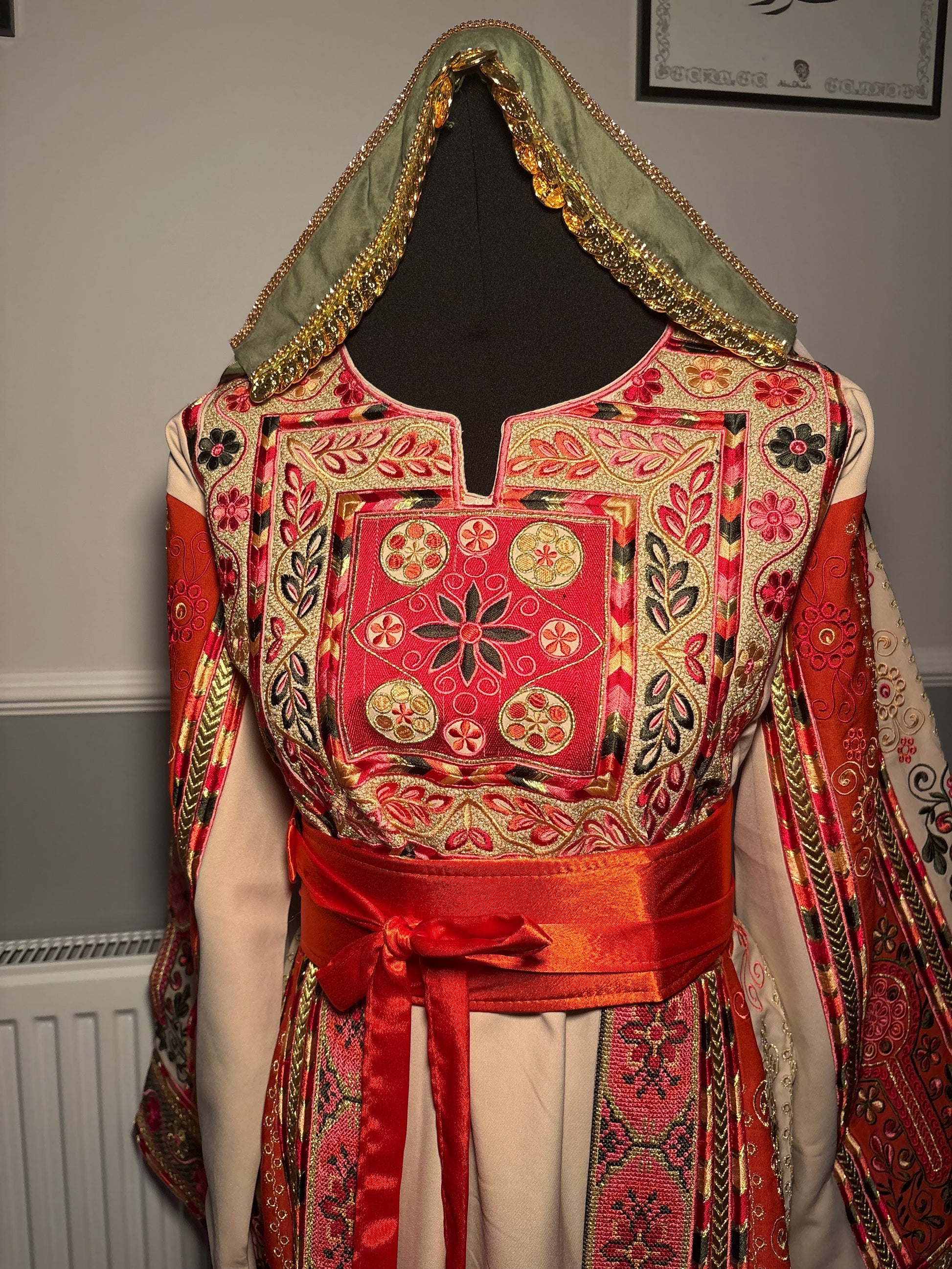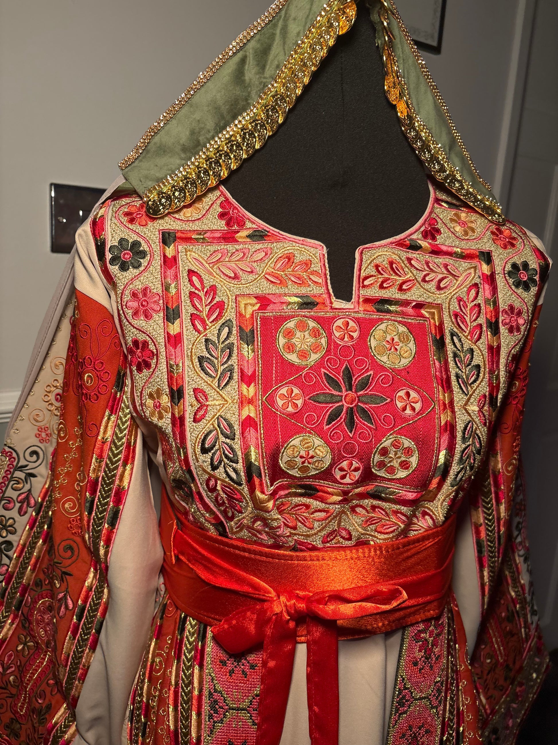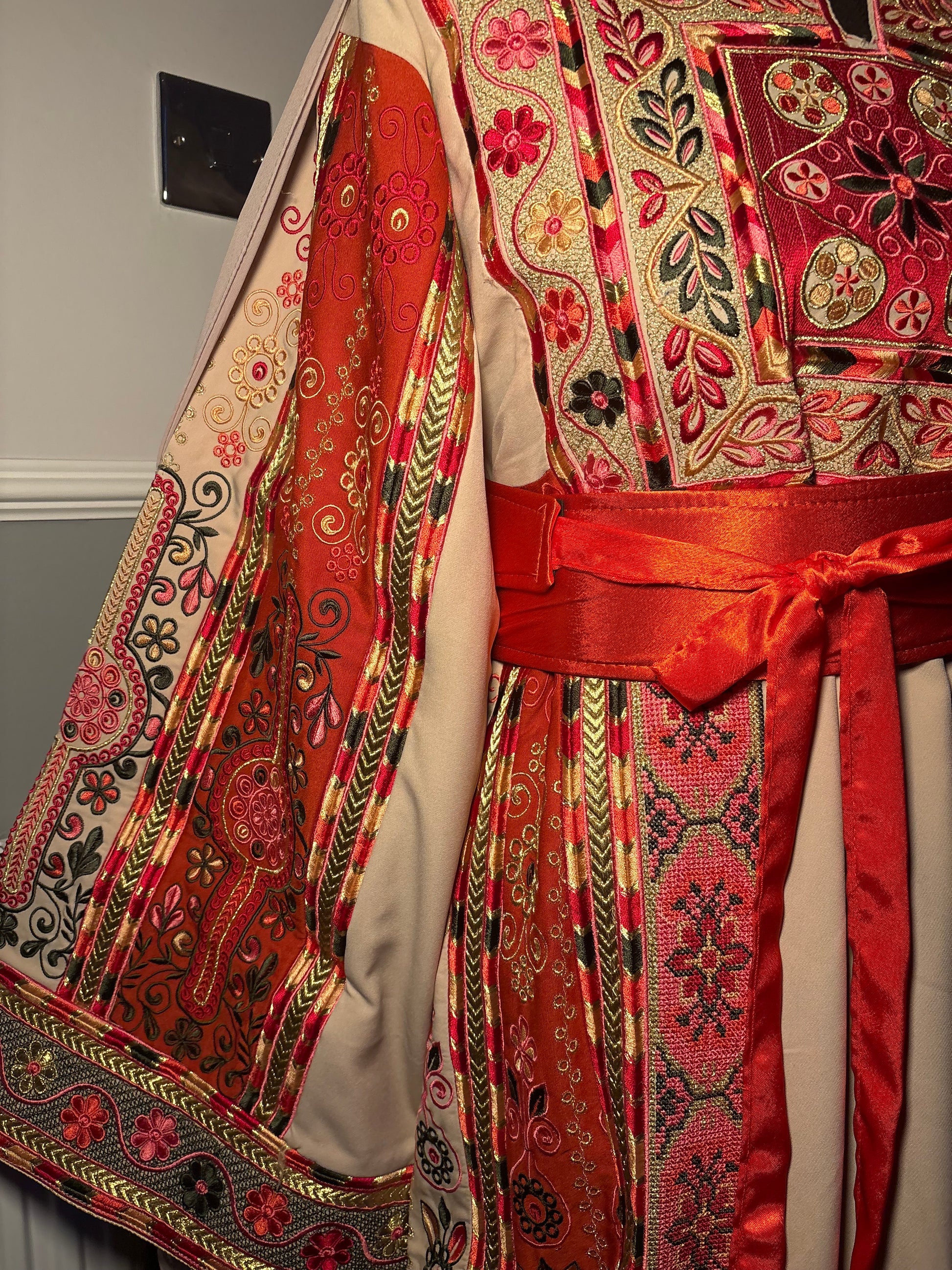 • Beige Thobe with red, orange, pink and gold tatreez design.