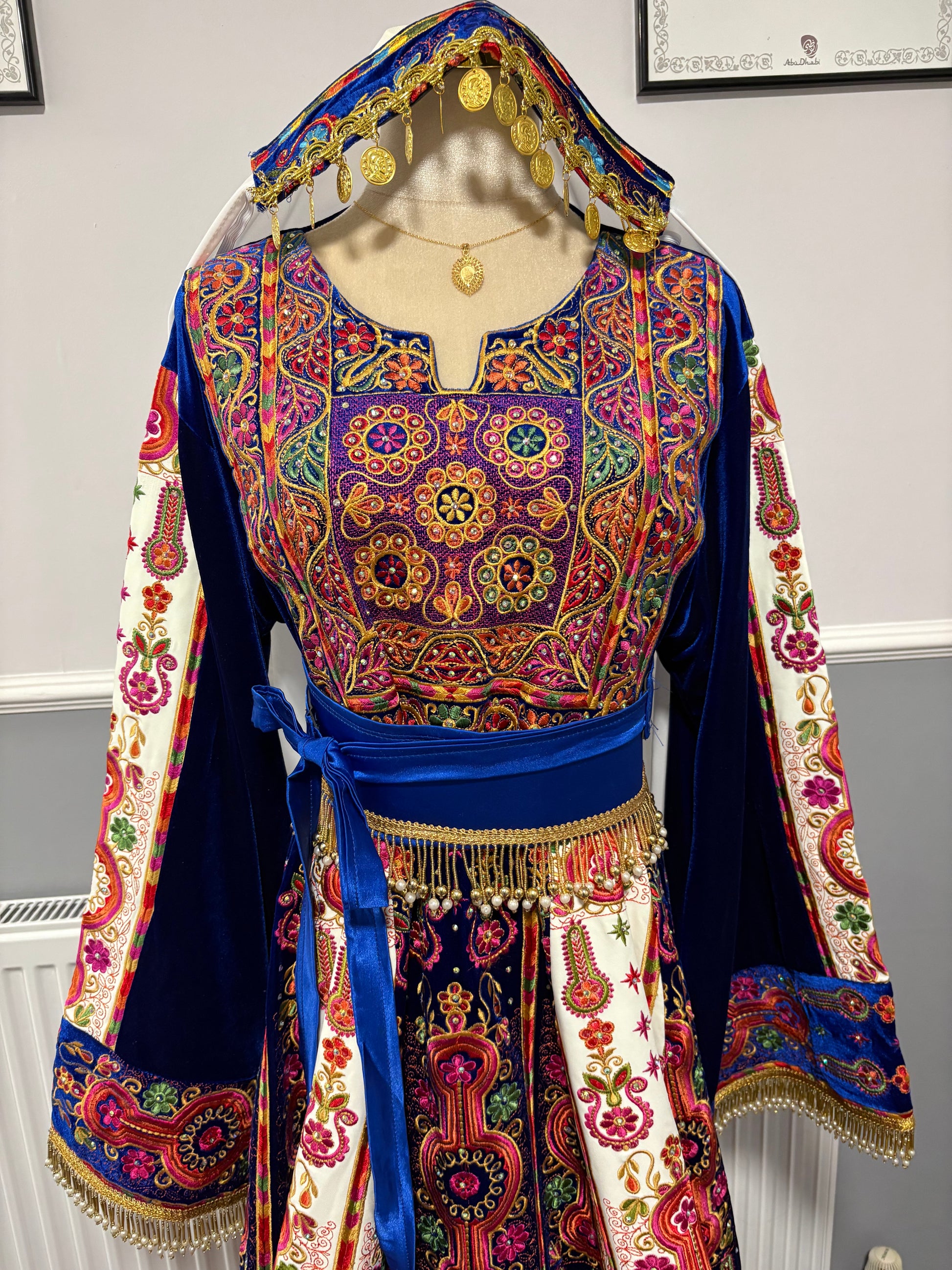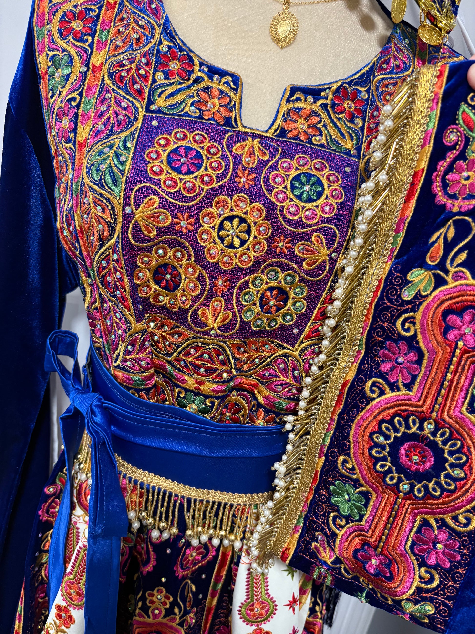 The Yara Thobe is adorned with orange, green, white, pink, purple and red Tatreez embroidery. This bold color palette brings a fresh, feminine touch to the traditional design, making it perfect for weddings or festive occasions. The intricate patterns celebrate heritage with a modern twist. The headpiece and belt are included with the thobe.