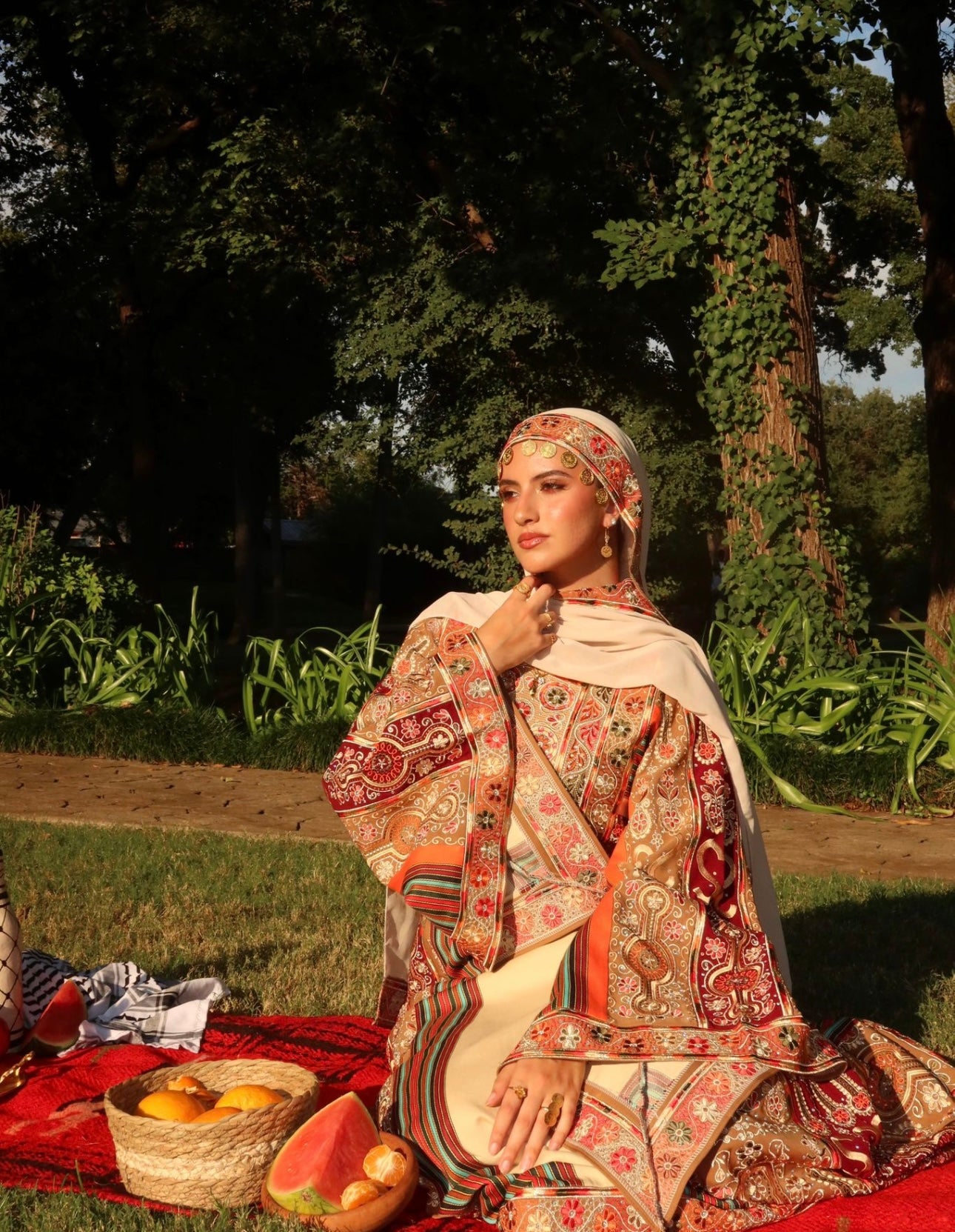 The Zakia Thobe is a beautifully crafted traditional Palestinian garment which is adorned with intricate tatreez embroidery in vibrant shades of orange, red, turquoise, green and brown. This detailed pattern showcases the rich cultural heritage of Palestinian craftsmanship. The combination of traditional motifs and bold, lively colors makes the Zakia Thobe a unique and elegant piece, celebrating both history and modern artistic expression. The Zakia Thobe comes with a matching belt. The Zakia headpiece can be bought separately.