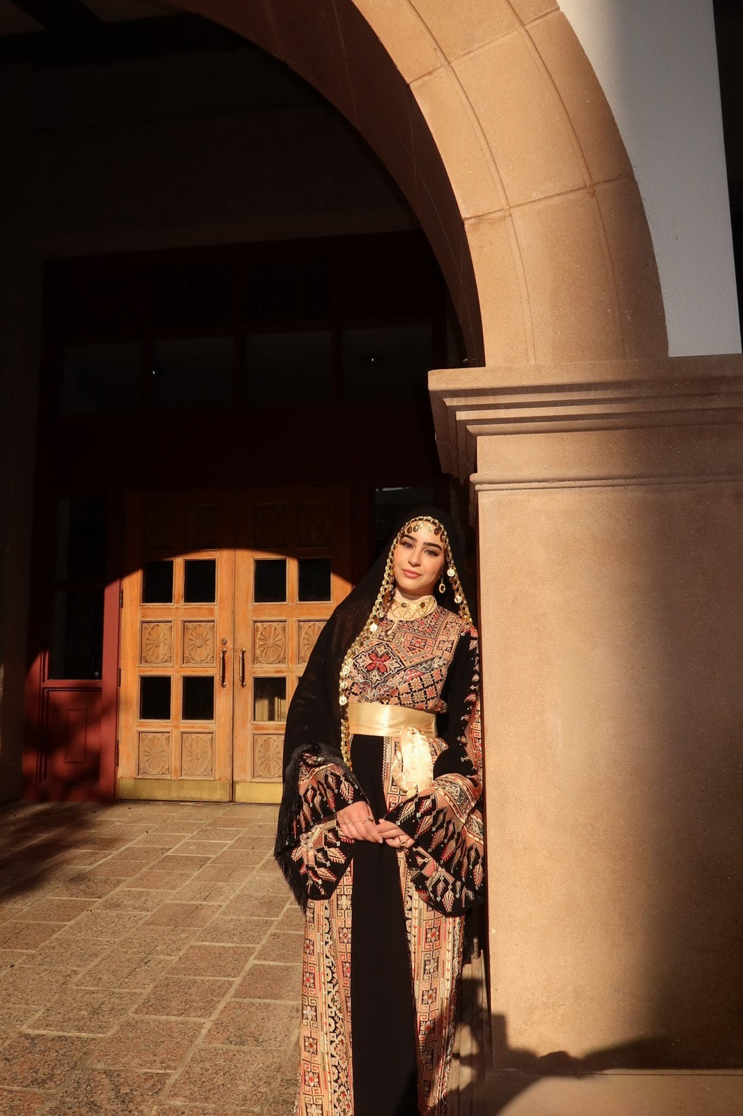 • Embroidered tatreez motifs inspired by ancient Palestinian patterns.